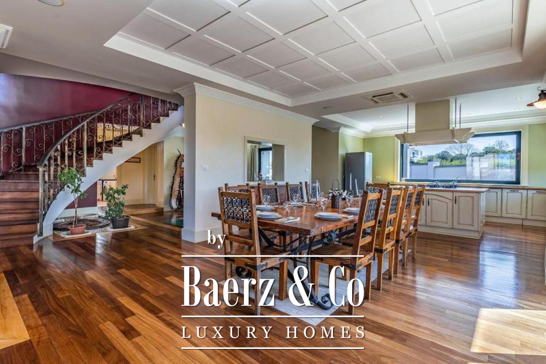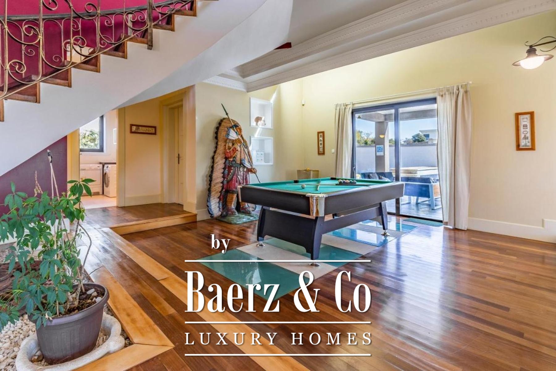 Tall glazed doors invite the landscape into each room and lead to a terrace overlooking a 60 m² swimming pool, with manicured gardens enveloping the 900 m² plot. The upper floor introduces three additional bedrooms, one with en suite bath, all opening onto a generous terrace. A dedicated recreation space fosters an elevated pace of life.