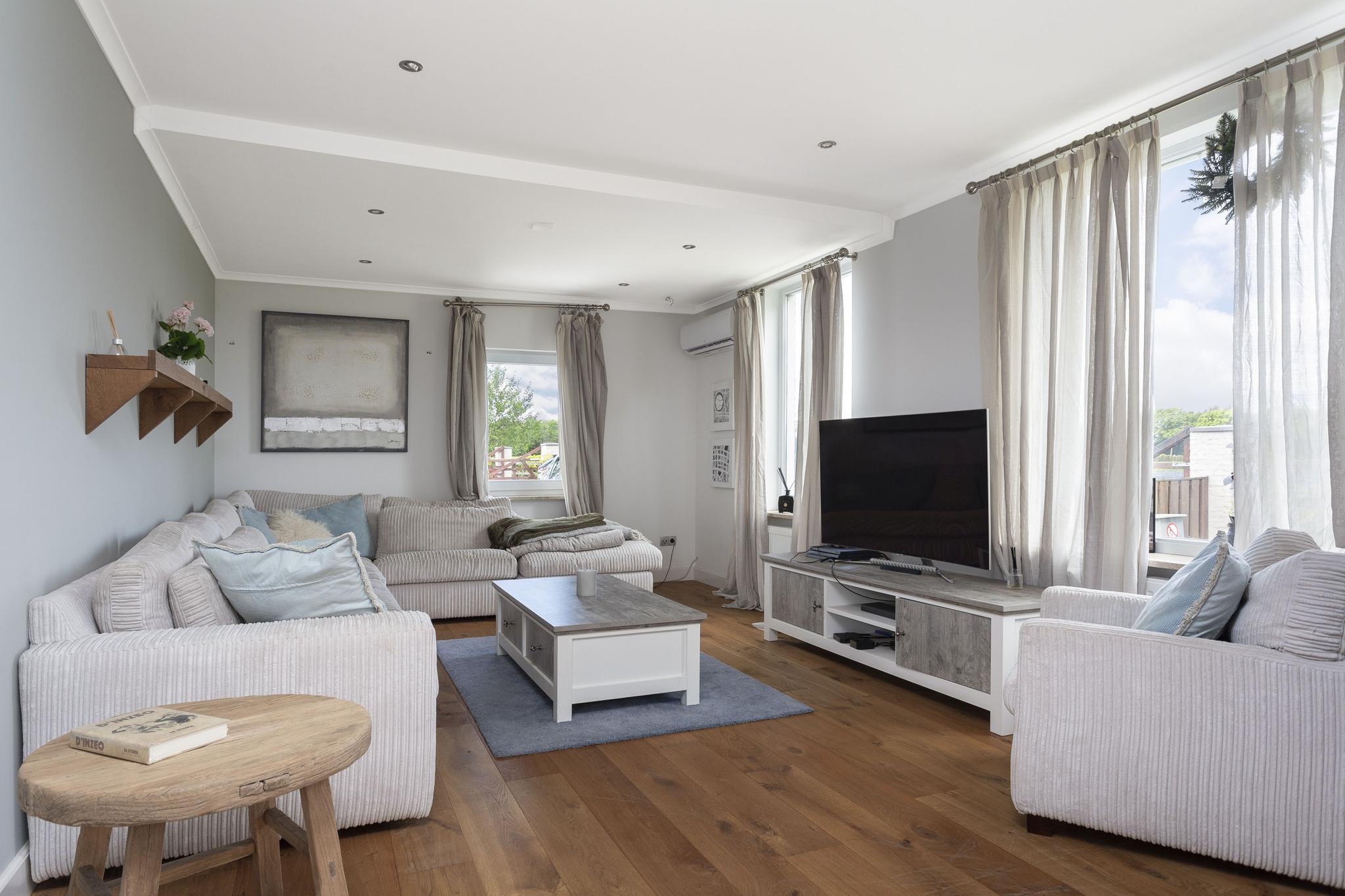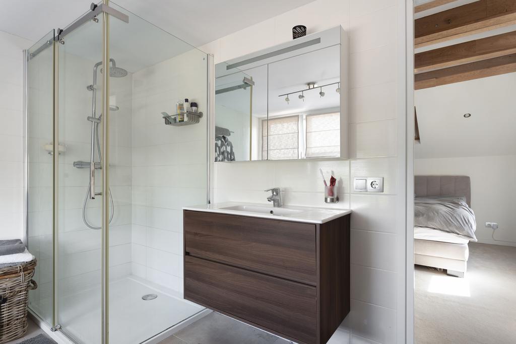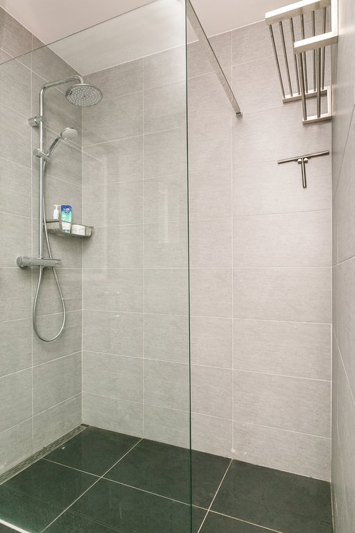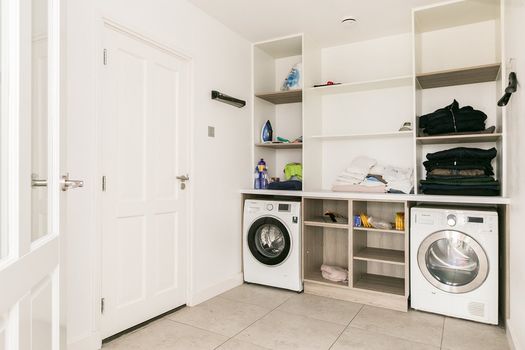 The utility room is finished with a tiled floor, stucco walls, stucco ceiling and equipped with connections for washing appliances. The utility room provides access to the living kitchen, the toilet room and the shower room. The fully tiled toilet room is equipped with a floating toilet, natural ventilation and the installation of the central heating boiler, which is nicely concealed. The shower room is fully tiled and has a stucco ceiling. The shower room has a walk-in shower, a fixed washbasin in bathroom unit and a design radiator.