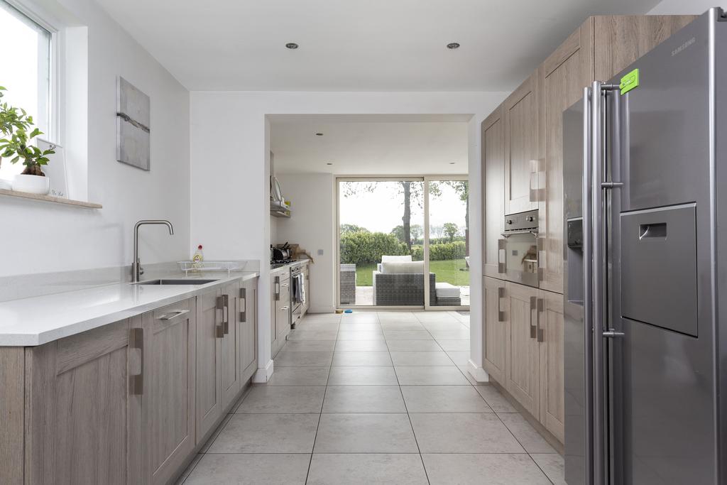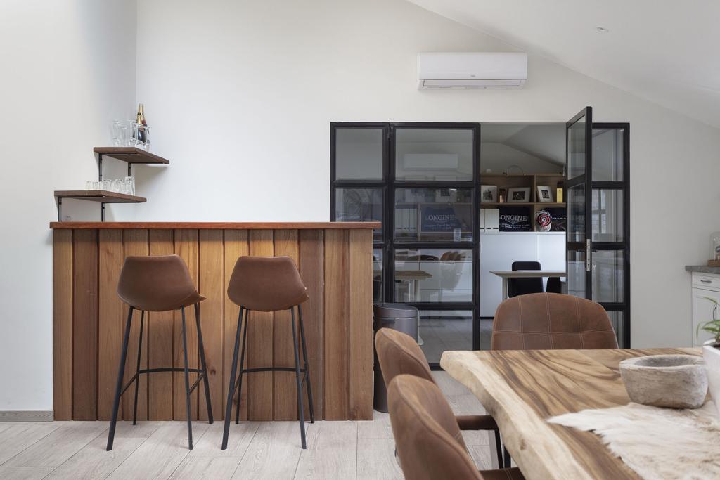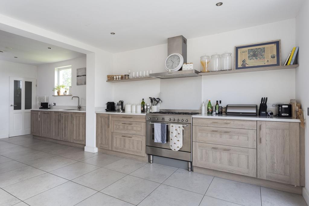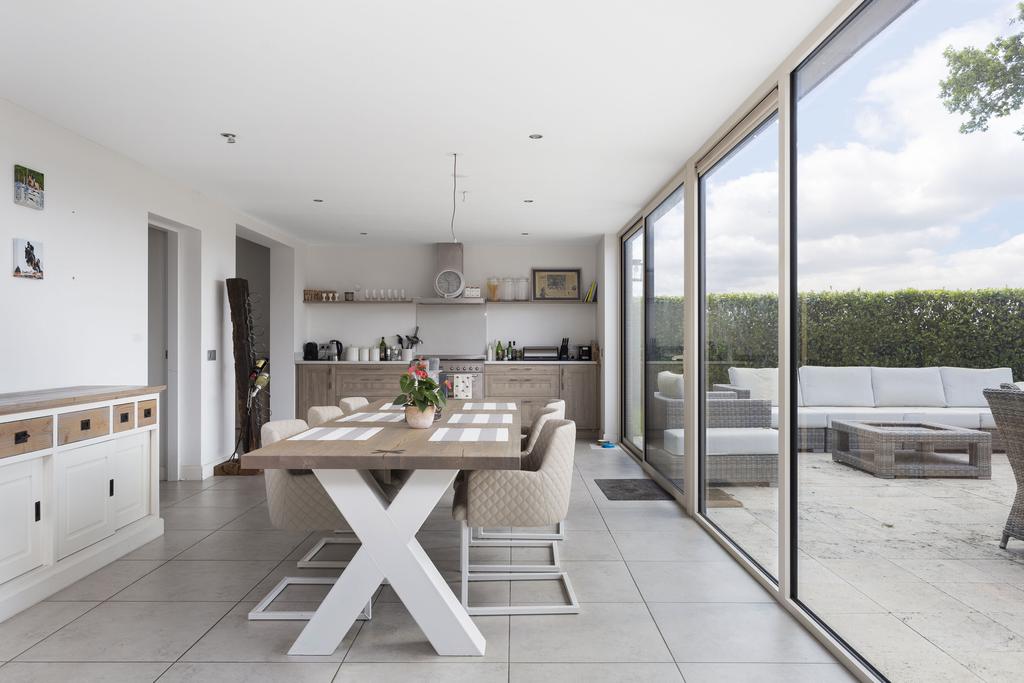 The kitchen enjoys plenty of light through the large windows and sliding doors across the entire rear façade. A wicket door provides direct access to the garden.