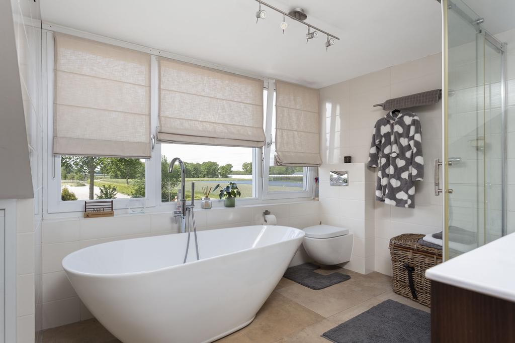 The ensuite bathroom is fully tiled and equipped with a freestanding bathtub, a separate shower, a floating toilet and a sink in storage unit.