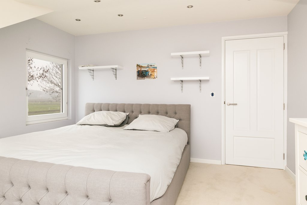 French doors connect the living kitchen to the bedroom, situated in the former garage. This bedroom is finished with an oak floor, stucco walls and a stucco ceiling with built-in LED lighting. A large window in the front facade provides plenty of light and a wicket door provides access to the rear garden. A storage attic is located above part of the bedroom.