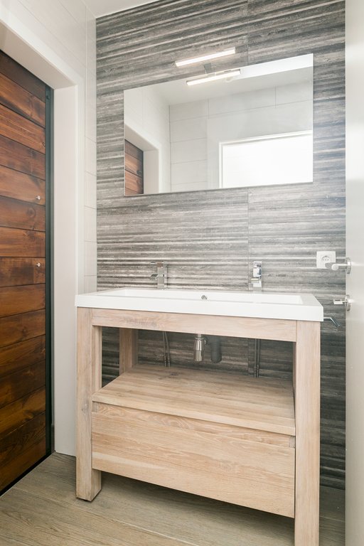 The washing and grooming areas have a rubber floor and partly tiled and partly rubber walls. There is also a separate energy-efficient boiler here.
