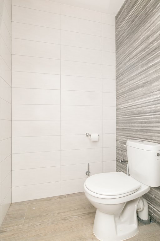 The fully tiled toilet room is equipped with a toilet and double washbasin.