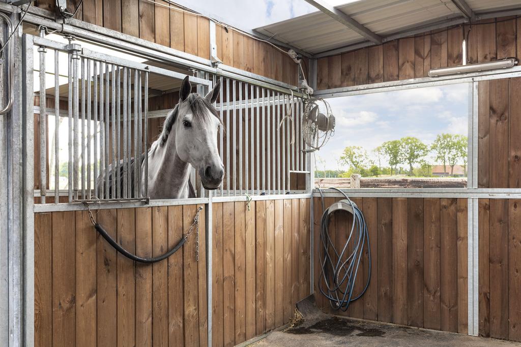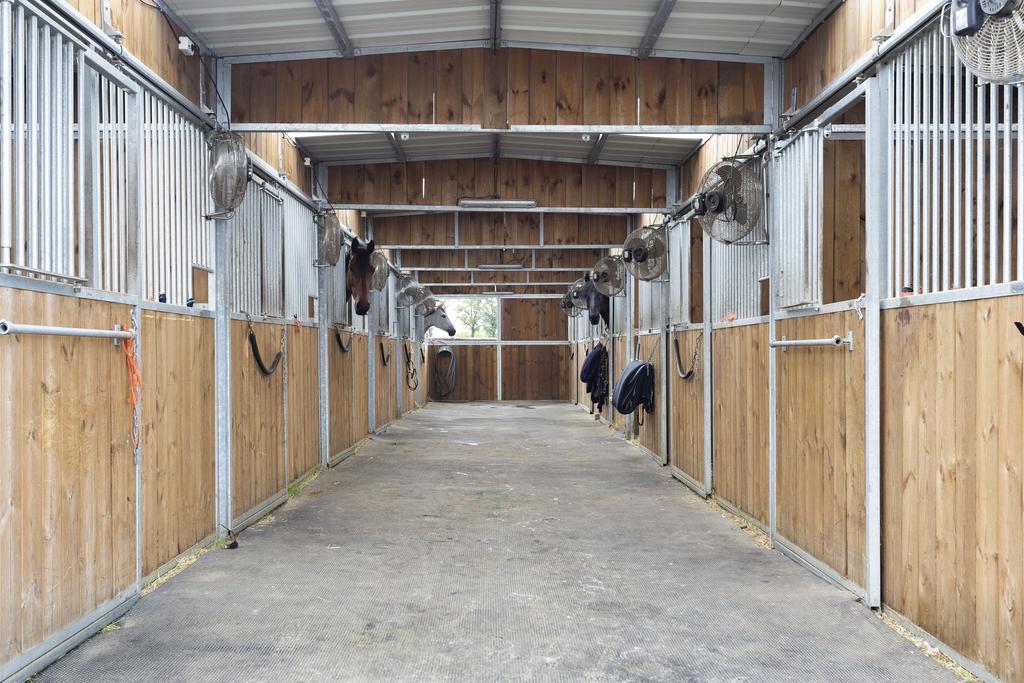 This section is equipped with 7 horse stalls. These horse boxes (approx. 3.5 x 3.5 metres), are all equipped with partly bamboo and partly galvanised front and partition walls, sliding doors and the rear walls are covered with rubber. The tack room is finished with a tiled floor, stucco walls, a stucco ceiling and fixed cupboard space. At the rear of the stalls is a storage area, which is accessible from the yard through French doors in the side wall. The storage area is finished with a concrete floor.
