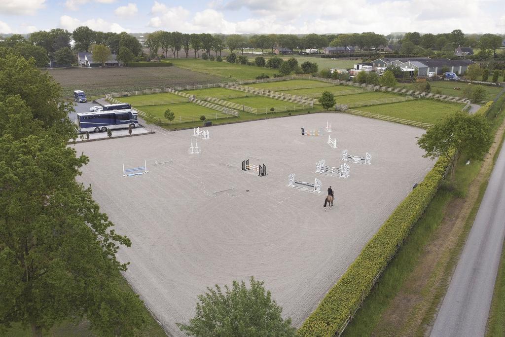 The generous outdoor arena is equipped with an ebb and flow soil and a sprinkler system. A wooden summerhouse with terrace is located on the long side of the arena. The outdoor arena is linked to the galloping track.
