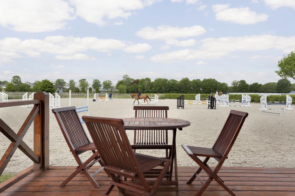 A wooden canopy is located on the left side of the outdoor arena. The fridge and coffee machine allow you to enjoy the fantastic view of the outdoor arena while enjoying a drink.