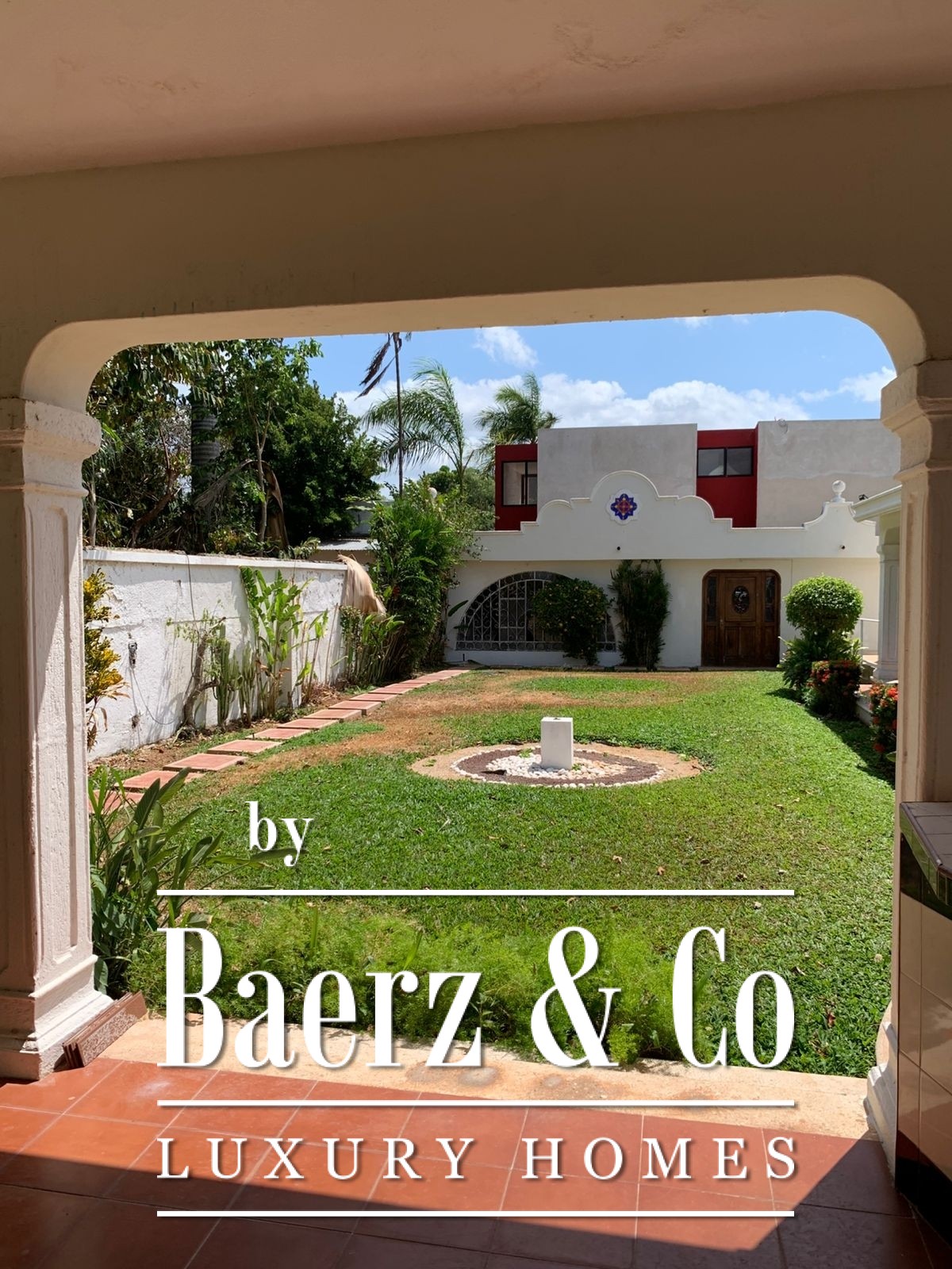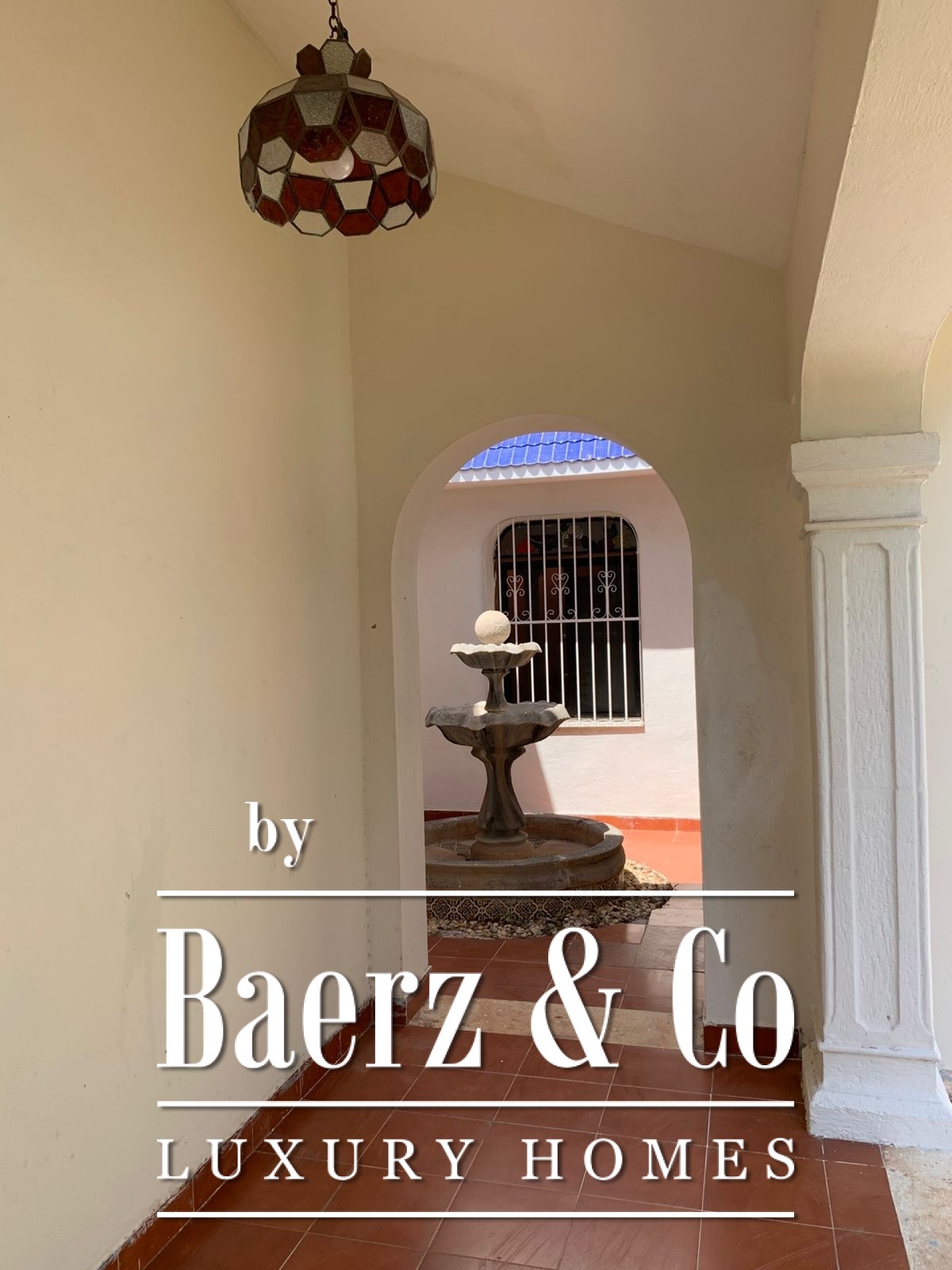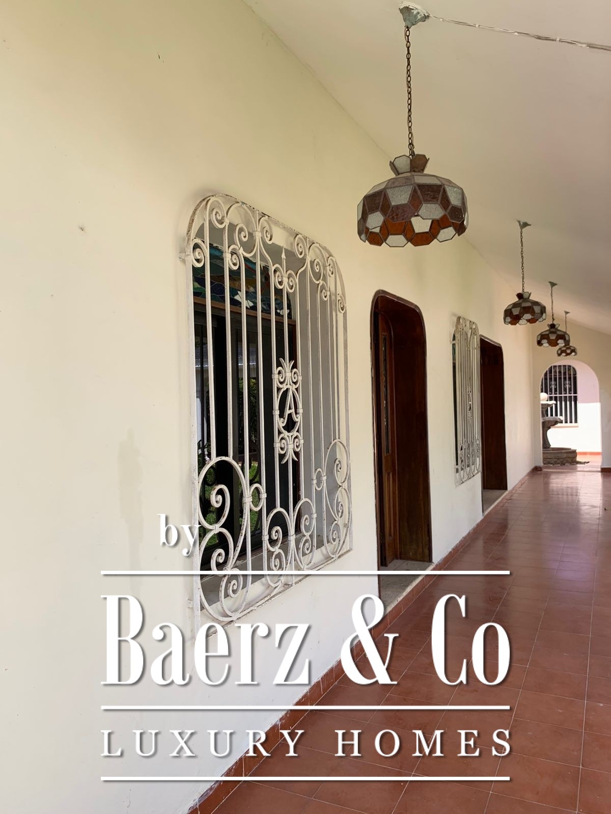 ° Main house: front terrace, foyer with half bath, spacious living and dining rooms with ceramic tile finishes and floors, rear terrace with fountain and bar overlooking the interior garden, large kitchen and breakfast nook, two storage rooms. Study, two bedrooms with full bathrooms, interior and exterior hallways overlooking the large garden. Walk-in closet and bathroom with shower and tub.