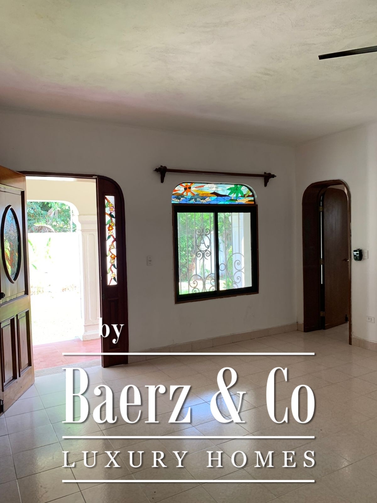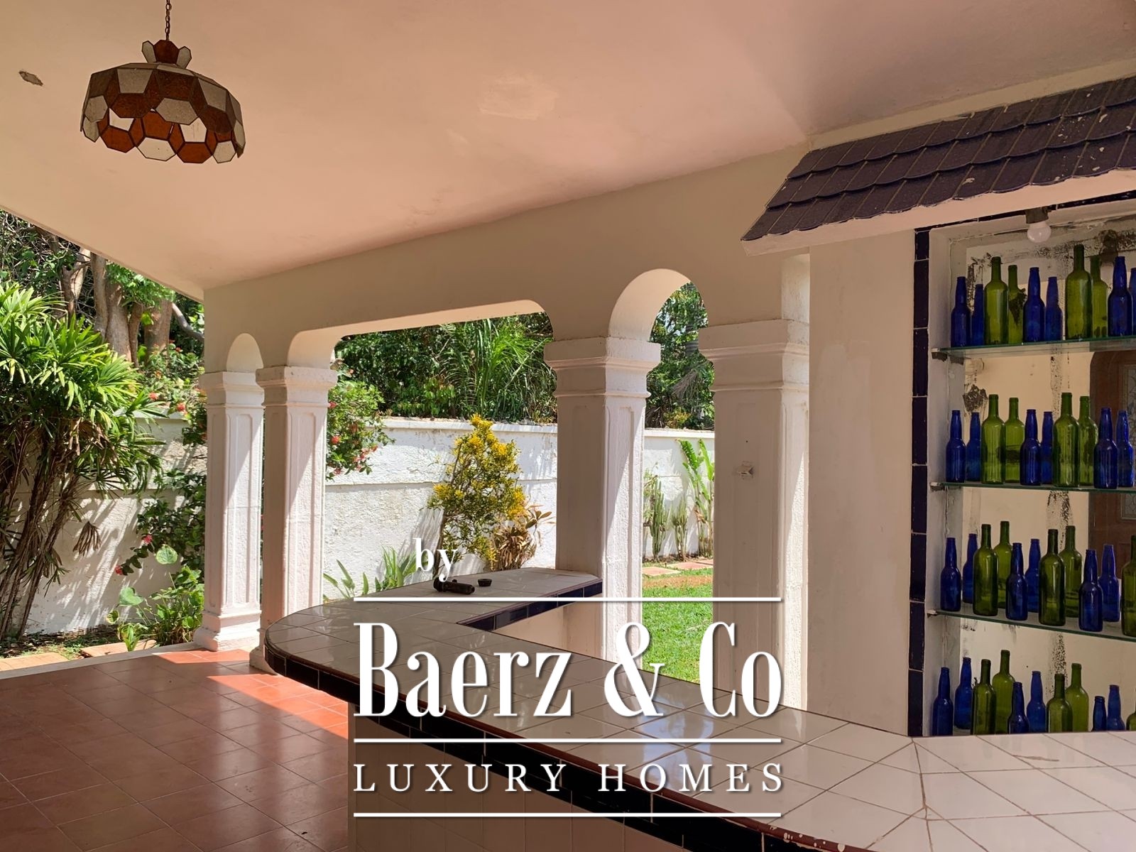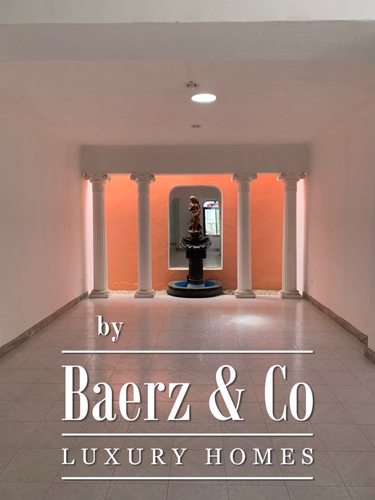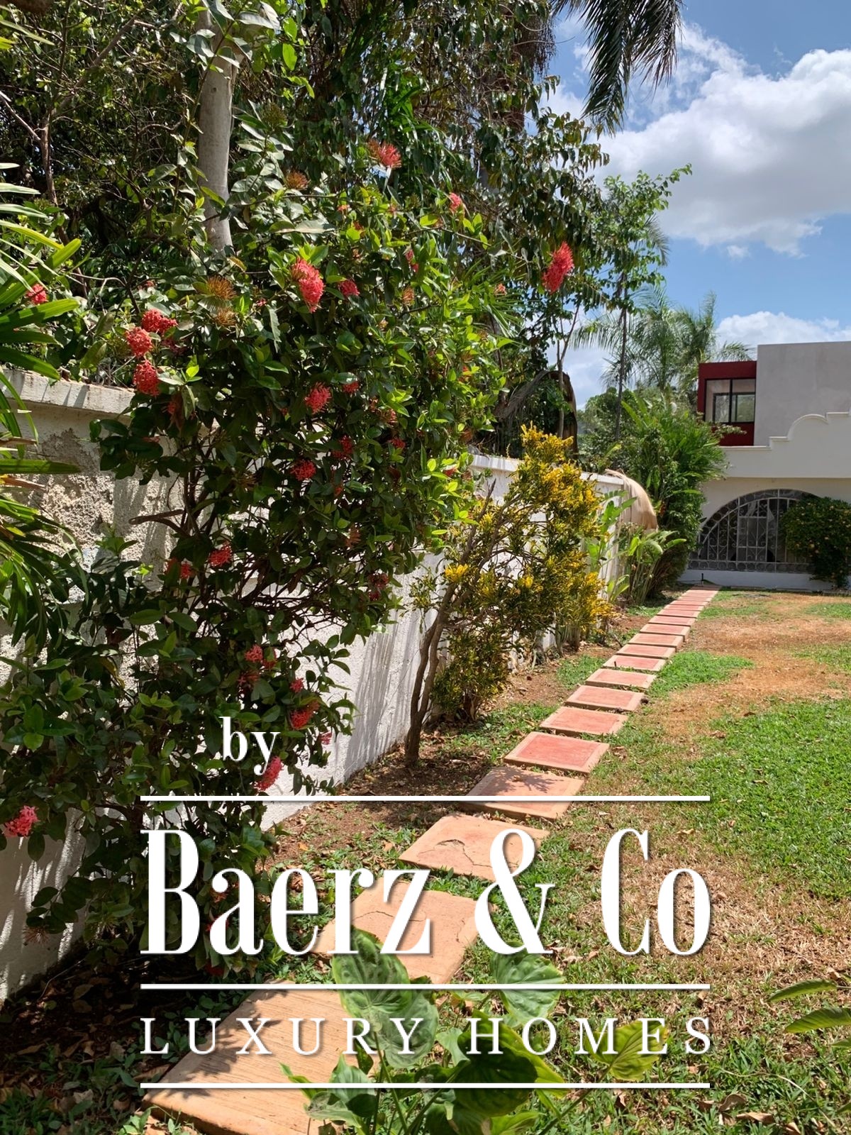 ° Main house: front terrace, foyer with half bath, spacious living and dining rooms with ceramic tile finishes and floors, rear terrace with fountain and bar overlooking the interior garden, large kitchen and breakfast nook, two storage rooms. Study, two bedrooms with full bathrooms, interior and exterior hallways overlooking the large garden. Walk-in closet and bathroom with shower and tub.