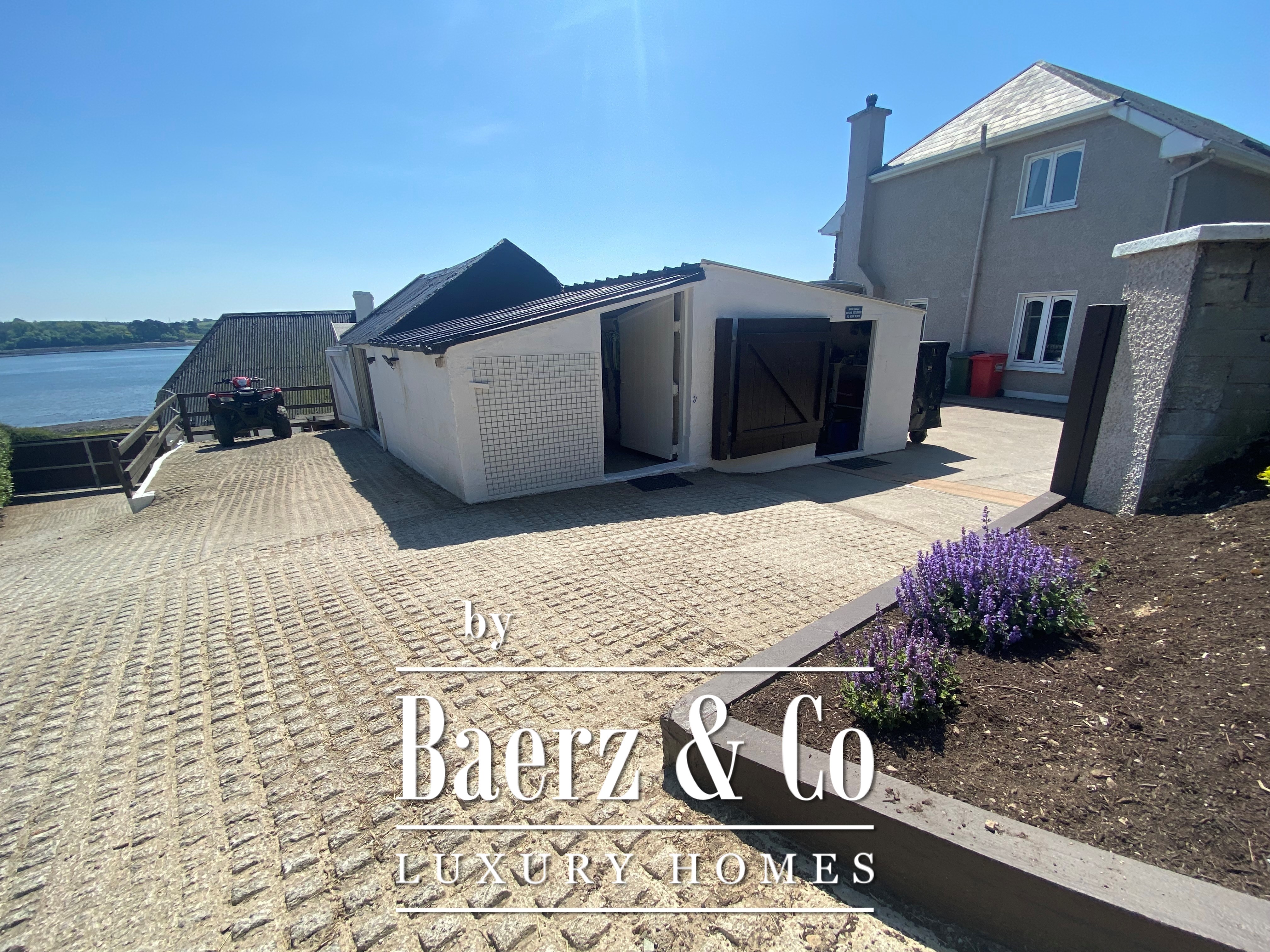 For equestrian enthusiasts, this property is a rare gem, offering a floodlit sand arena, purpose-built stables, a paddock, and a variety of outbuildings that offer both storage and conversion potential. The lands, gently sloping and well maintained, wrap around the property and lead your eye toward the water—offering breathtaking views from both the front room and the fields above.
