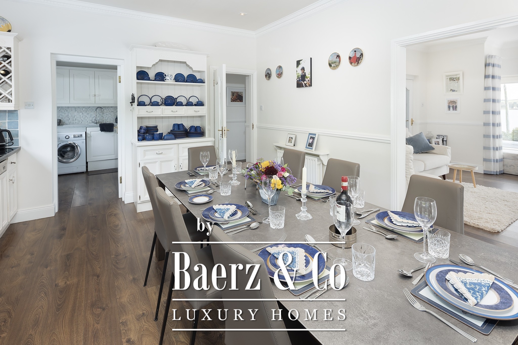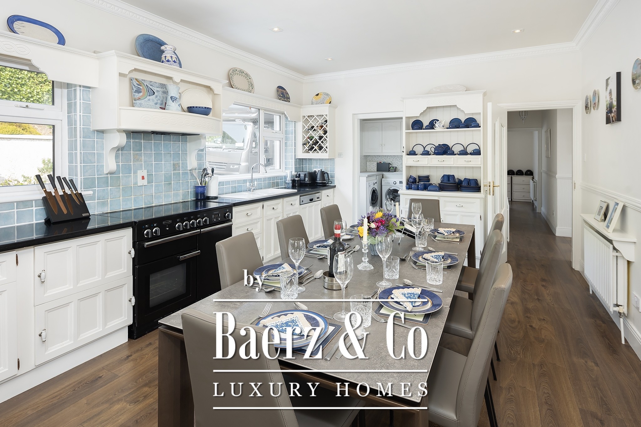 Kitchen/Dining room (5.8m x 4m) The kitchen boasts beautiful built-in units with a granite worktop and range master cooker. There are doors leading to the hallway, sunroom, and living room No. 2, which makes this kitchen/dining room central to the home, ideal for both formal dining and entertaining guests.