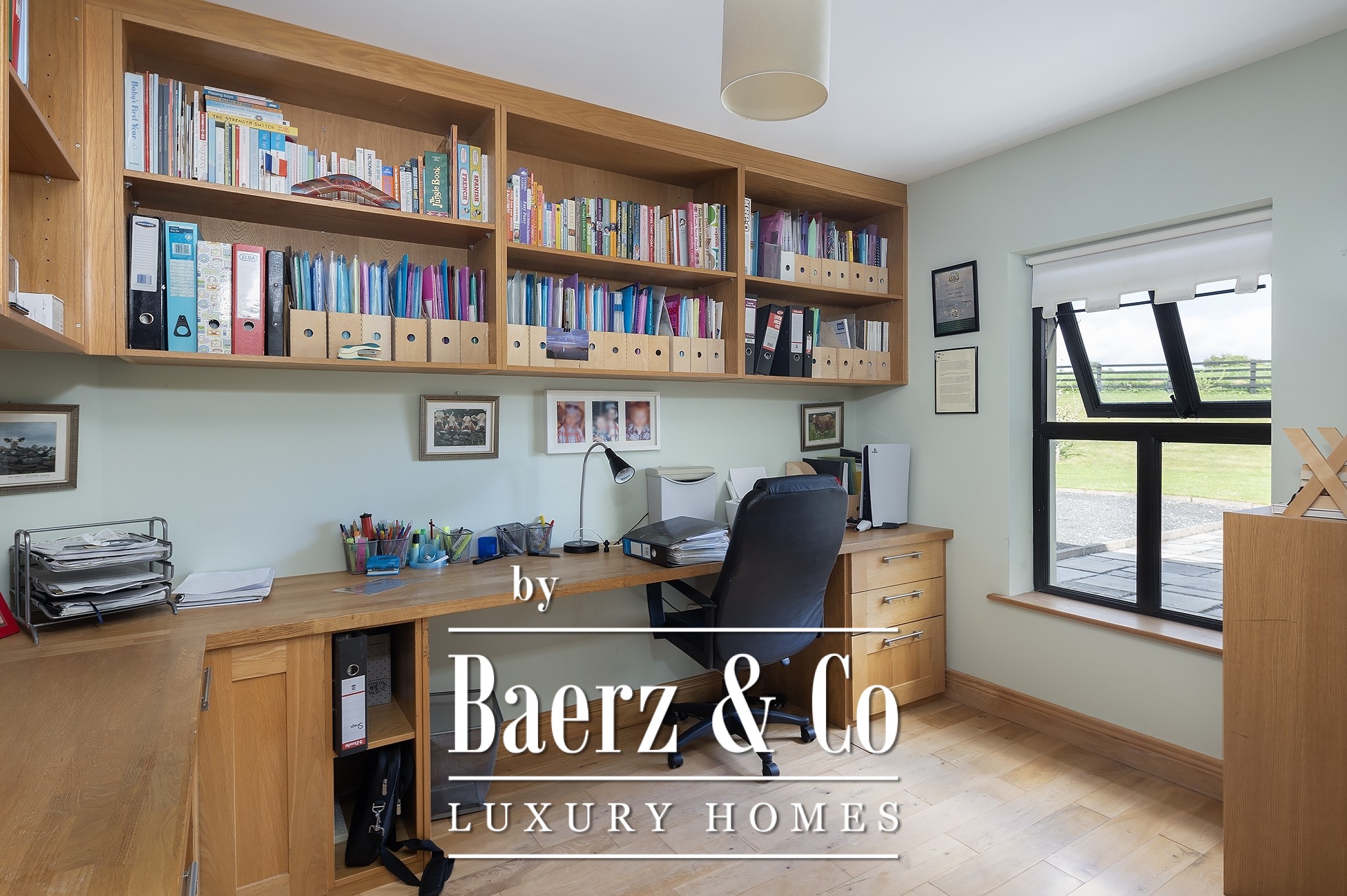 Built-in oak units, shelving, and a workstation.