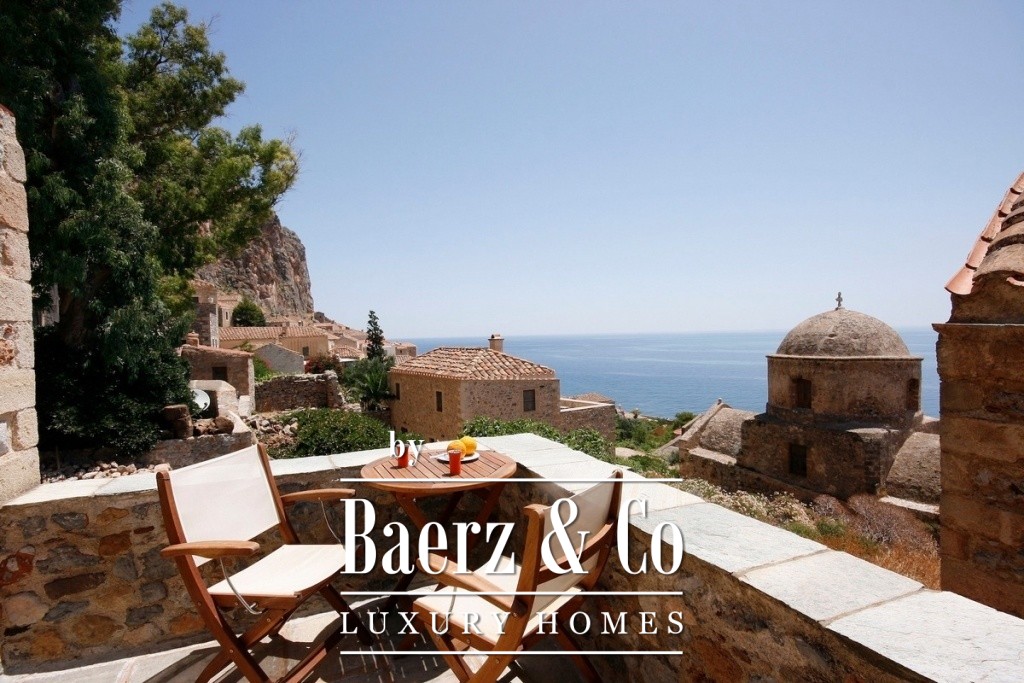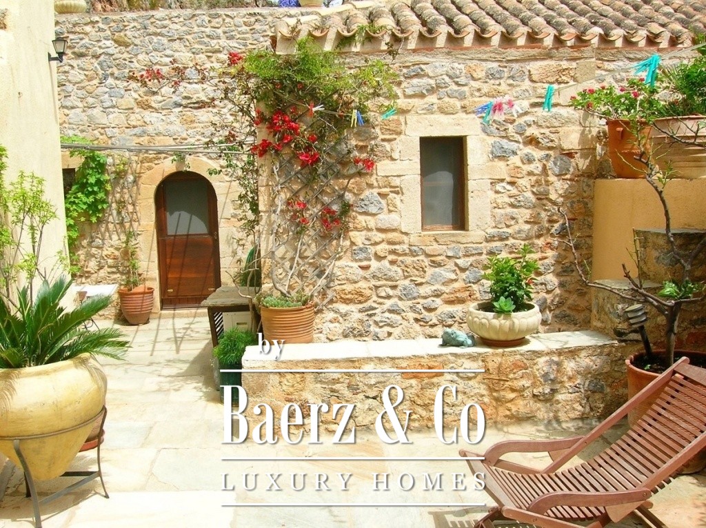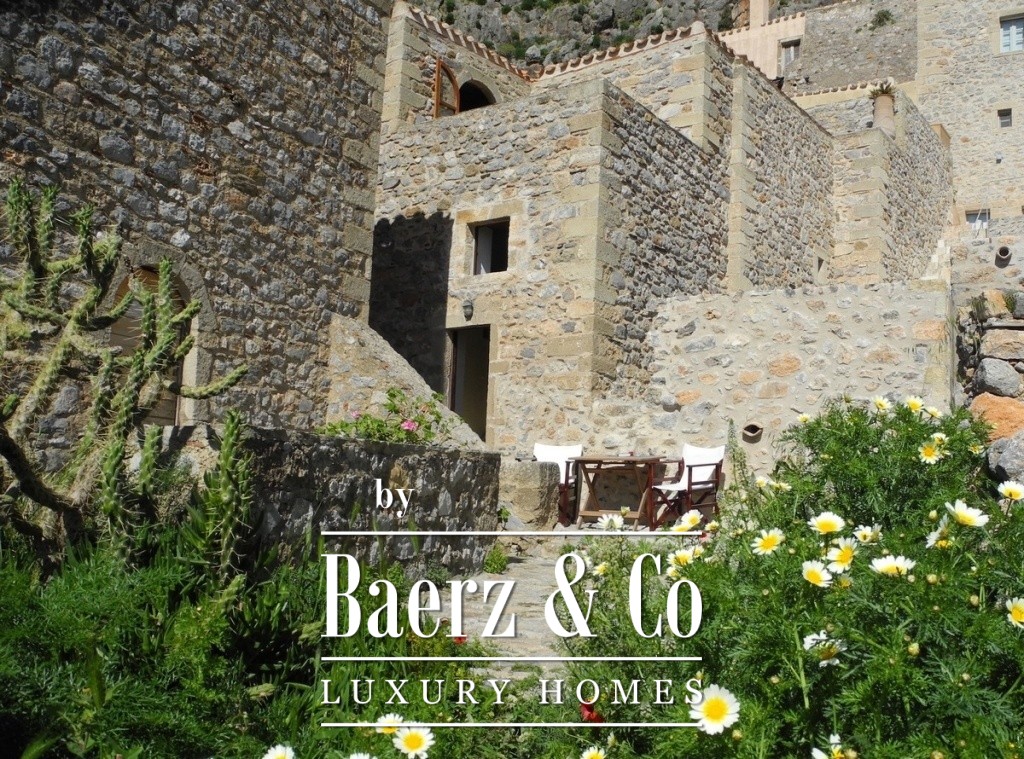 A unique property, consisting of 3 autonomous residences in the heart of the Citadel of Monemvasia, is available for sale. The property includes 3 renovated stone apartments, set within a plot of land and united by a picturesque colourful courtyard. The first part of the property is a detached house with a total surface area of 205 m², on 2 levels. Here, we find spacious and bright rooms, with carefully selected decorations, underlining the traditional character of the residence. The upper level of the residence consists of a magnificent living room with a traditional fireplace, a modern, equipped kitchen opening onto a large terrace, offering a breathtaking panoramic view. On the lower level (ground floor), we find a large bedroom and at the end of the corridor, which we cross via a small bridge overlooking the old cistern of the house, a superb recently renovated bathroom. An auxiliary space (entrance - laundry room - storage) brings together the second building. From this point, we are able to access to the second house, also built on two floors.