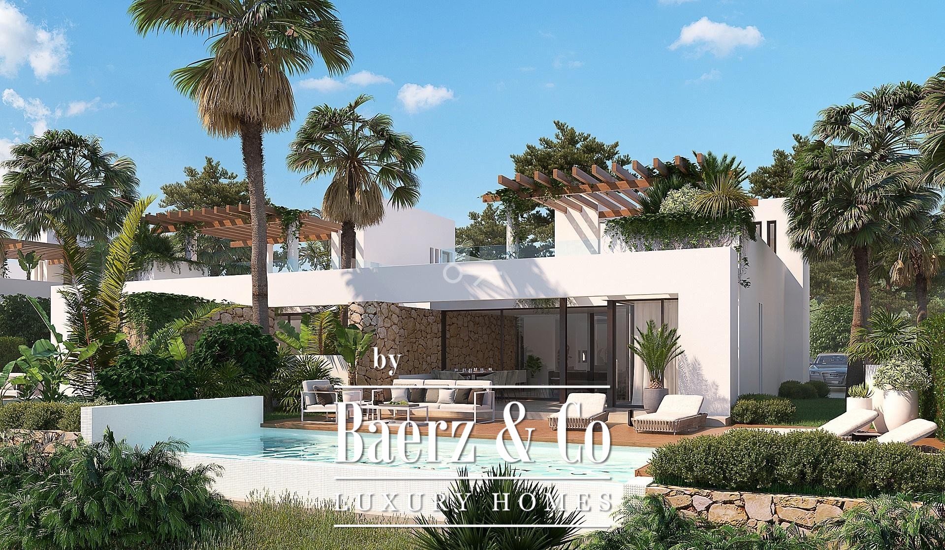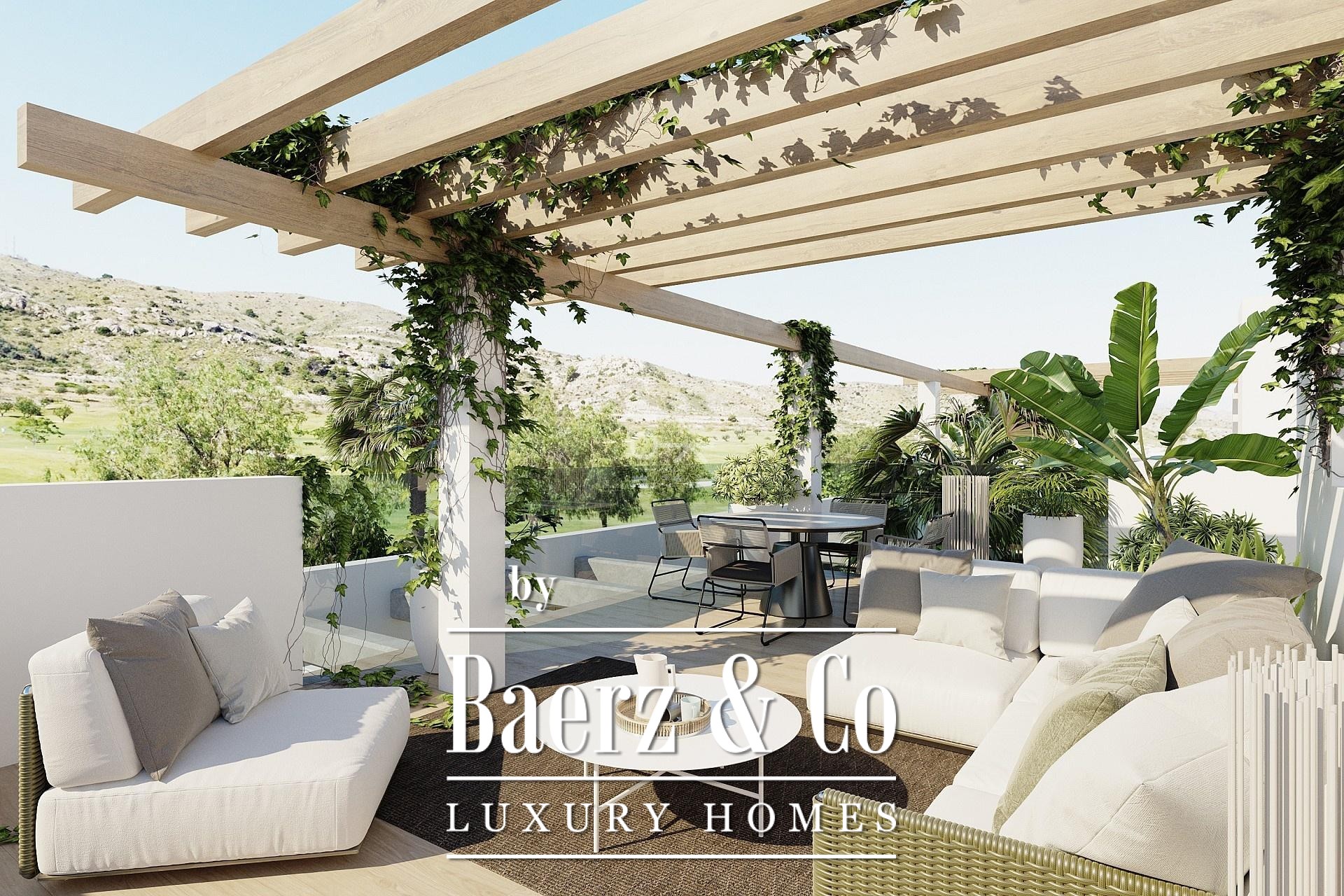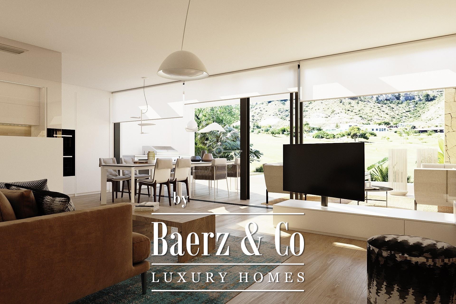 On the ground floor, an open-plan living room flows effortlessly into a contemporary kitchen and adjacent storage, all opening onto a private terrace and pool. The sleeping quarters include a master suite with a dressing room and en-suite bathroom, as well as a second bedroom with its own bathroom. Ascending to the first floor, a third bedroom also features an en-suite bath and direct access to the upper terrace, orientated for tranquil views across the course.