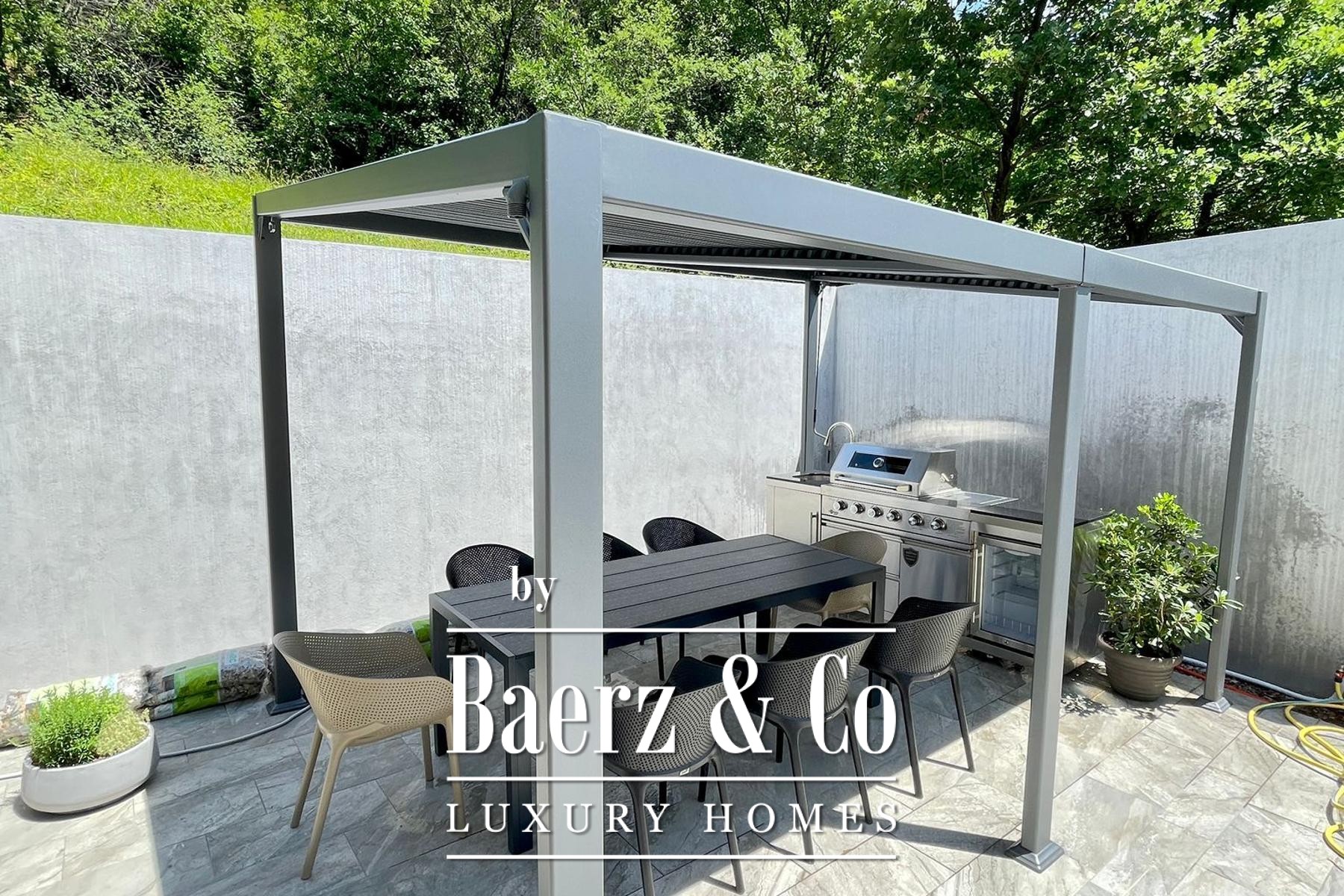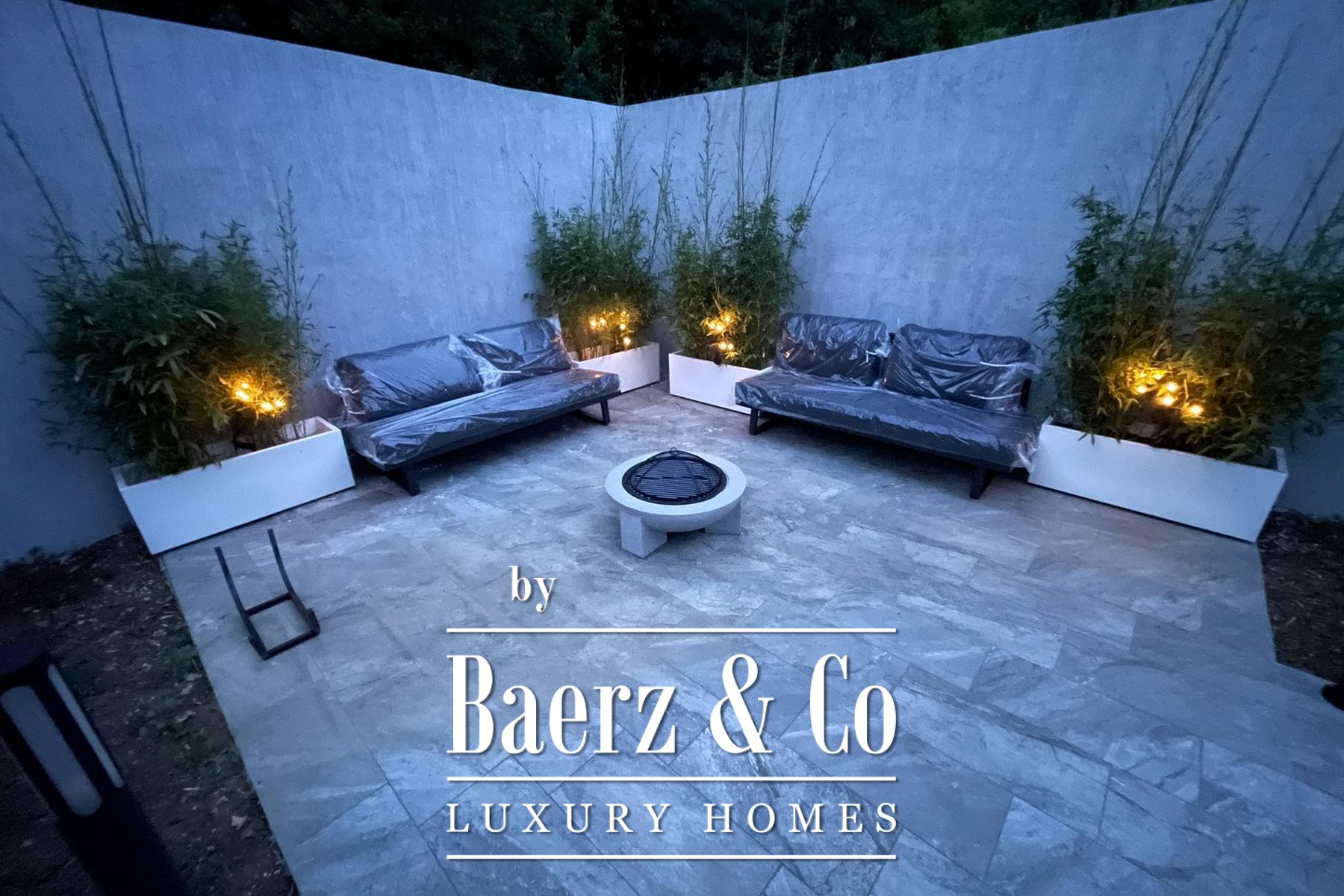 Every detail speaks to a carefully curated rhythm of living. The ground floor opens with a welcoming entrance hall that flows into an open-plan living area, defined by a kitchen with island, dining space, and living room, all leading out to the terrace and pool. Practical elements include a guest toilet, laundry, and boiler room, creating a seamless integration of function and calm.