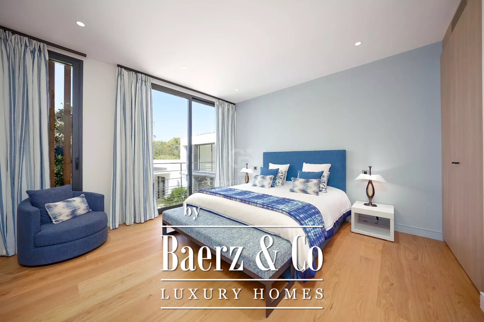 Spread over three levels, the villa impresses with its exceptional volumes and natural light. It features a vast double-height living room with 6-meter ceilings and floor-to-ceiling windows, a dining area, a modern kitchen, and a master suite with en-suite bathroom and walk-in closet. There are also four additional en-suite bedrooms, a fully equipped fitness room, a sauna, a cinema room, a games room, and a wine cellar.