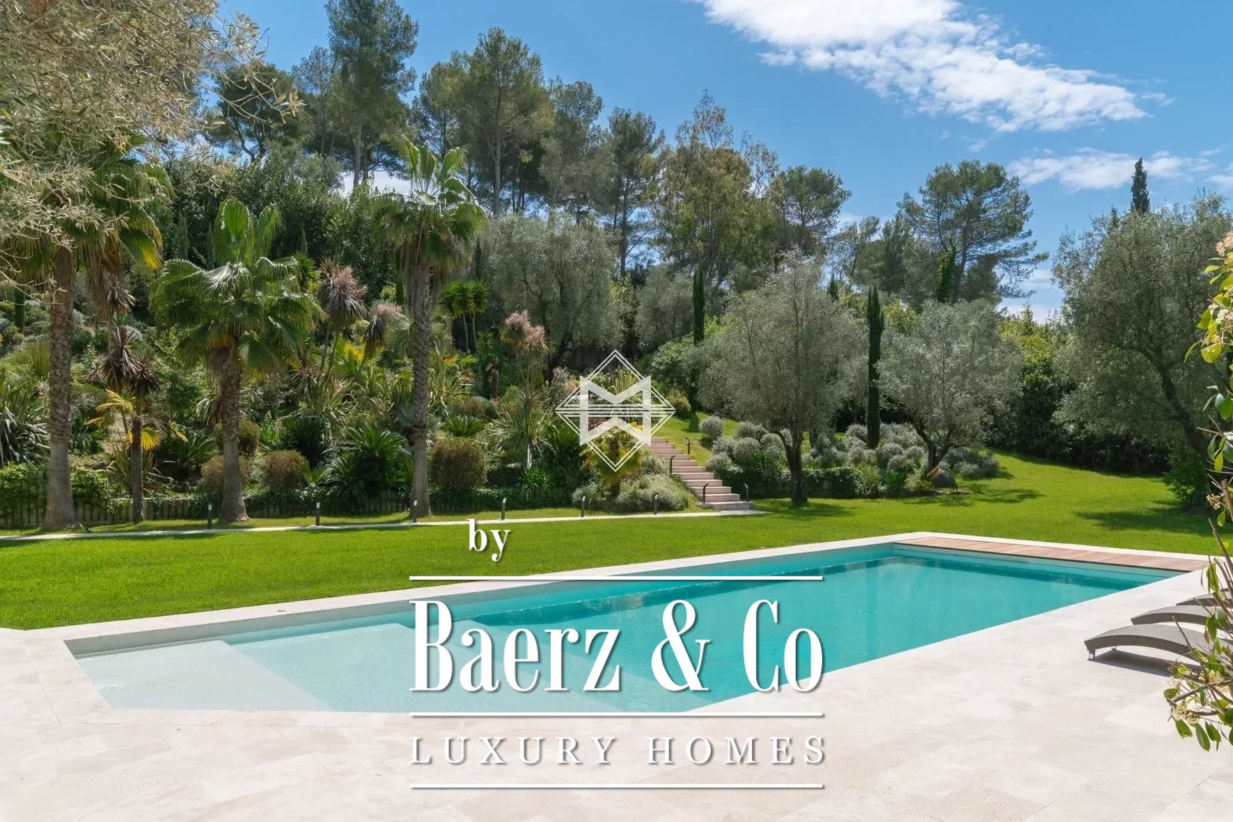 In a quiet environment, in a residential and much sought-after area of Mougins. Contemporary villa, recently renovated, of a surface of 625m², set on a flat land of 8500m² with a heated swimming pool and a pool-house accommodating a summer kitchen. The very sunny villa, South West exposed and unoverlooked, comprises: large reception room with a fireplace, wine cellar, dining room, separate fitted kitchen with staff entrance, laundry room, 7 bedrooms and 3 staff bedrooms. 1 garage. Carport for 3 cars.