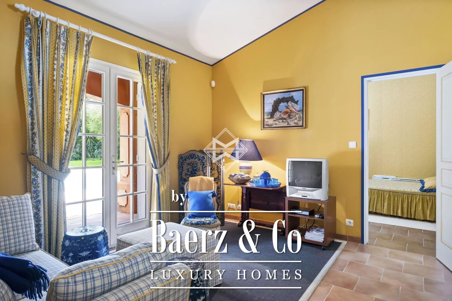 Rare. Ideally located a few steps from the old village, on flat land of approximately 3200 sqm with an olive grove, this ideally exposed Provençal villa from the 1970s can be discovered at the end of a beautiful alley of laurels. Built mainly on one level around the pool area, this villa offers five bedrooms, two of which are in the main building. A large basement to be converted offers many possibilities (wellness
