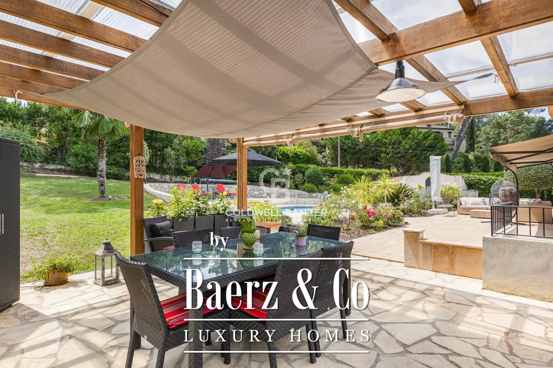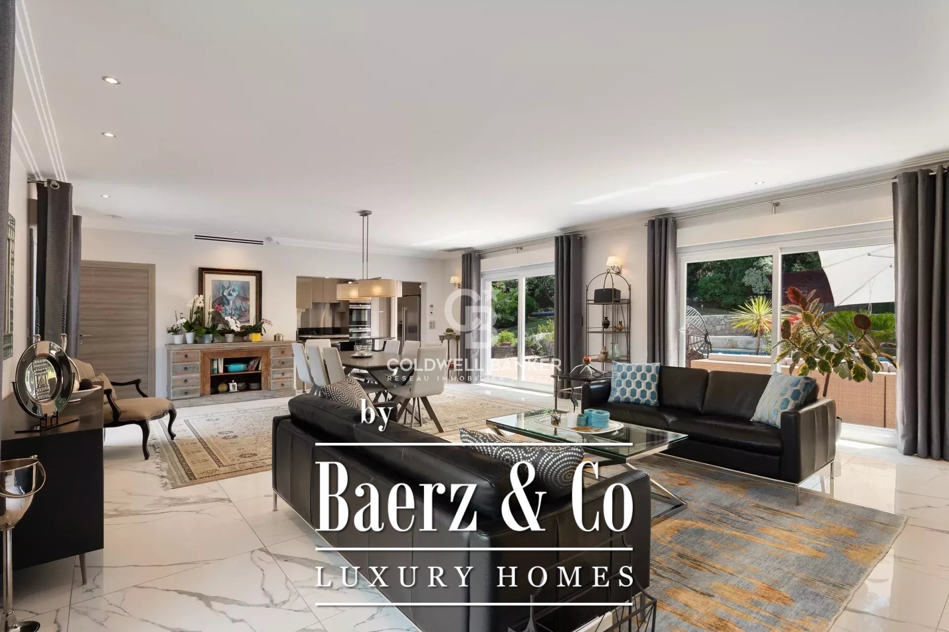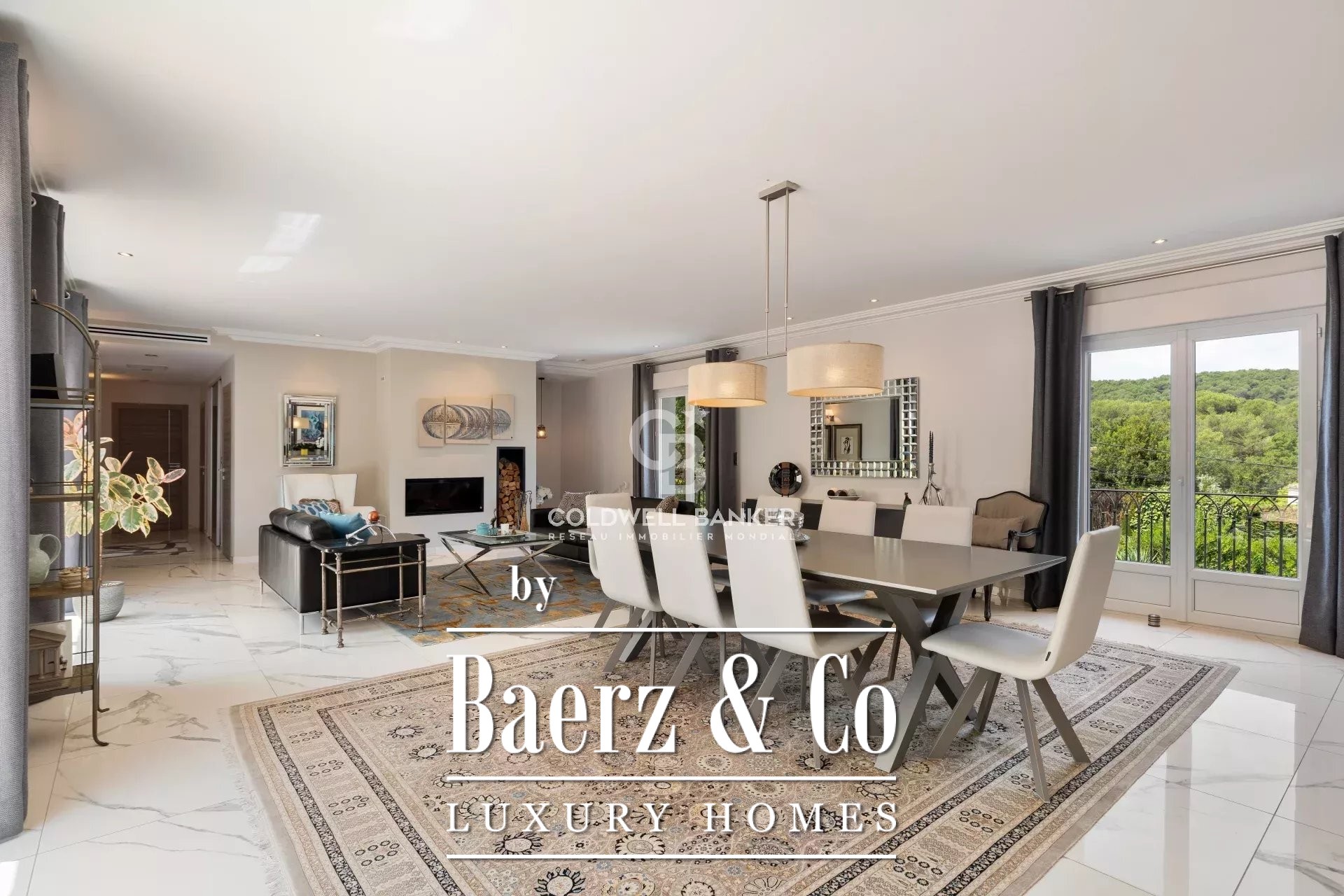 Villa Mougins is situated within the discreet confines of the closed La Peyrière domain, offering a quiet environment close to all conveniences. This property delivers 245 m² of thoughtfully designed living space surrounded by a level 2,000 m² garden filled with light and stillness. The main level centres around a spacious living room with fireplace, opening onto a semi-open kitchen. A suite with shower room, two further large bedrooms, and a full bathroom complete the floor, each benefitting from garden vistas.