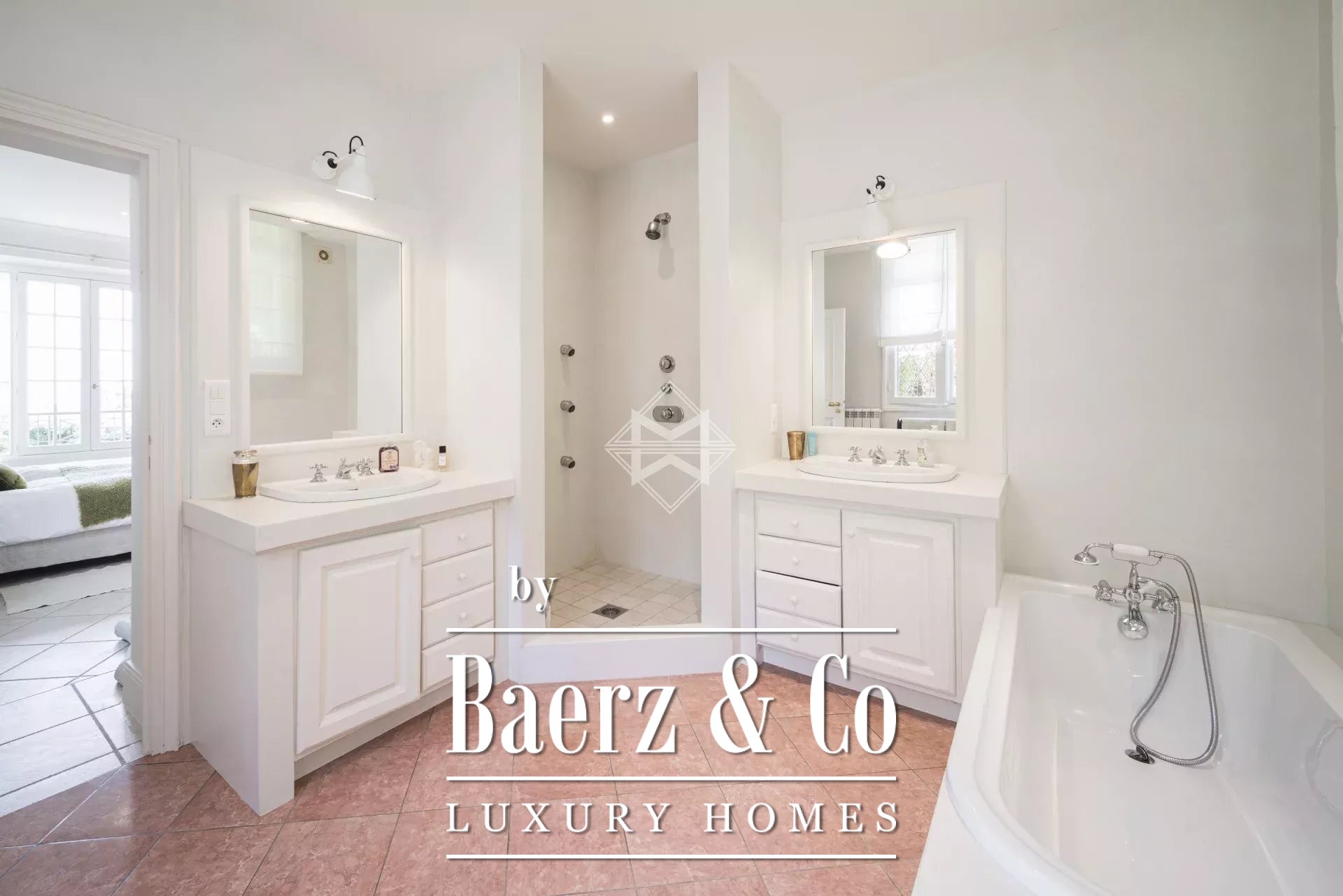 On the garden level, three additional bedrooms—each with its own bathroom or shower—open directly onto a beautifully landscaped garden with a stunning heated swimming pool.