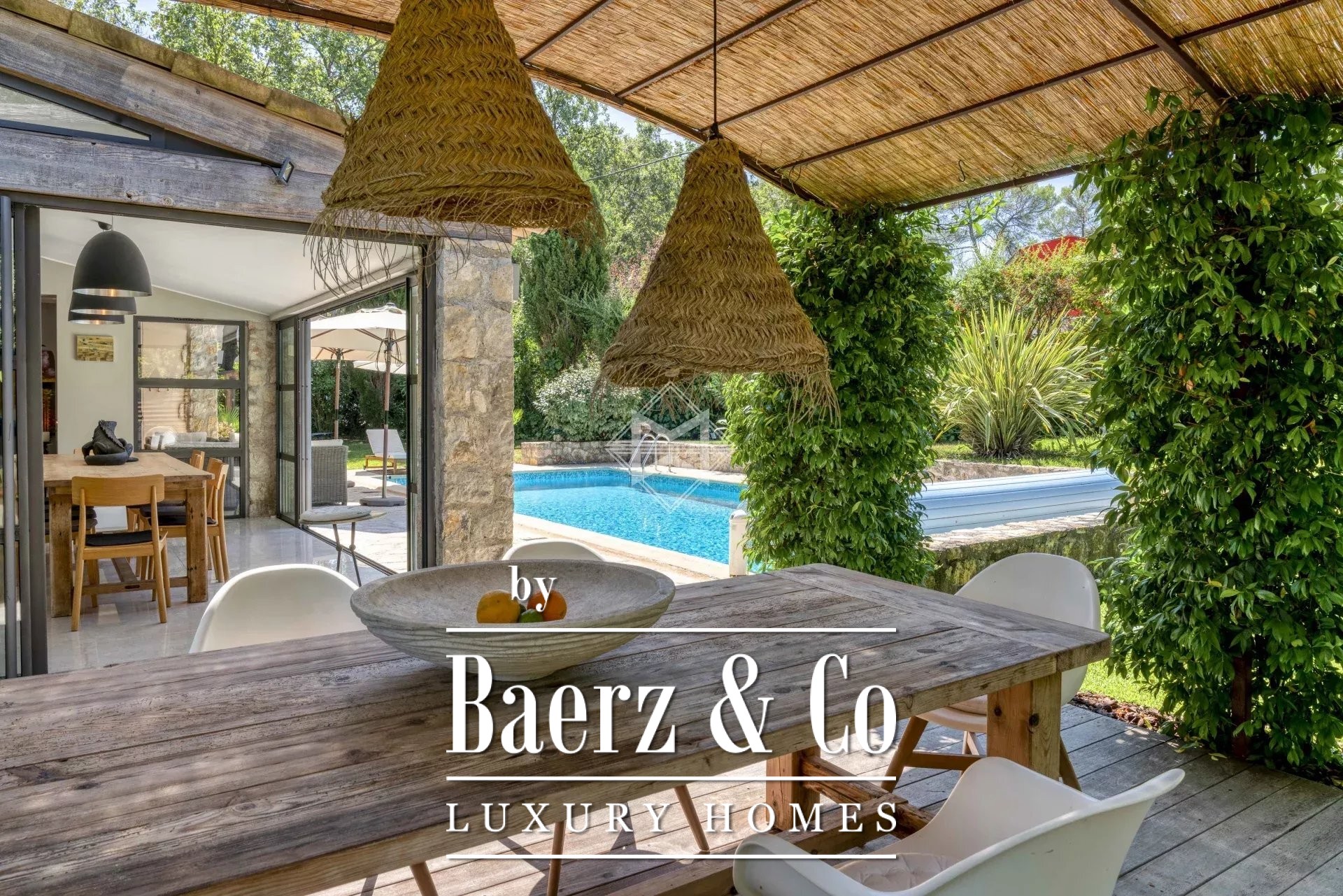 onto the outdoors, all arranged around a lovely heated swimming pool. It features four comfortable bedrooms, ideal for hosting family and friends. Outside, you’ll find a shaded summer dining area beneath a beautiful wrought-iron pergola — perfect for al fresco meals. The landscaped garden includes numerous parking spaces beneath the shade of majestic oak trees.