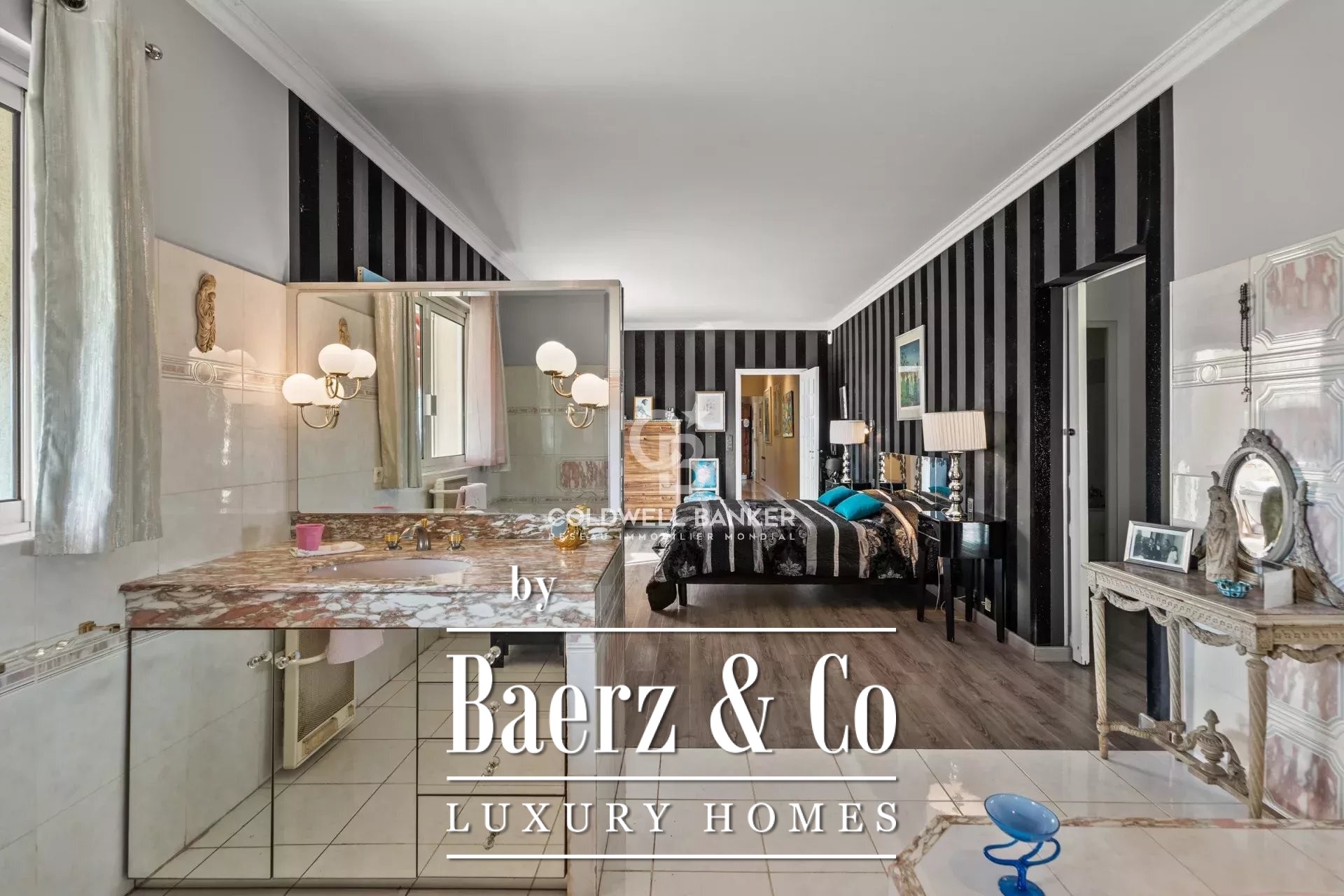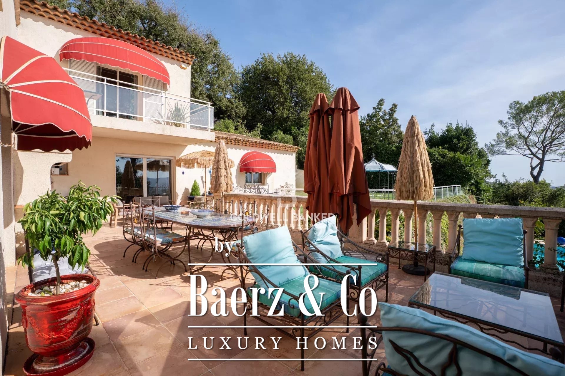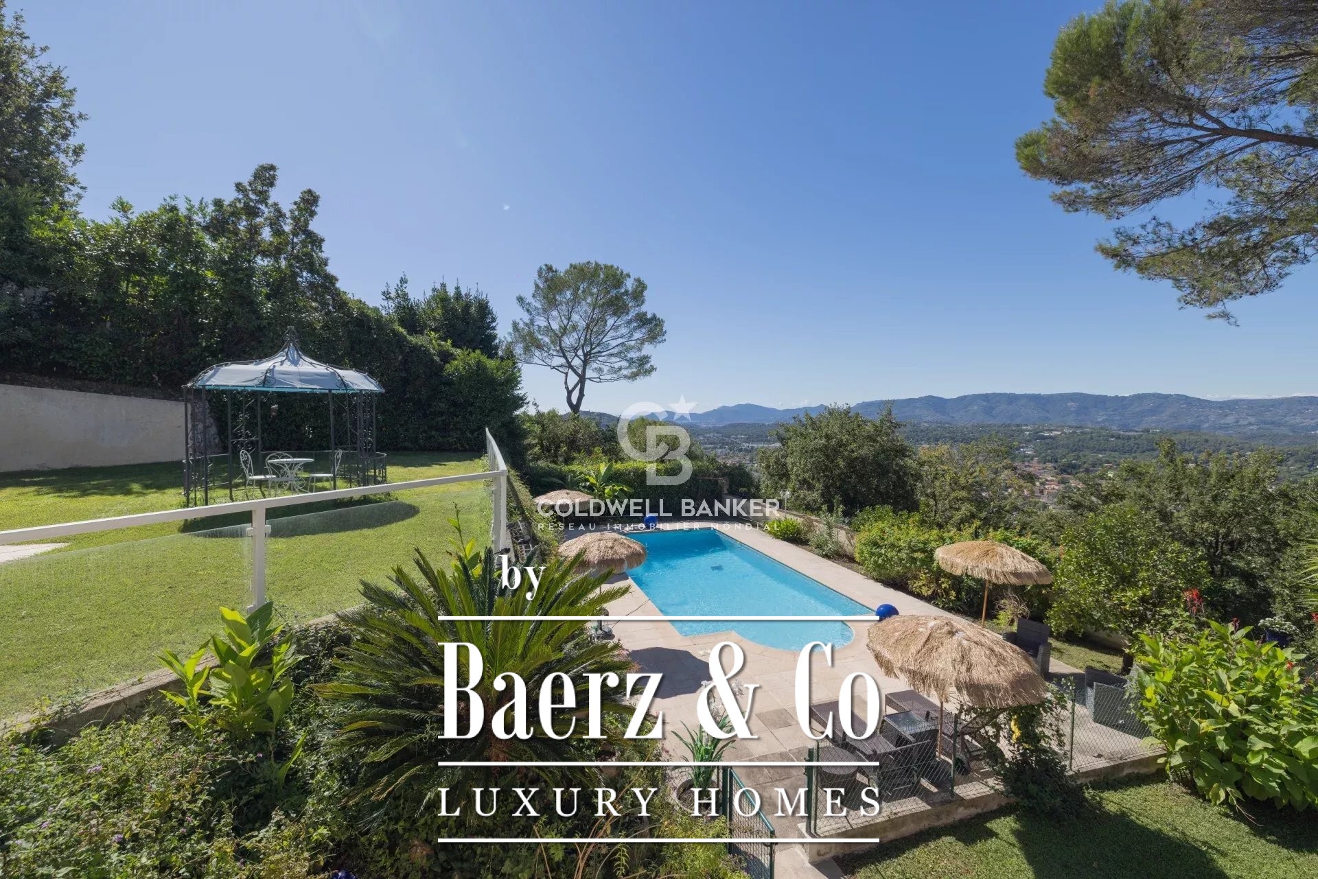 Co-Exclusivity - Nice property located in absolute calm and enjoying a very beautiful view of the sea and the Esterel as well as on the surrounding hills, a few minutes from the center of Mouans Sartoux or international schools. The villa is structured on three levels: - on the ground floor: an imposing living room of 95 m2, a kitchen opening onto the pretty terrace, a master suite and a second independent suite (possibility to create a very large master