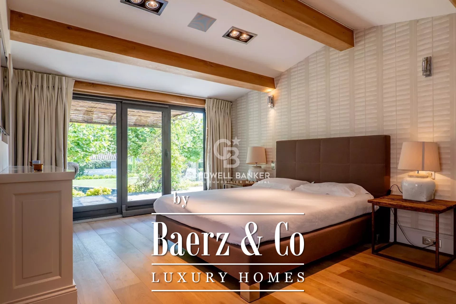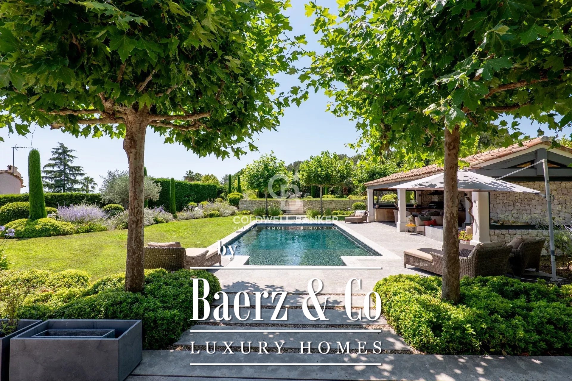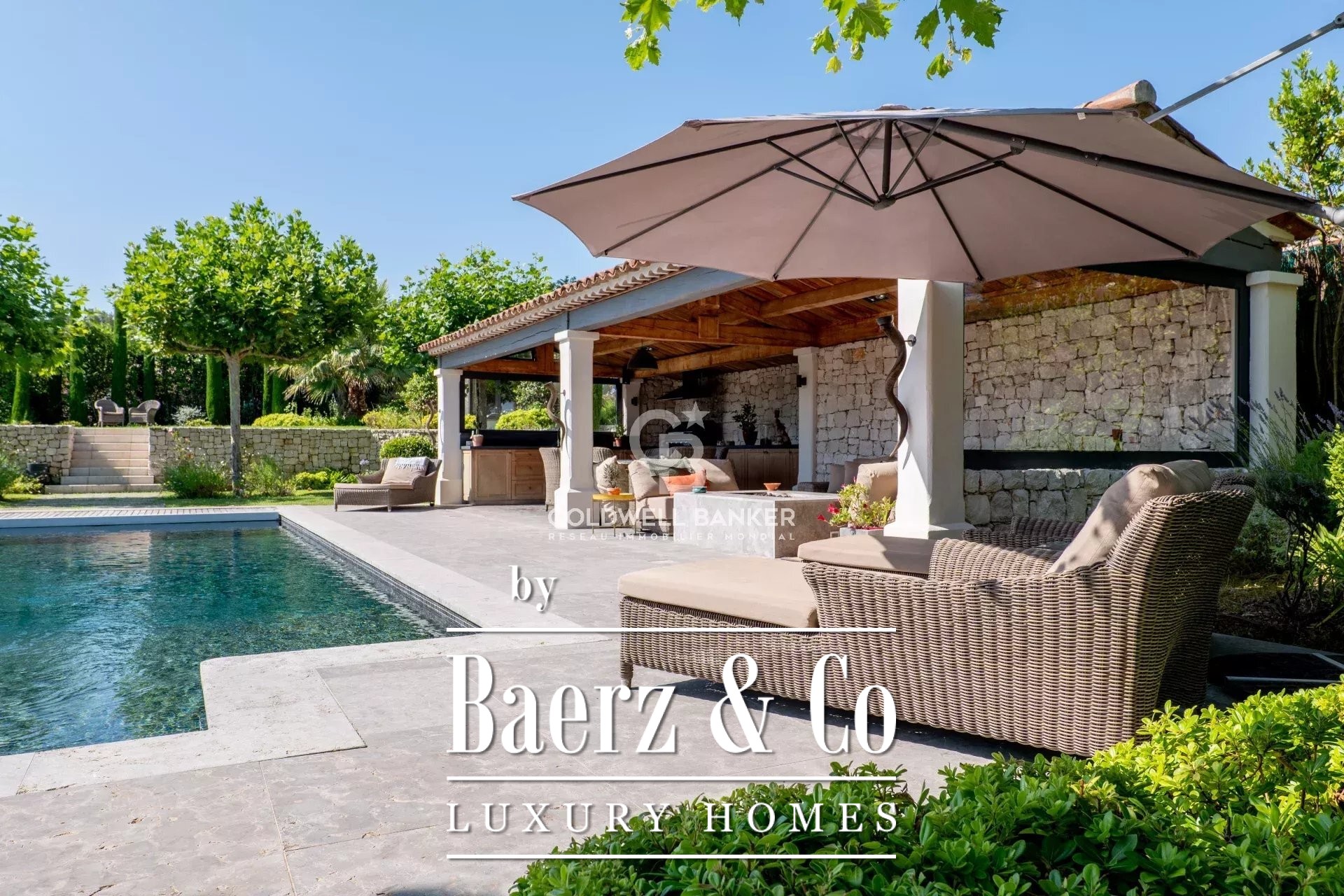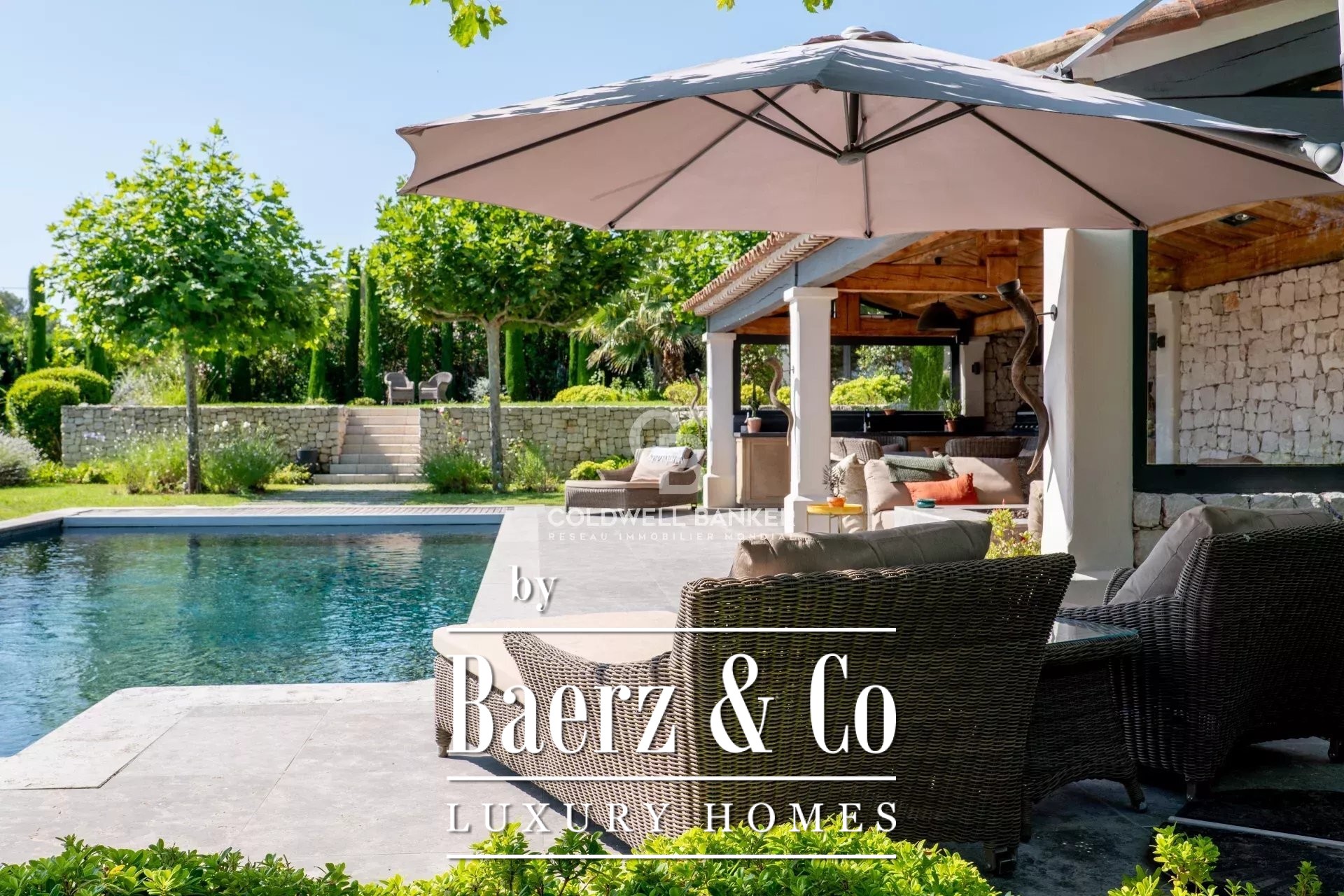room, a vine cellar and a laundry room. The property also includes a guest house with a lovely bedroom, shower room and kitchenette. Superb outdoor area with beautiful swimming pool and pool house of around 130 m2 with brazier and outdoor kitchen. Located just a few minutes from international schools and the old village. Carport for two cars and parking space for at least two more cars.