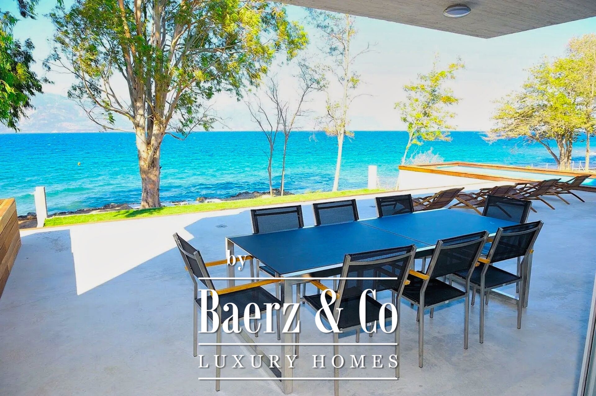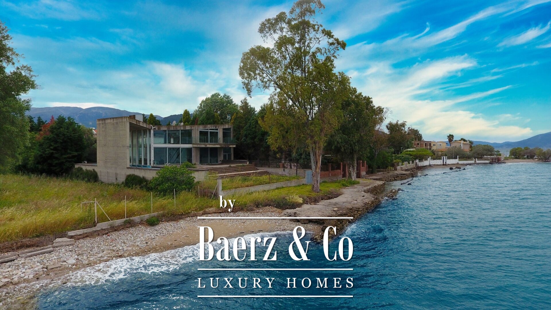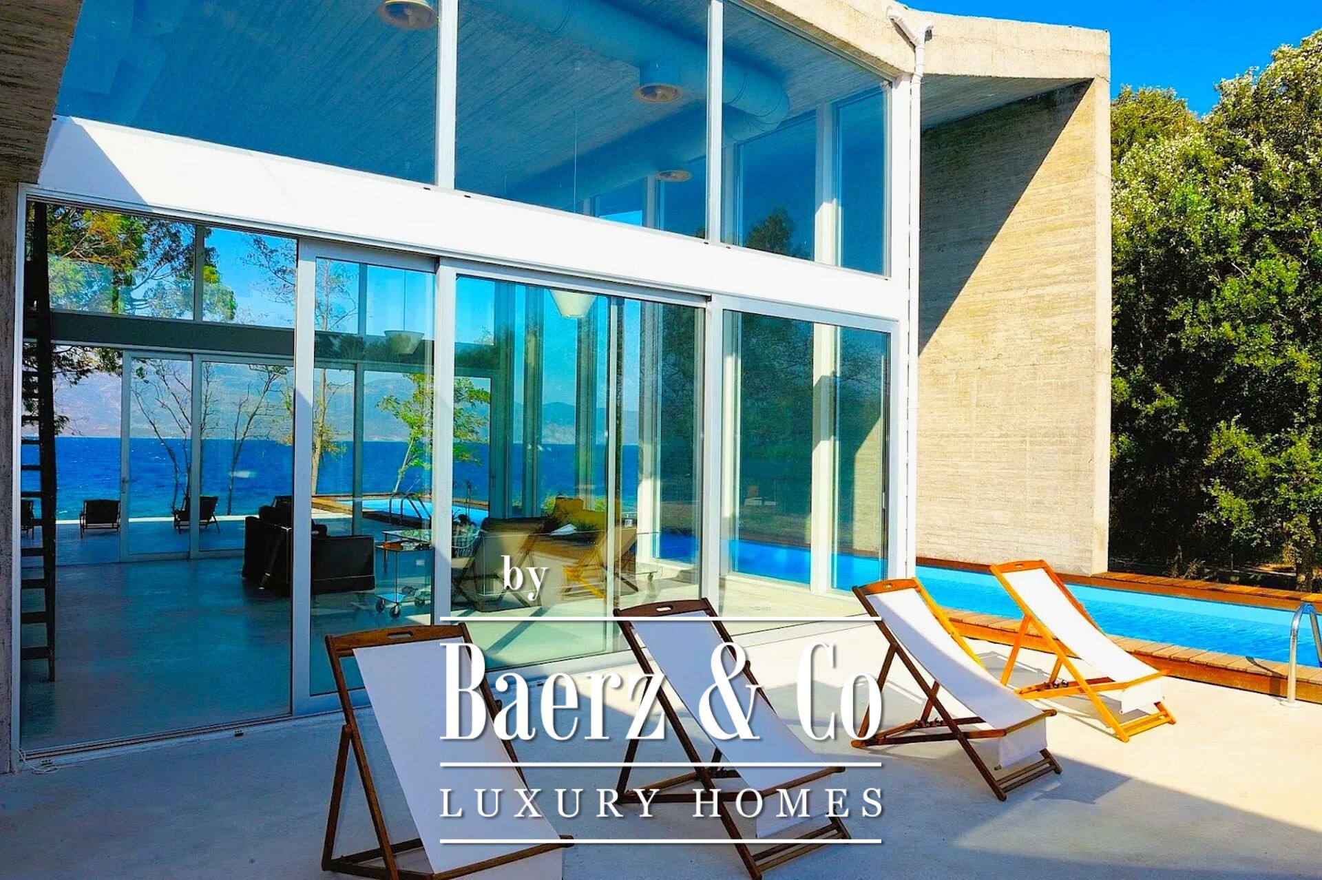 On the tranquil northern coast of the Peloponnese, in the seaside settlement of Bouka just ten kilometres west of Aigio and twenty-nine kilometres from Patras, a rare 434 sq.m. villa rises directly above the water. Built in 2008 on a 1,100 sq.m. plot, the residence adopts industrial style in its most refined form: exposed concrete on columns, walls and ceiling, bare surfaces without superfluous finishes, a metal staircase with sturdy supports and wide glass openings that frame uninterrupted views of the Corinthian Gulf. Entering the grounds, the eye follows the geometry of the pool; its surface mirrors the sky while the carefully designed sun-bathing terrace and built-in barbecue promise unforgettable summer gatherings. A few steps lower, a private path leads to a sandy beach, inviting you to leave your shoes behind and dive into the sea. Inside, the sense of simplicity is served by clean lines, glass tables and black sofas with white detailing. Natural light pours through imposing glazing, softening the raw materials and lending