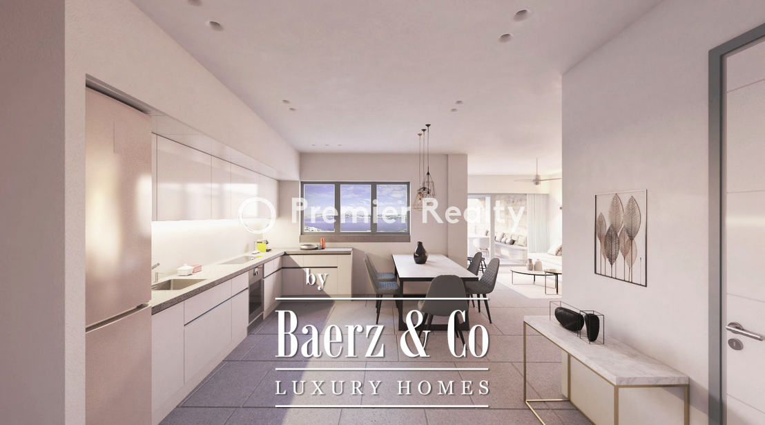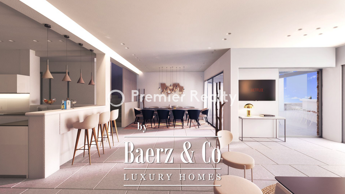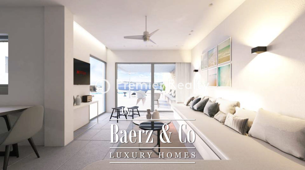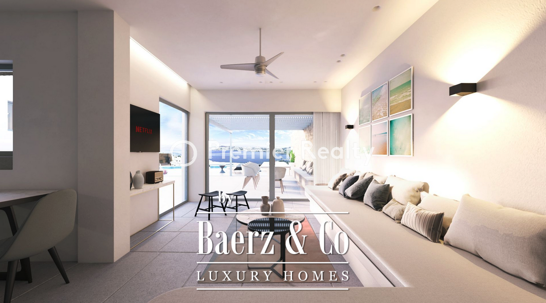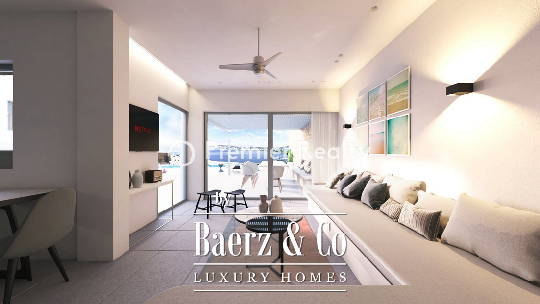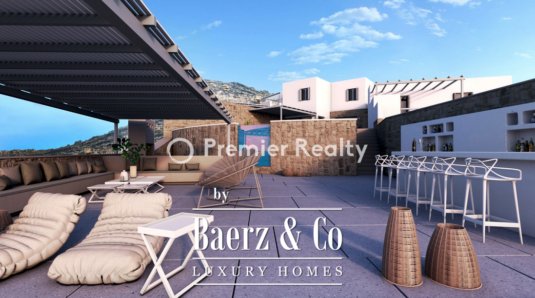 The interiors are defined by vaulted ceilings in the living and dining areas, spacious verandas, a modern kitchen with Miele appliances, elegantly appointed bedrooms with en-suite bathrooms and private balconies, and refined white-toned finishes. Wooden flooring, exposed stone walls, and ceiling beams offer a timeless Cycladic aesthetic. The sophisticated lighting system, air conditioning, and autonomous heating ensure total comfort. Most of the furniture is custom-made for the villa, blending premium materials with high-end design to create a uniquely inviting atmosphere.