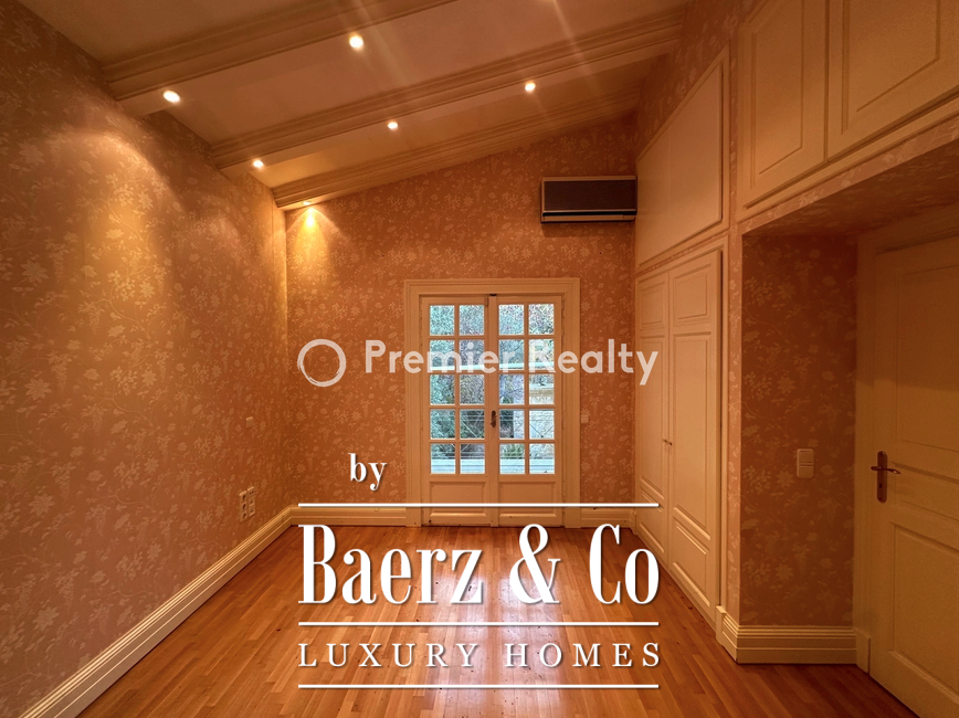 • Living Room with Fireplace (100 sq.m.): Spacious and open-plan, with access to an elevated balcony offering unobstructed garden views.