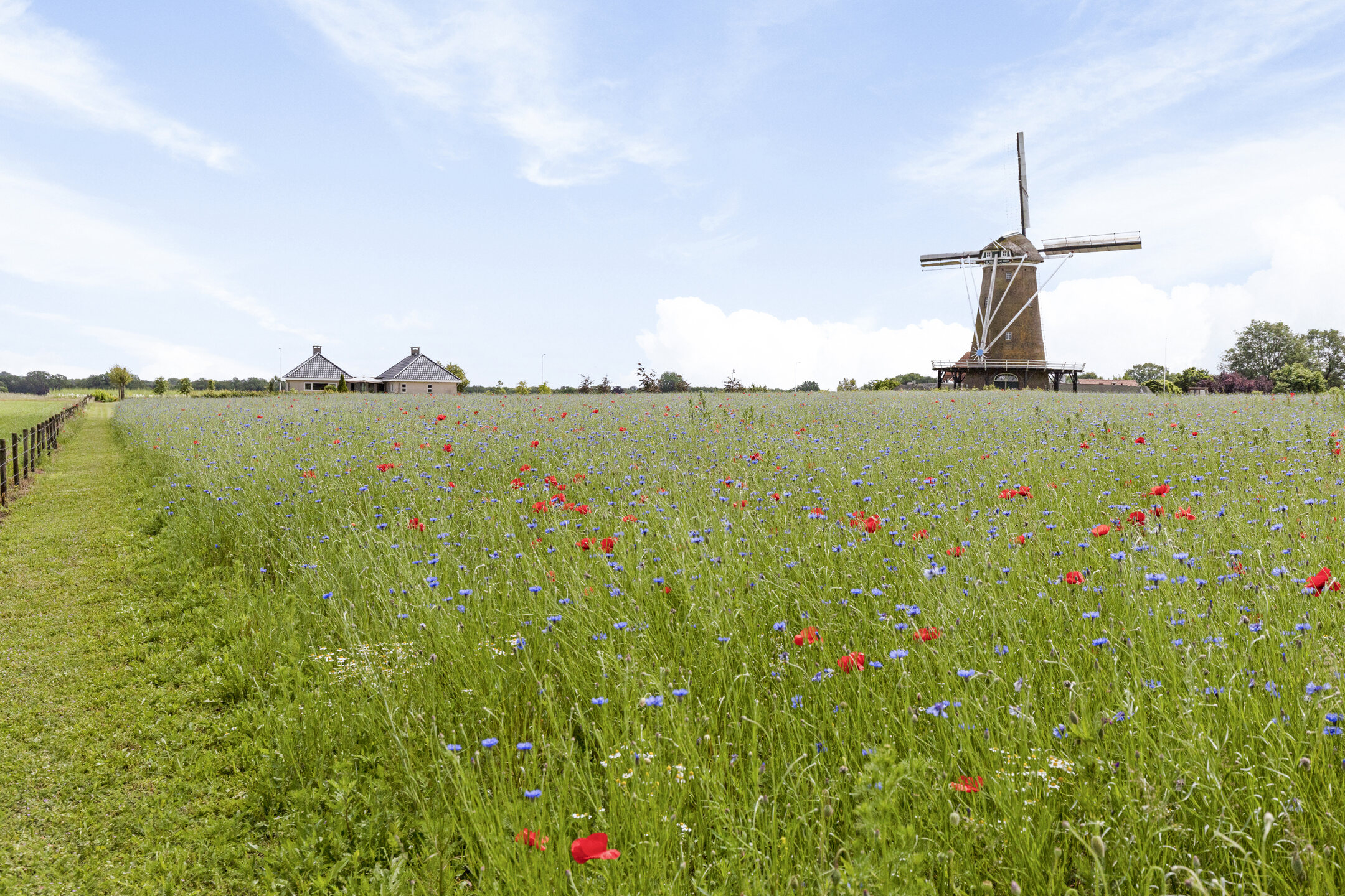 The garden is divided with an ornamental garden at the front and side, at the back of the house there is a vegetable garden. The back of the plot is covered with carpet of field flowers, with daisies, chamomile, stork's beak, sunflowers, cornflowers and poppies in all colors. Behind the garden runs the bike path where people regularly take the time to literally stop and take in the beautiful view.