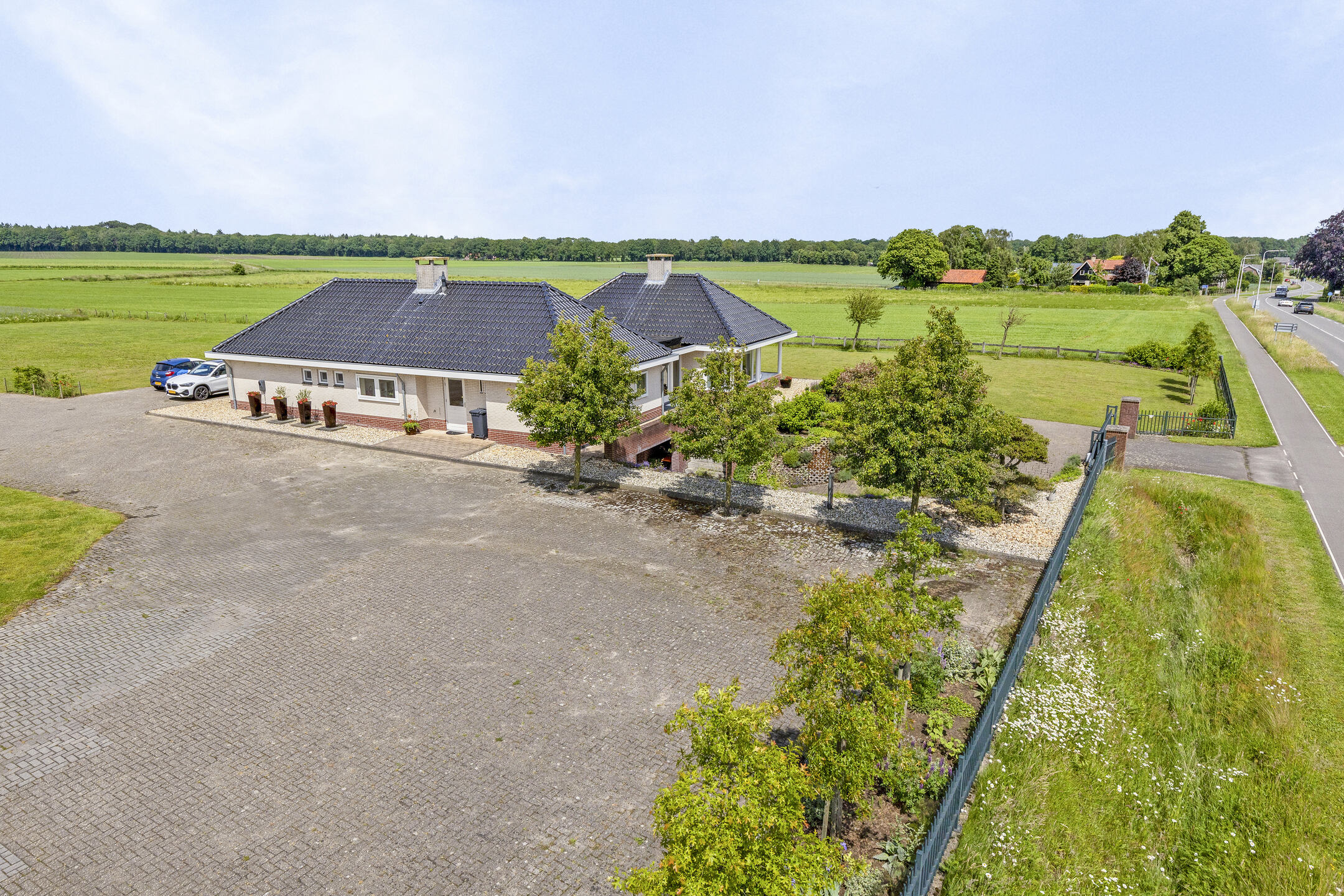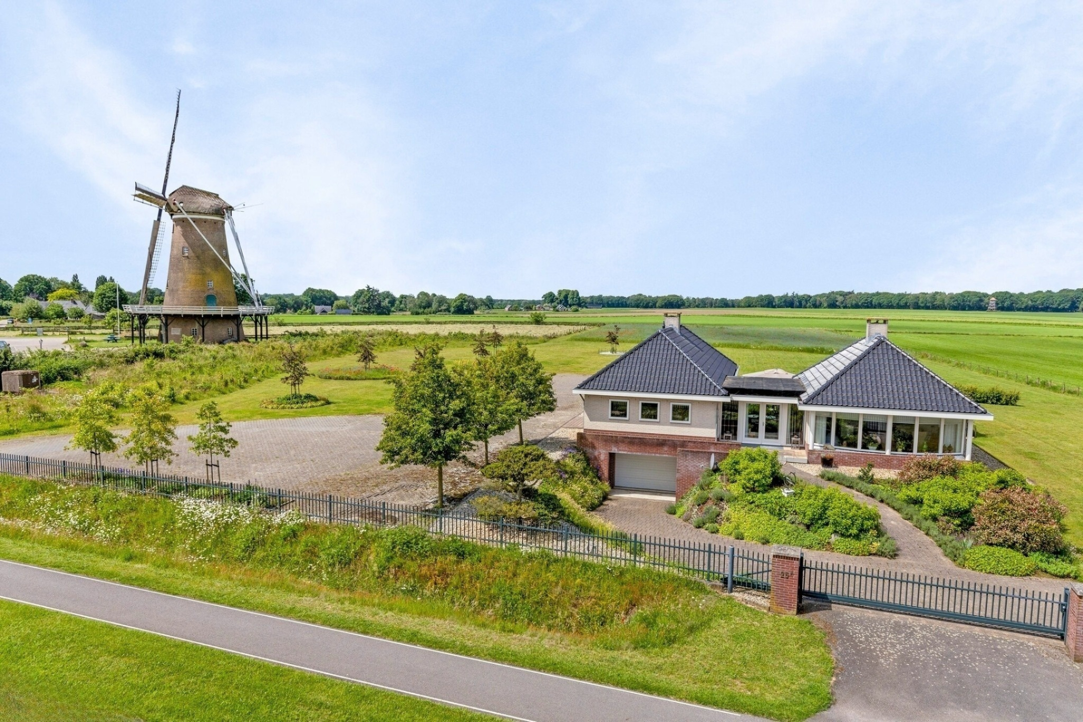 ... for there lies an impressive 1.2ha waiting for you. At the front, the plot is accessed by an electric gate, allowing you to drive straight into the garage. Surface parking is also possible, because the driveway has room for at least eight cars. There is also a charging station, so you always drive away with a full battery.