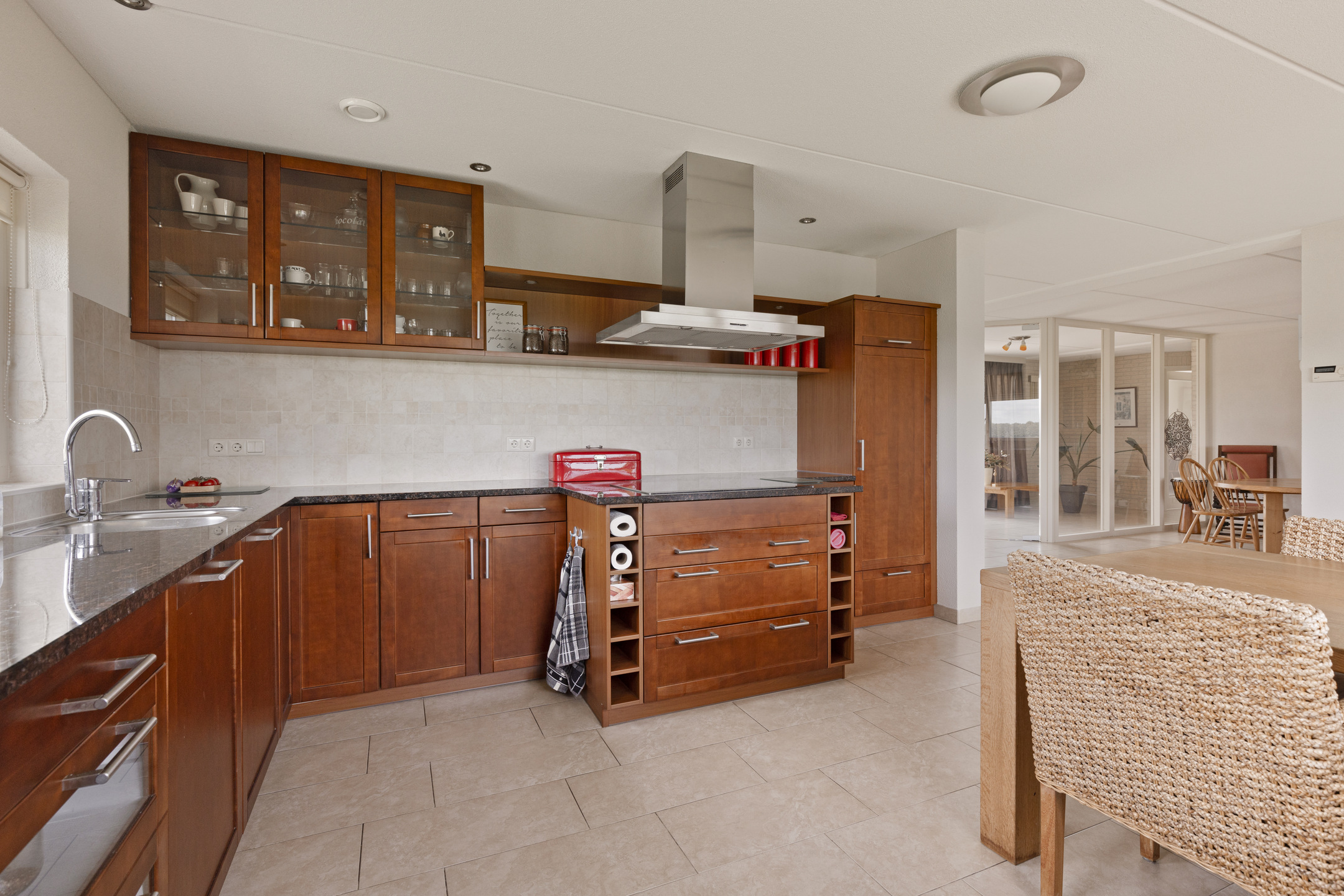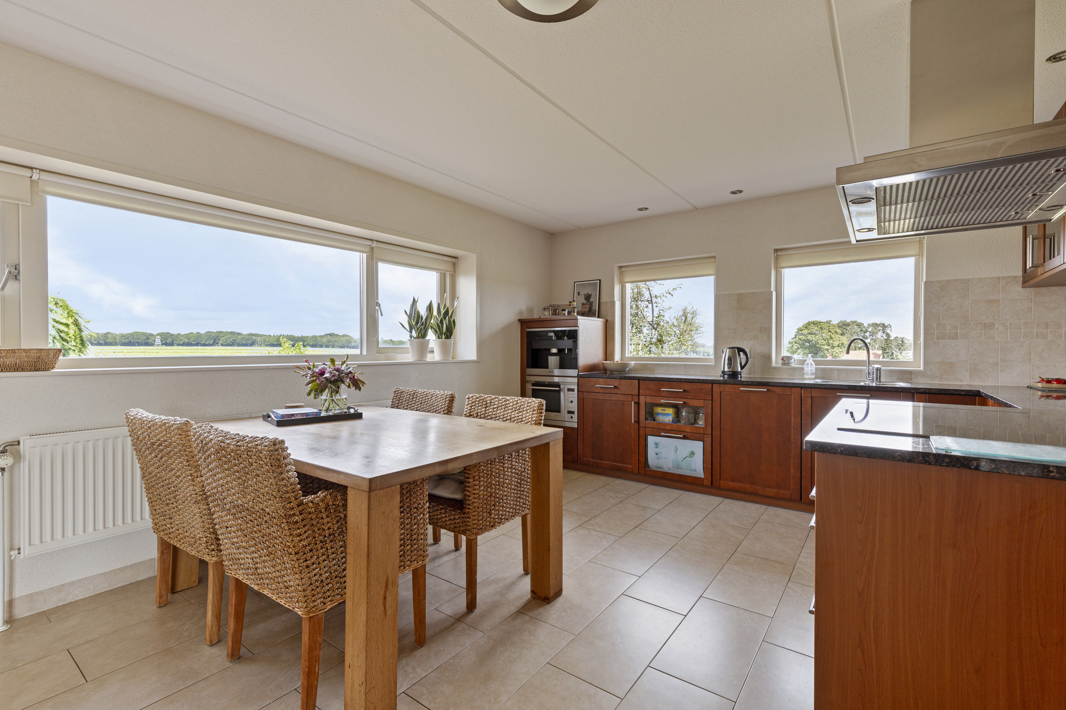 The kitchen is open, but because of its location in the program, overlooking the garden and the historic ash landscape, it has an atmosphere all its own. The fronts are walnut and the granite countertop is primal. Everything is there, from all desirable built-in appliances like dishwasher, fridge-freezer and combination microwave to a Miele coffee maker that will have you whipping up coffee, cappuccino, latte and tea in no time.