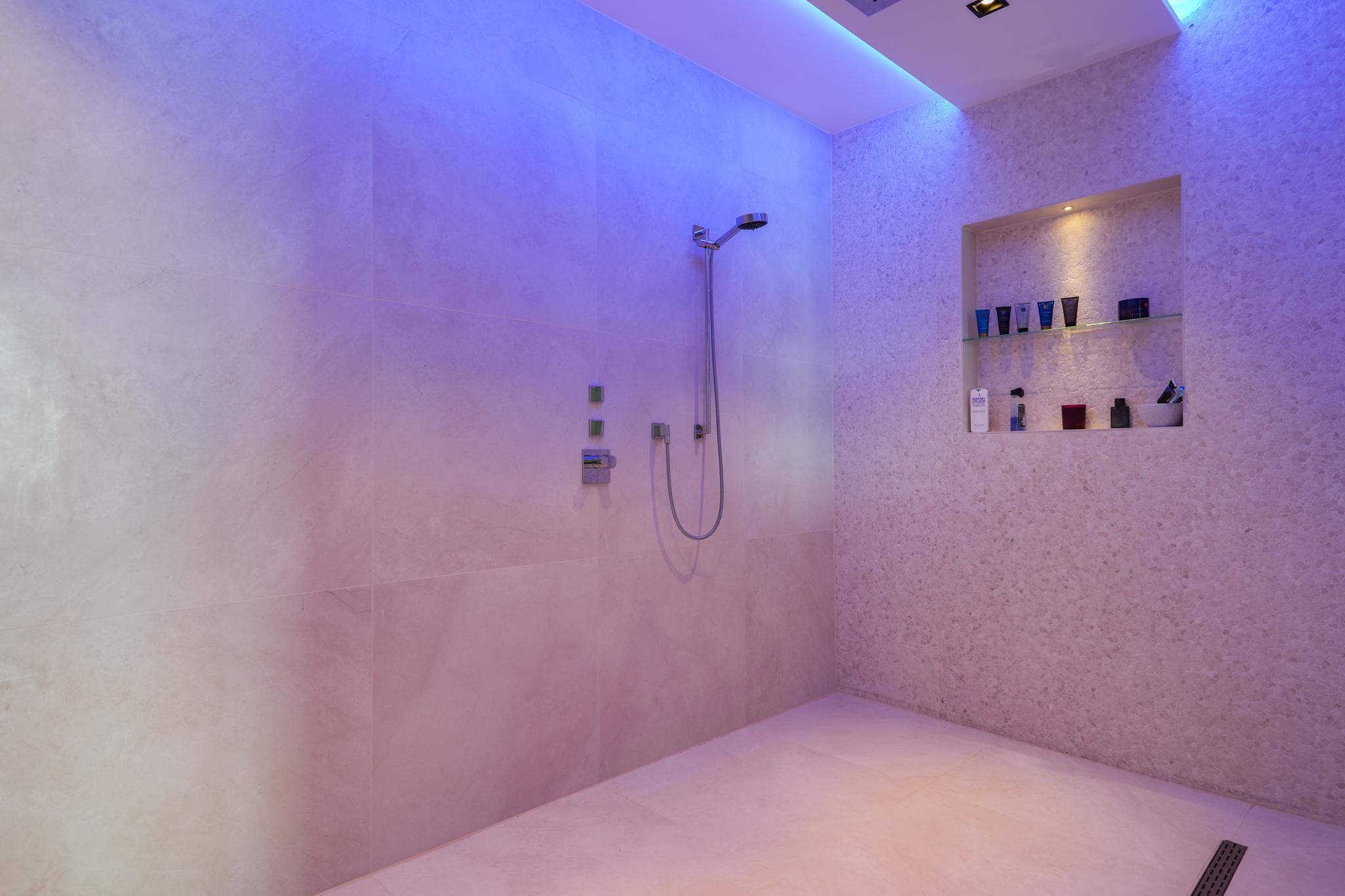 The interior design was done by high-end interior design specialist Pieter Laureys in a global, very luxurious and timeless style. In terms of color and design, every detail is perfectly aligned; this is clearly reflected in the extremely luxurious kitchen/lounge and the seamless wall unit with fitted appliances equipped with home automation technology.