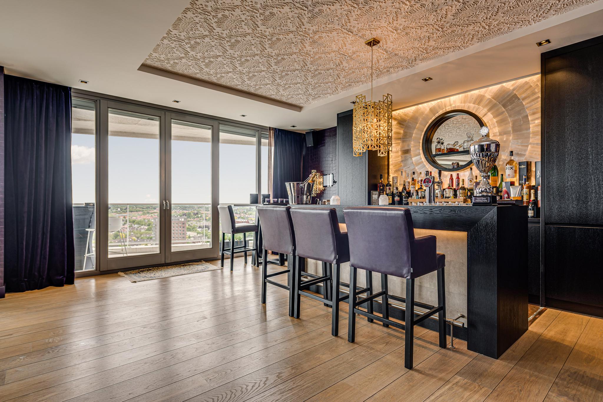 • Lounge area with an inviting bar, with a large wine/display cupboard, ice cube refrigerator, bar refrigerator, professional draft system and a high-end audio system with a B&O amplifier/mixing panel.