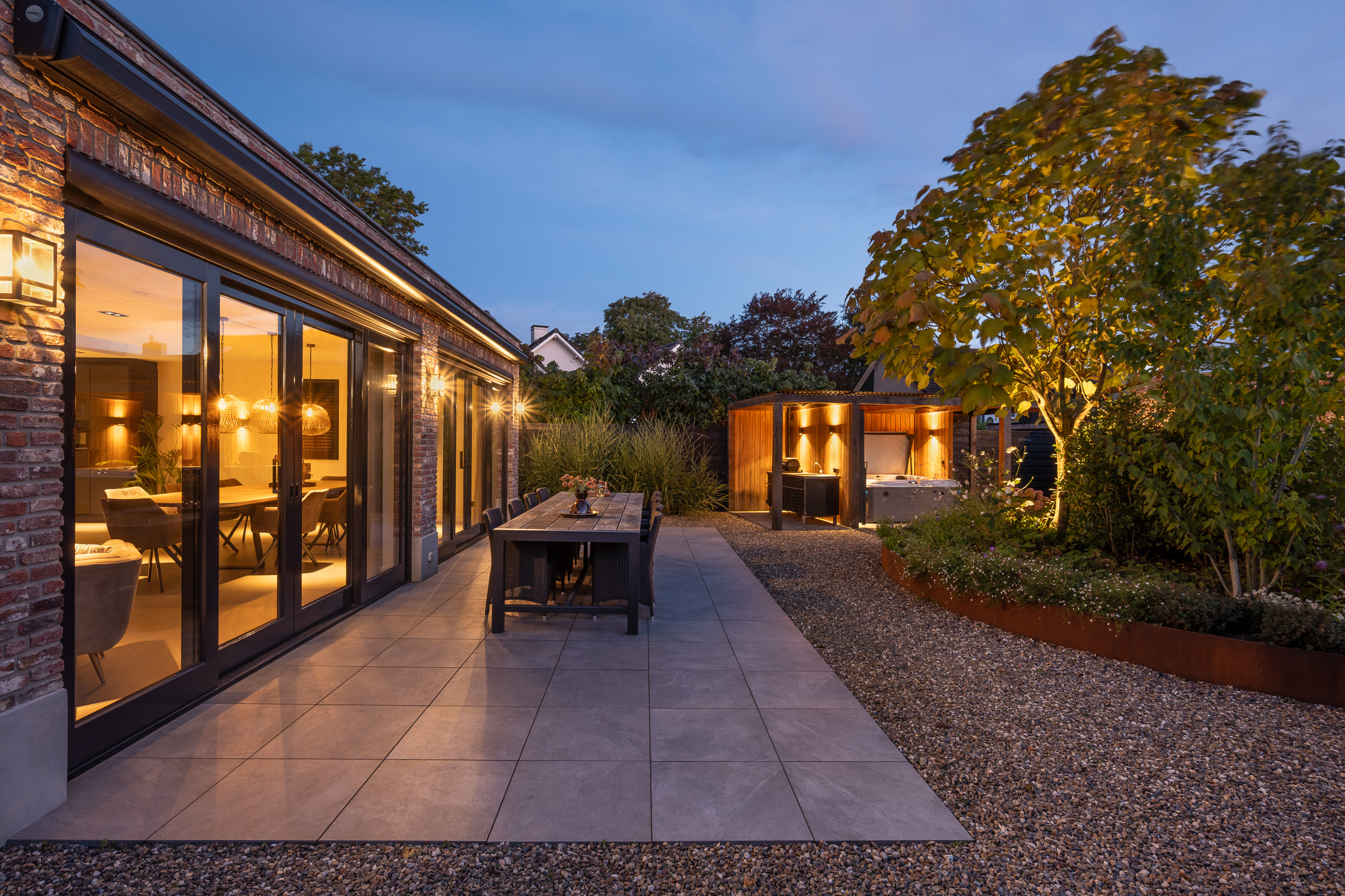The garden has been professionally designed by an architect and offers a high degree of privacy. It includes a jacuzzi and a covered outdoor kitchen, allowing residents to fully enjoy outdoor living throughout the seasons.
