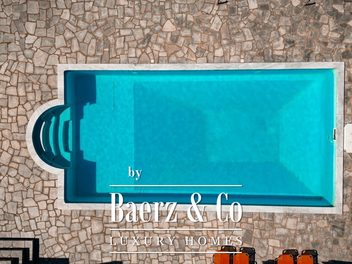 The outdoor space features paved courtyards, a landscaped garden with a BBQ, a covered dining area, and a 50 sq.m. pool, ideal for relaxation or entertainment.