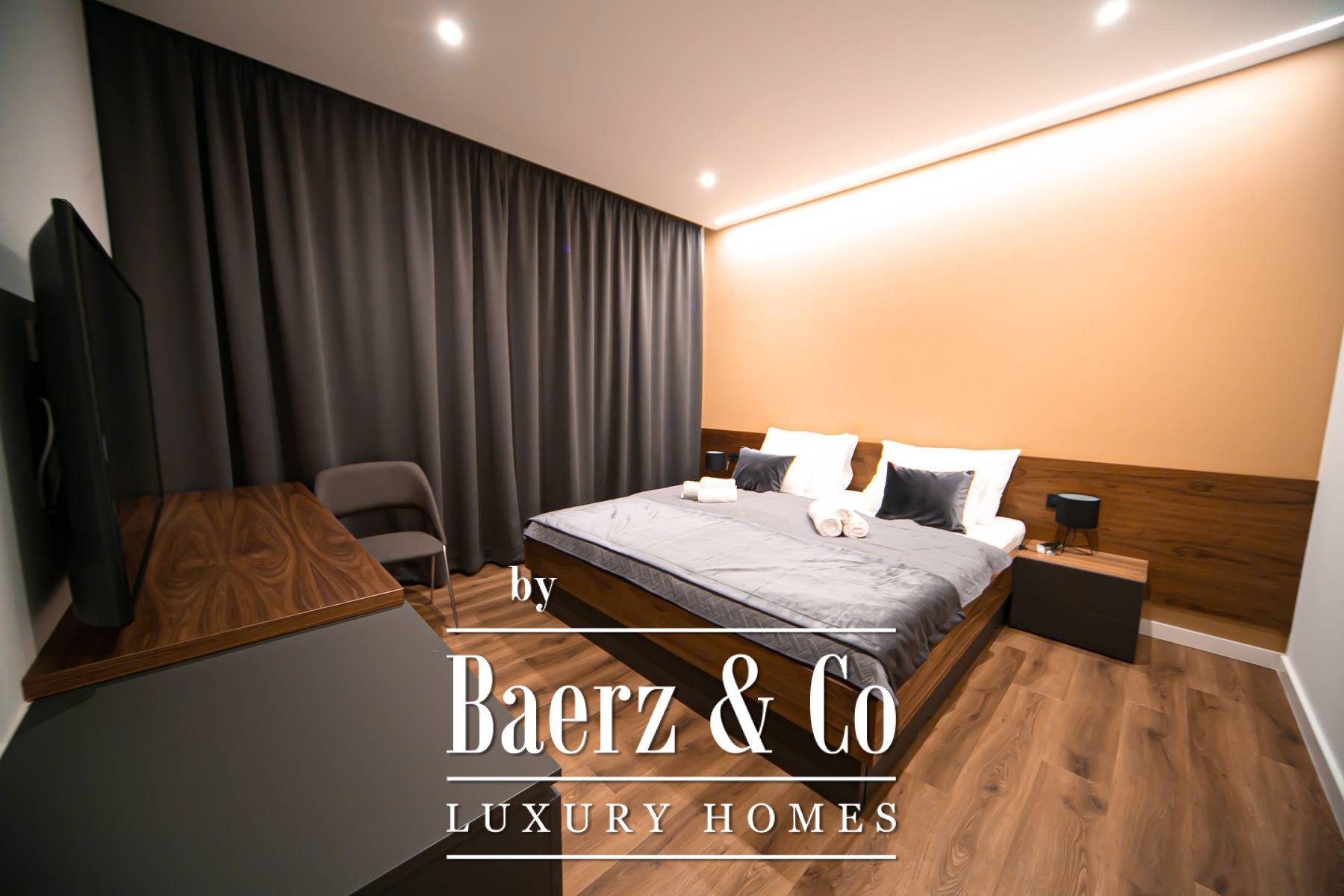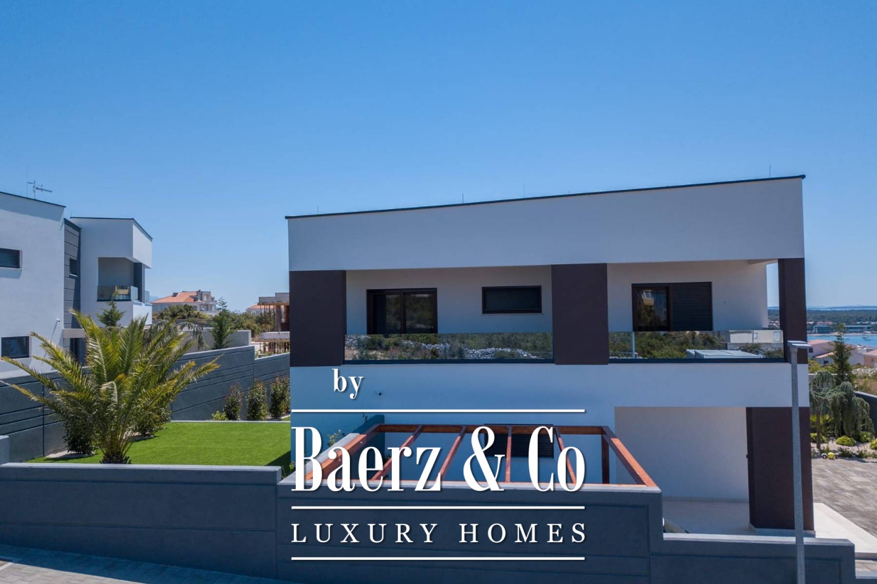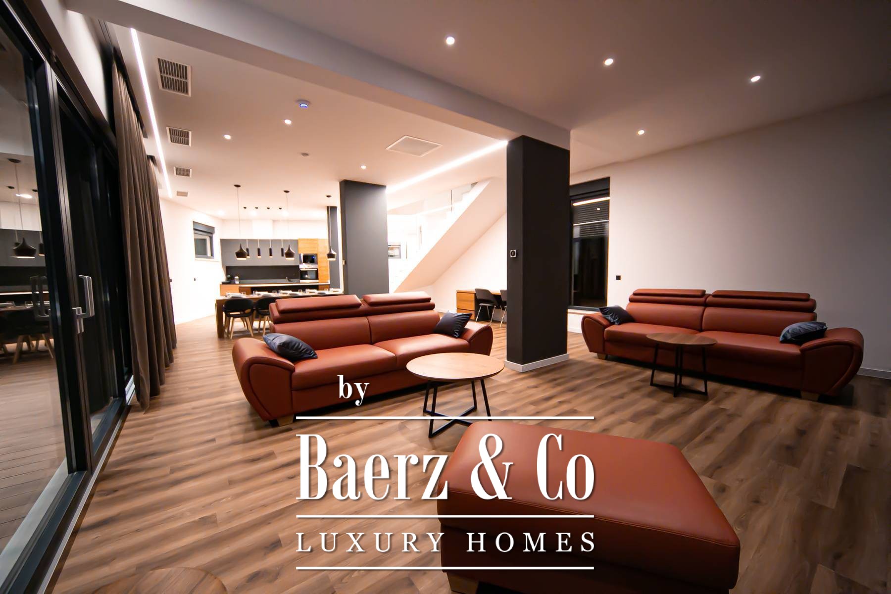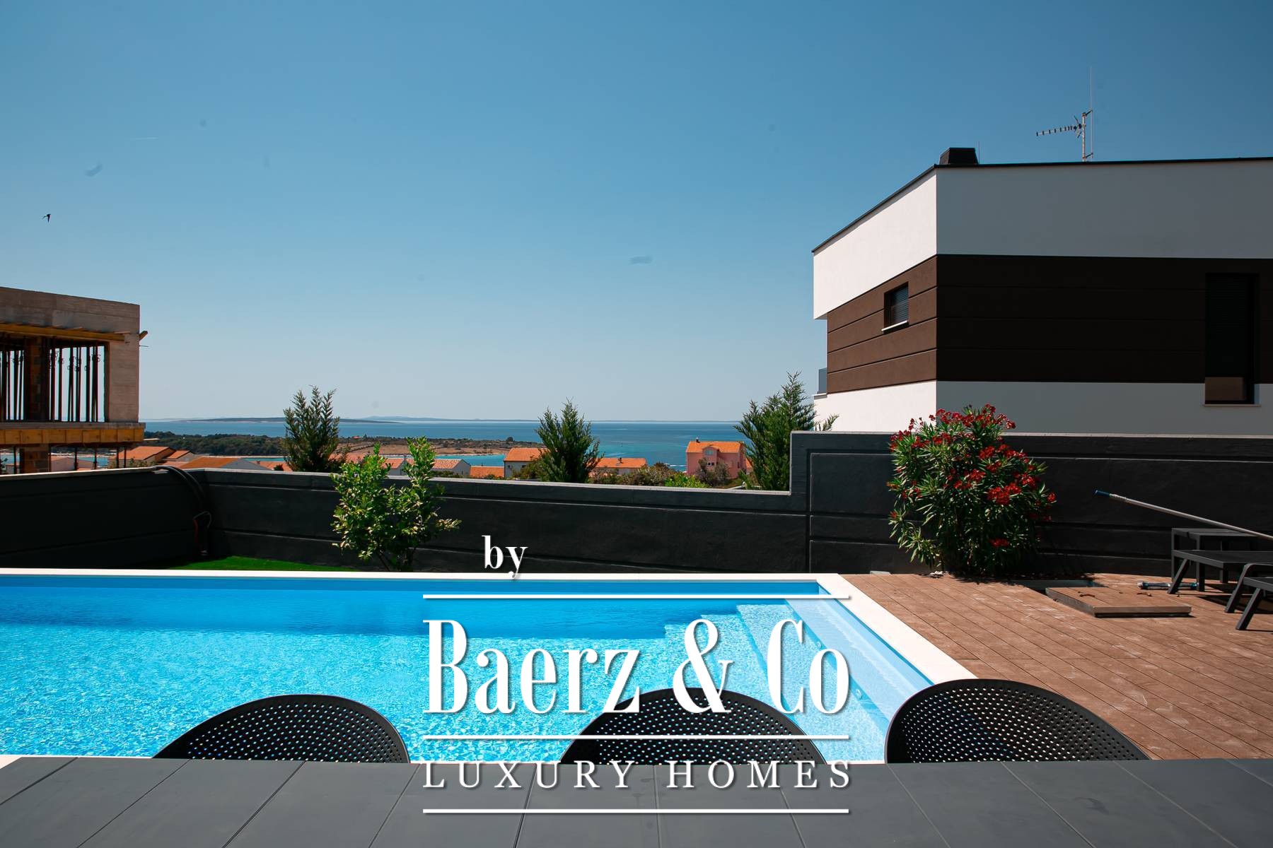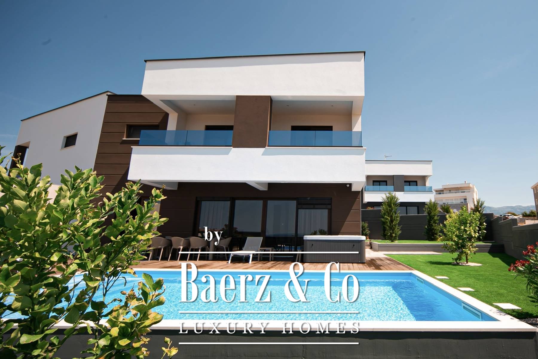 game room, the game room has a PlayStation and a pool table, underfloor heating in the bathrooms and a Daikin air conditioning system, video surveillance and an alarm, the house has lifting sliding walls, electric blinds and blinds, LED lighting, microwave, wine bar... MATERIALS: furniture combined with walnut wood, parquet floor, staircase combined with glass, Brač stone and wood and LED lighting, interior carpentry: veneered doors with hidden hinges, details in the house are covered with Brač stone, terraces are covered with decking, external glass fences, each house is surrounded by a fence (complete user privacy)... All other information on request.