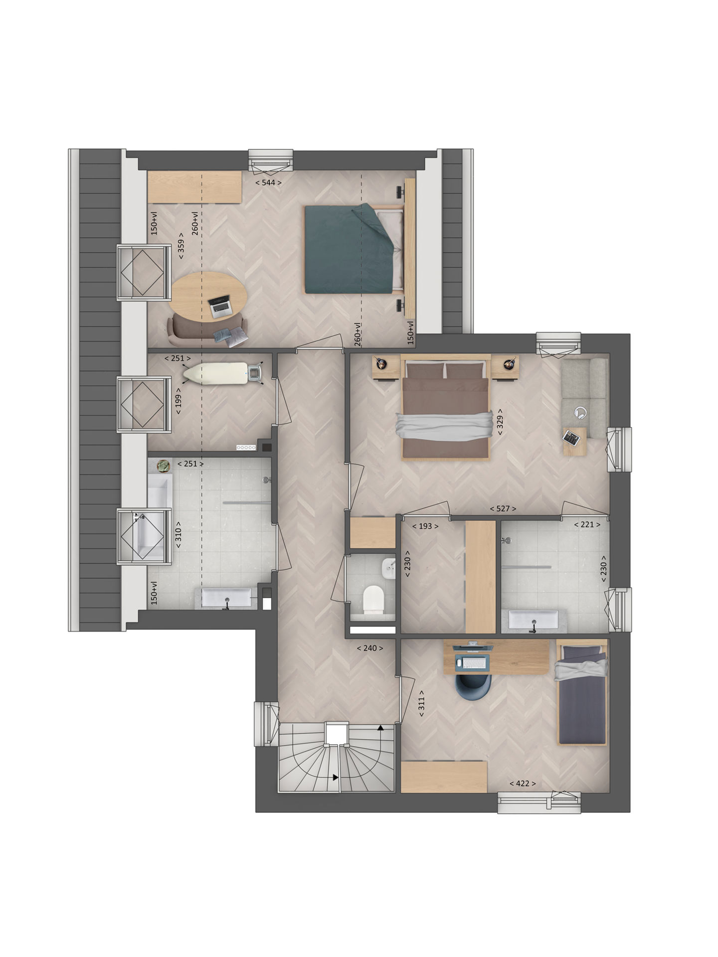 Een karakteristieke woning met houten accenten en opvallend veel raampartijen. Landelijk en toch modern. Even binnenkijken? Via de voordeur stap je de hal binnen die de begane grond als vanzelf verdeelt. In het open woongedeelte staan koken, eten en wonen gezellig met elkaar in verbinding. Vanuit de keuken heb je toegang tot de ruime tuin op het zuid-oosten en alle extra voorraad sla je gemakkelijk op in de bijkeuken. Zet een lekkere grote eettafel neer voor het hele gezin om lang aan te tafelen. In de woonkamer is genoeg plek voor een ruime zithoek. Hadden we de extra werkkamer al benoemd? Deze is te bereiken vanuit de woonkamer of gang en is ook om te toveren tot een fijne speelkamer voor de kinderen. De keuze is aan jou!