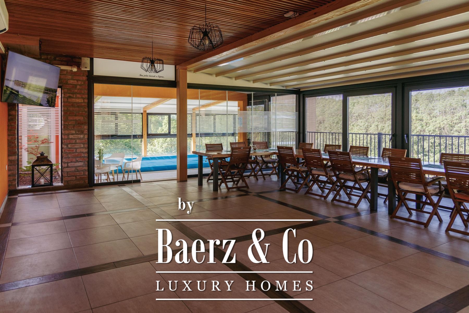 The property unfolds over three floors. The basement is dedicated to leisure and hospitality, featuring a wine cellar, a tasting room evocative of a private tavern, a bedroom with en suite, separate male and female sanitary rooms, utility areas, and a pool maintenance plant. The ground level hosts a generous living room seamlessly joined by a dining area, two kitchens, a summer kitchen with barbecue and baking oven, three bedrooms with private baths, additional guest facilities, and a 72 m² gathering space extending to an indoor pool of 25 m².