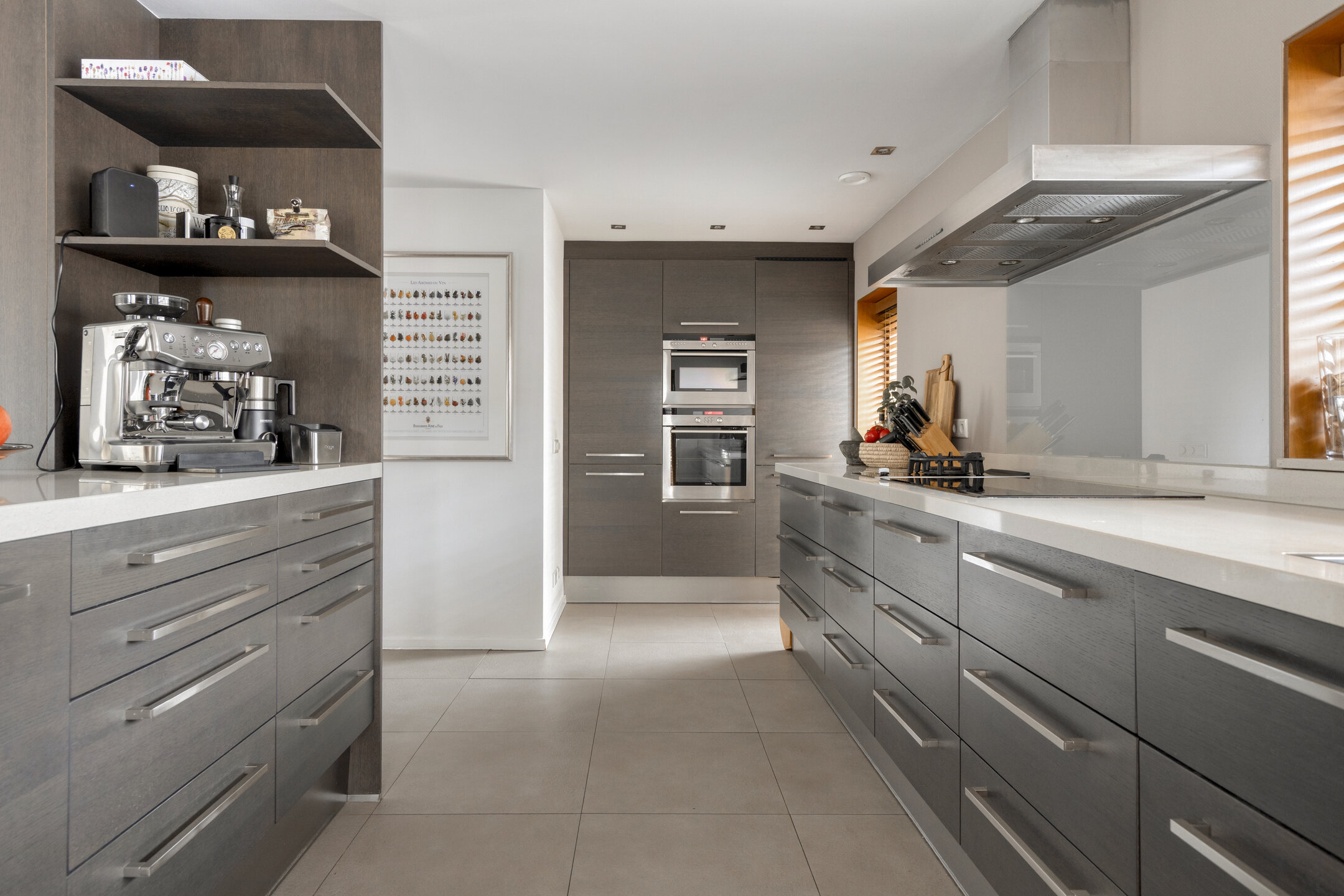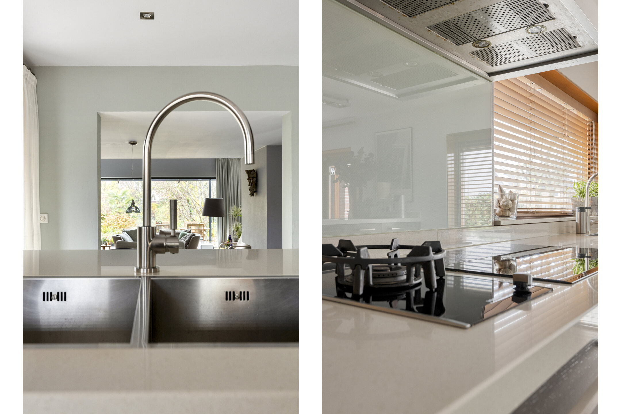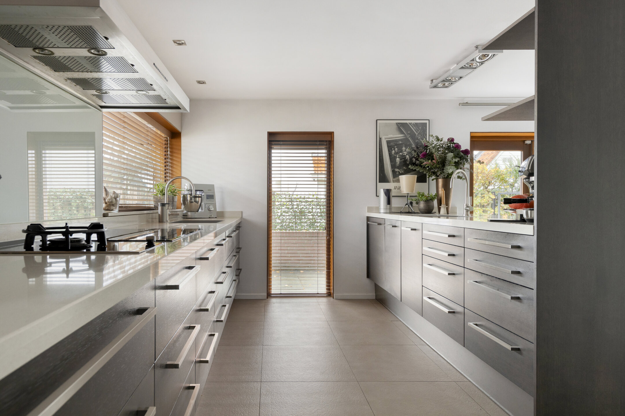From the hall, you enter the modern, spacious kitchen, which includes a breakfast bar. The kitchen is equipped with various built-in appliances, including an induction hob with a separate gas wok burner, a double sink, dishwasher, oven, microwave oven, and a large refrigerator. The open connection to the living room makes it a practical and pleasant living space.