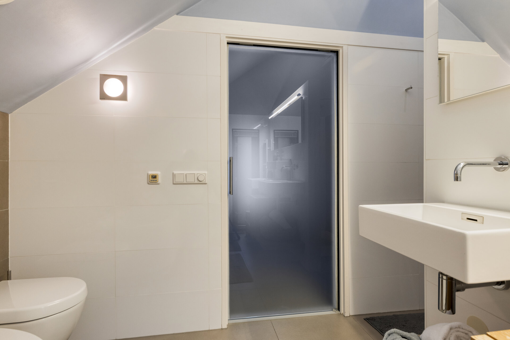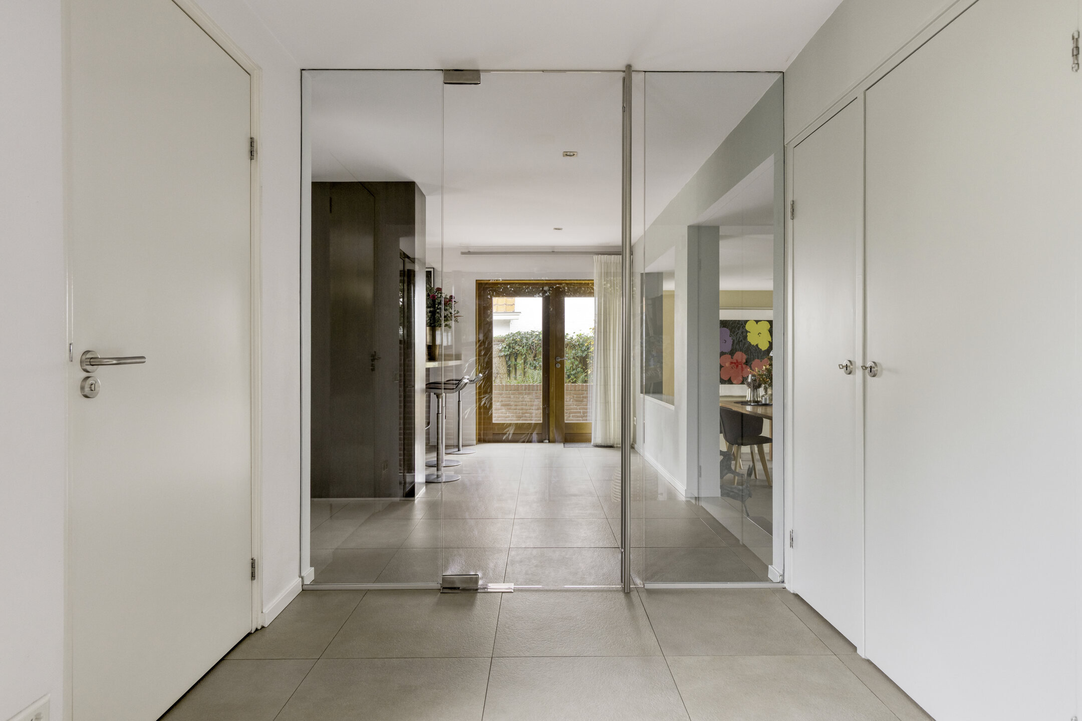 The entrance to this architect-designed house is located in a side extension. This extension features ample glass and a spacious layout, befitting a modern villa. The entrance provides access to the toilet and the stairs to the first floor.