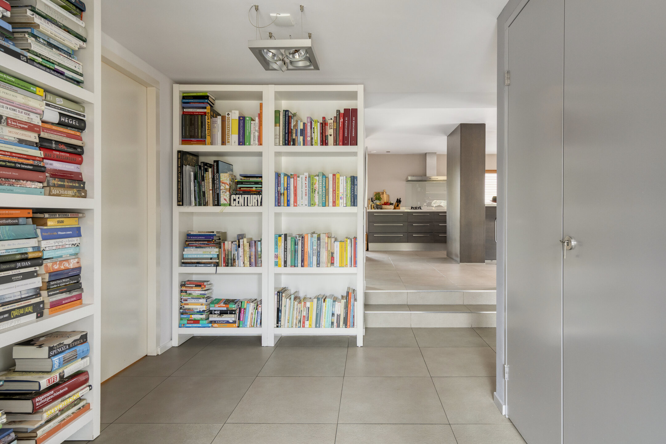The living room is a remarkably spacious and bright space, thanks in part to the large windows in the renovated sliding doors and the high ceilings overlooking the rooms on the first floor. The fireplace in the center of the living room adds to the ambiance. Located at the rear of the house, the living room opens directly onto the garden. Adjacent is an additional room that could serve as an office, playroom, TV room, or a spacious bedroom with a bathroom. The necessary connections for this are already in place. Finally, a spacious storage room, ideal as a pantry and with space for an extra refrigerator and freezer, is accessible through the living room.