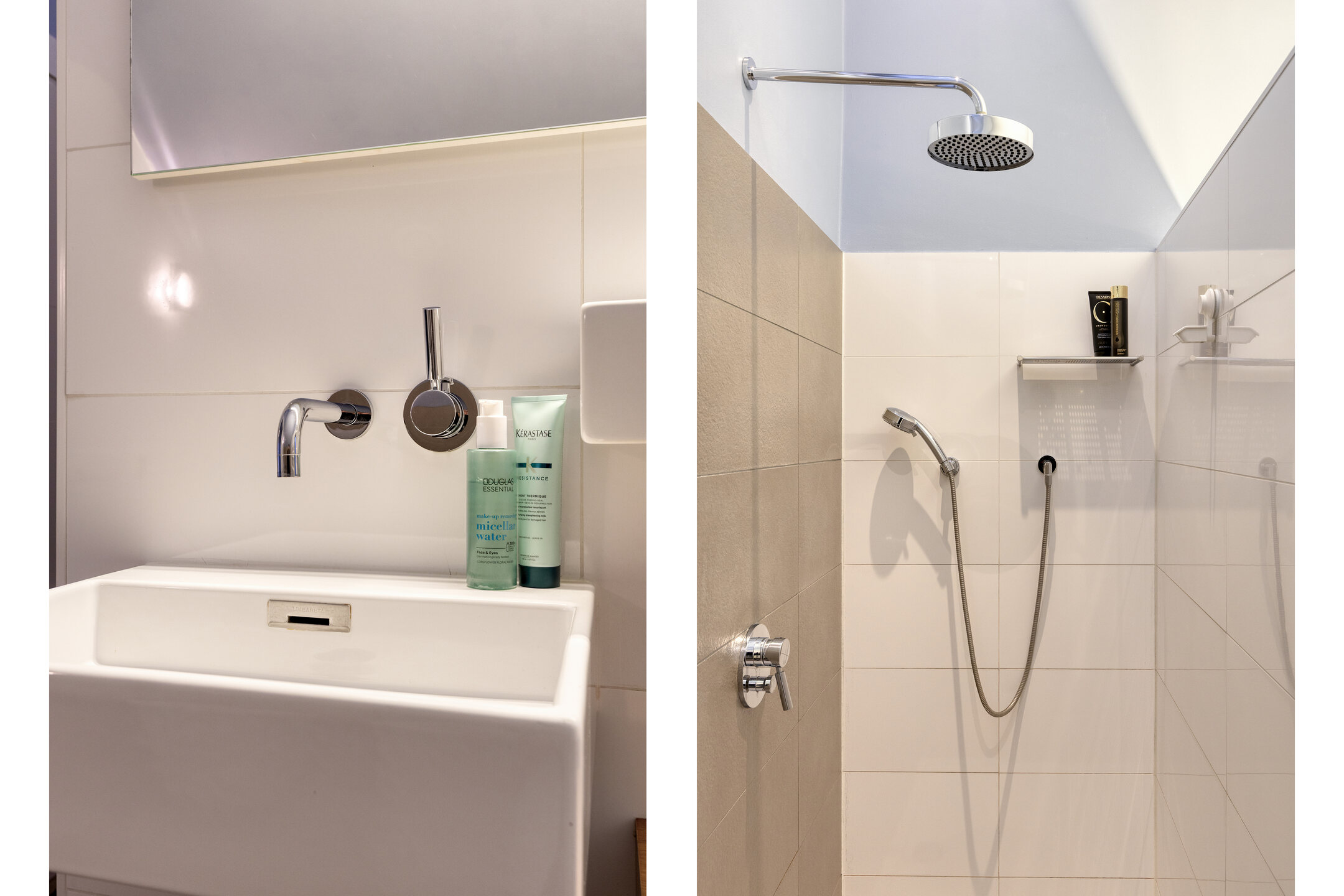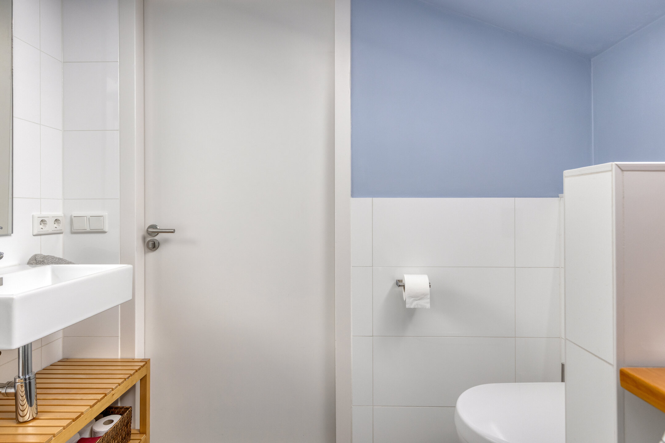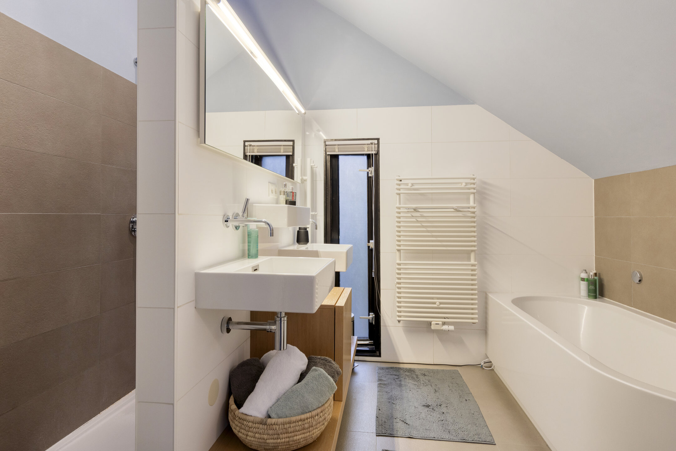 On the first floor, the landing leads to two spacious bedrooms. The master bedroom has an en-suite bathroom with a bathtub, walk-in shower, toilet, and sink. The second bathroom is accessible via the landing and is equipped with a shower, toilet, and connections for a washing machine and dryer. There is also a separate storage room on this floor. The mezzanine-like connection to the living room creates an extra sense of space and connection between the two floors.