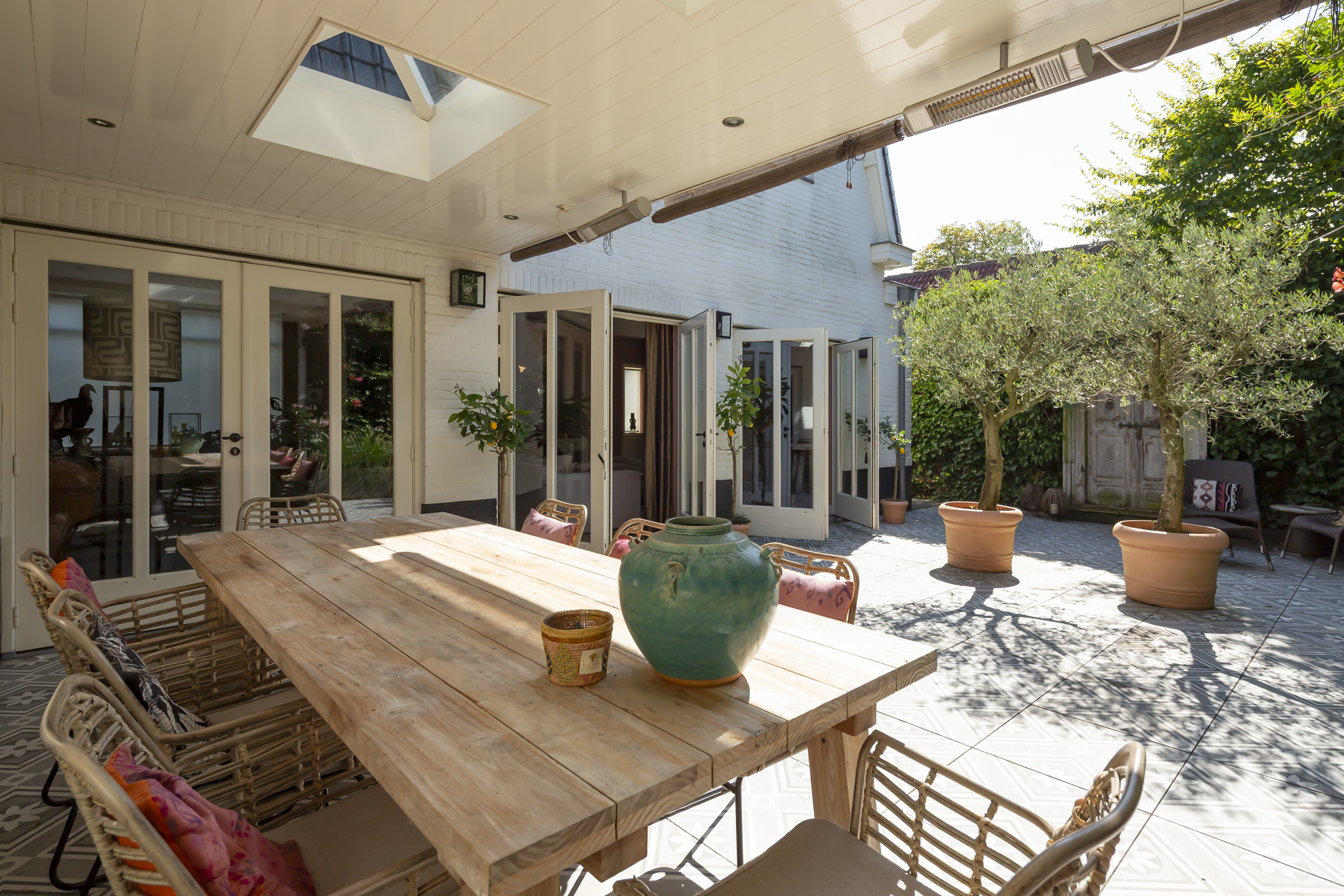 Deze unieke woning heeft niet één maar twee tuinen. De patio/stadstuin heeft een ruim overdekt terras en is voorzien van 2 grote lichtkoepels. Het hele jaar door is het hier goed vertoeven. Er ligt een mooie bestrating in, en met de aankleding van fraaie potten geeft het deze beschutte tuin een mediterraan sfeertje.