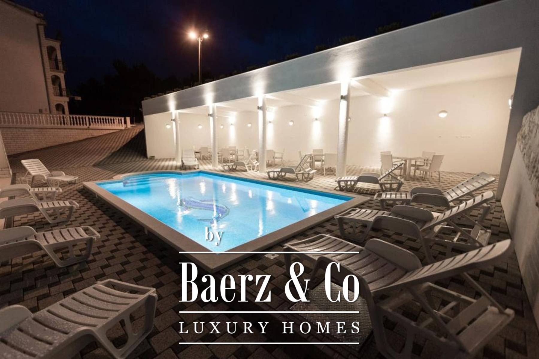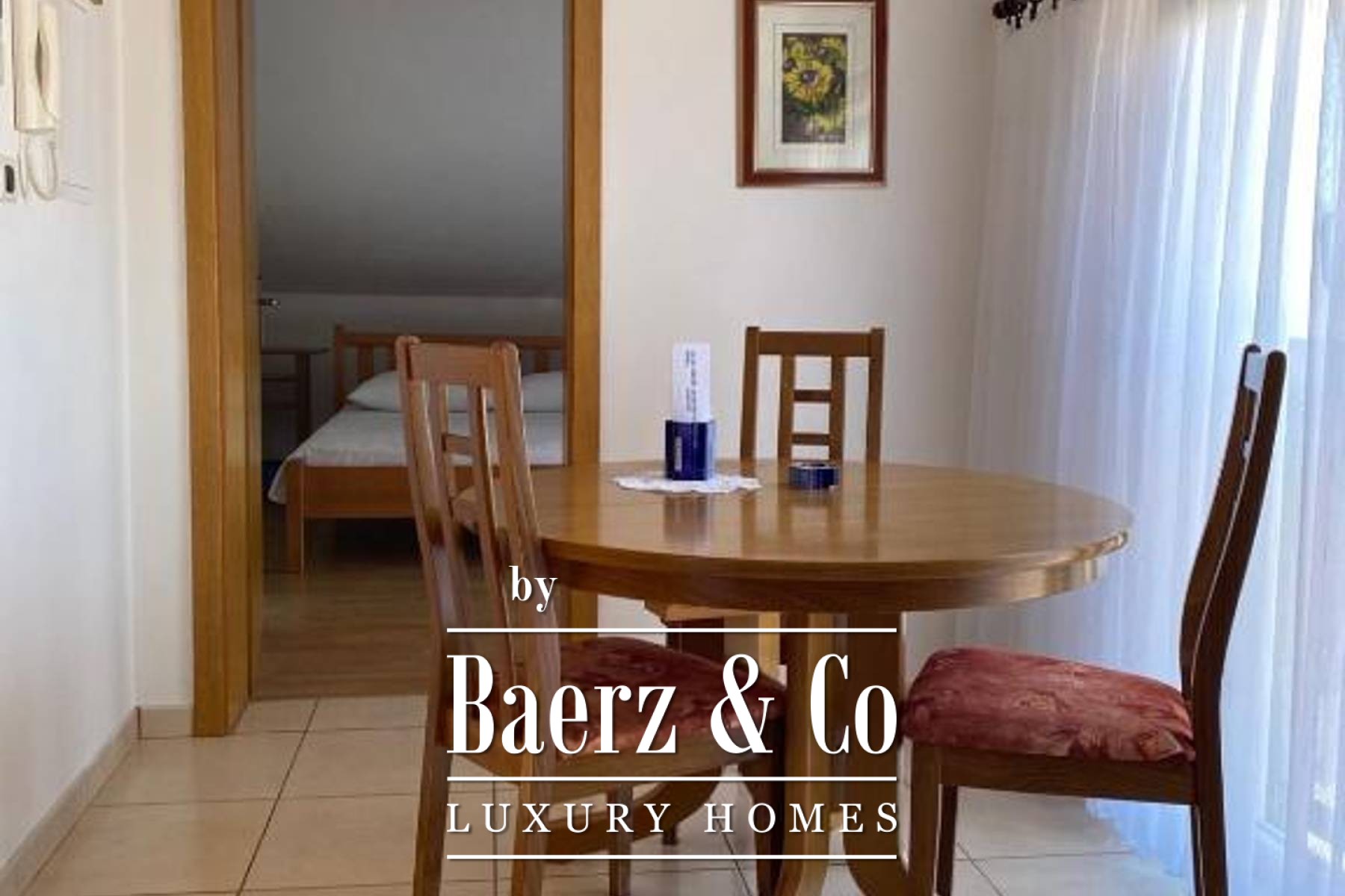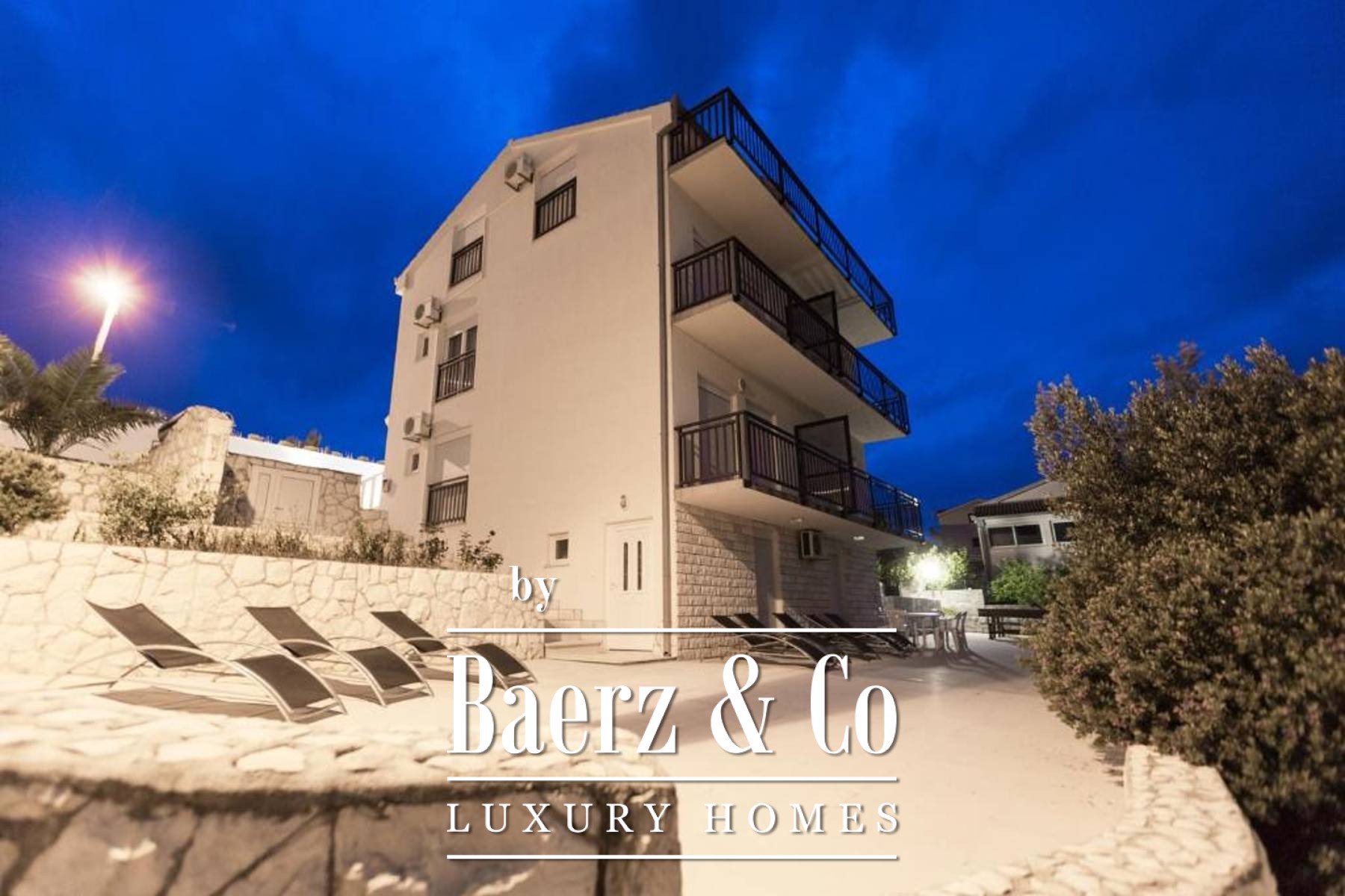 Apartment house with seven separate units overlooking the sea. It consists of a basement, ground floor, first floor and attic. On the ground floor and the first floor there are four equally equipped apartments, each with two bedrooms, and each apartment, with an extra bed, can accommodate 5 people. In the basement there is a one-room apartment equipped and furnished. In the attic there are two smaller, one-room apartments, each of which can accommodate 3 people. In front of the house is a heated swimming pool of 32 m2, around which deckchairs are placed. There is a covered area in front of the pool, where there are tables and chairs for outdoor activities. In front of the lower part of the house is a large terrace, where there are also deckchairs for sunbathing. In one part of the plot there are two barbecues and large tables for socializing outside the apartment. Stone slabs have been placed