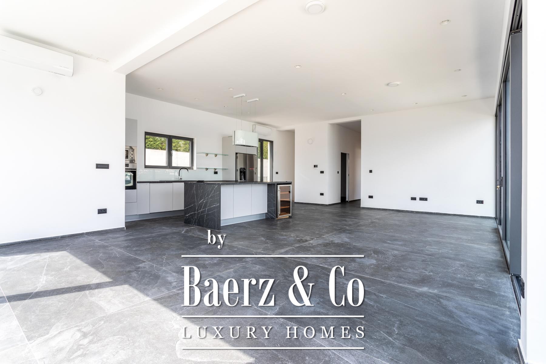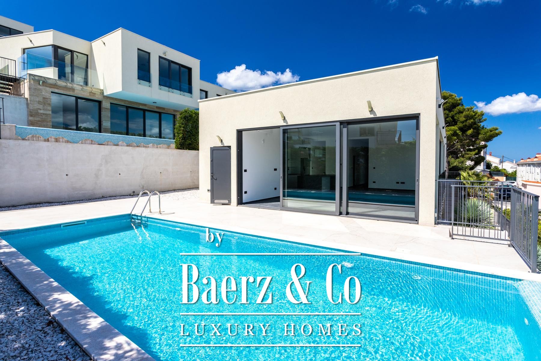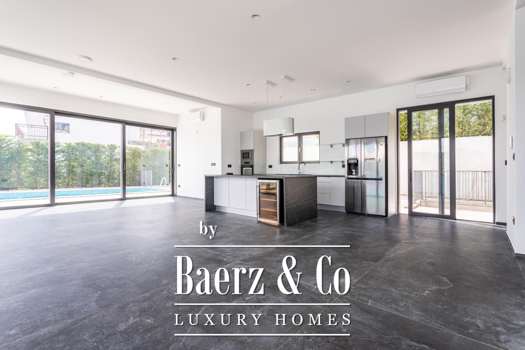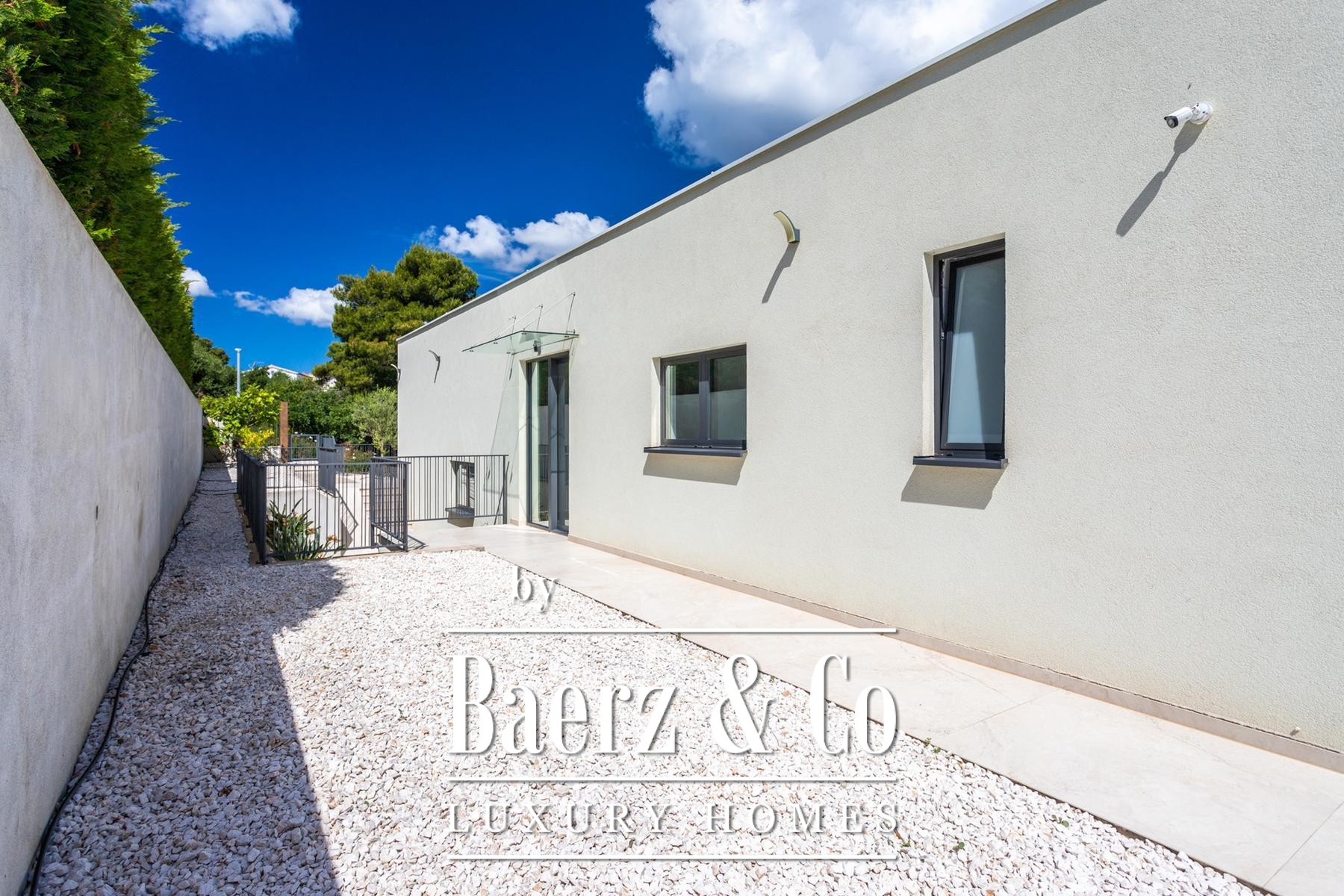 A modern two-story villa with a living area of 315 m2, located not far from the sea, on a plot of 697 m2. It consists of a large living room, a fully equipped kitchen, 4 bedrooms, 6 equipped bathrooms and a garage big enough for two cars. The spacious terrace on the ground level is ennobled by an illuminated heated pool.