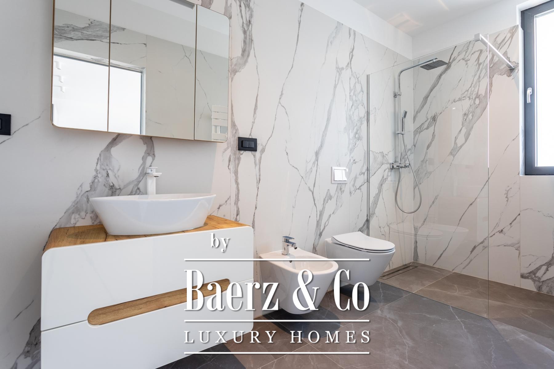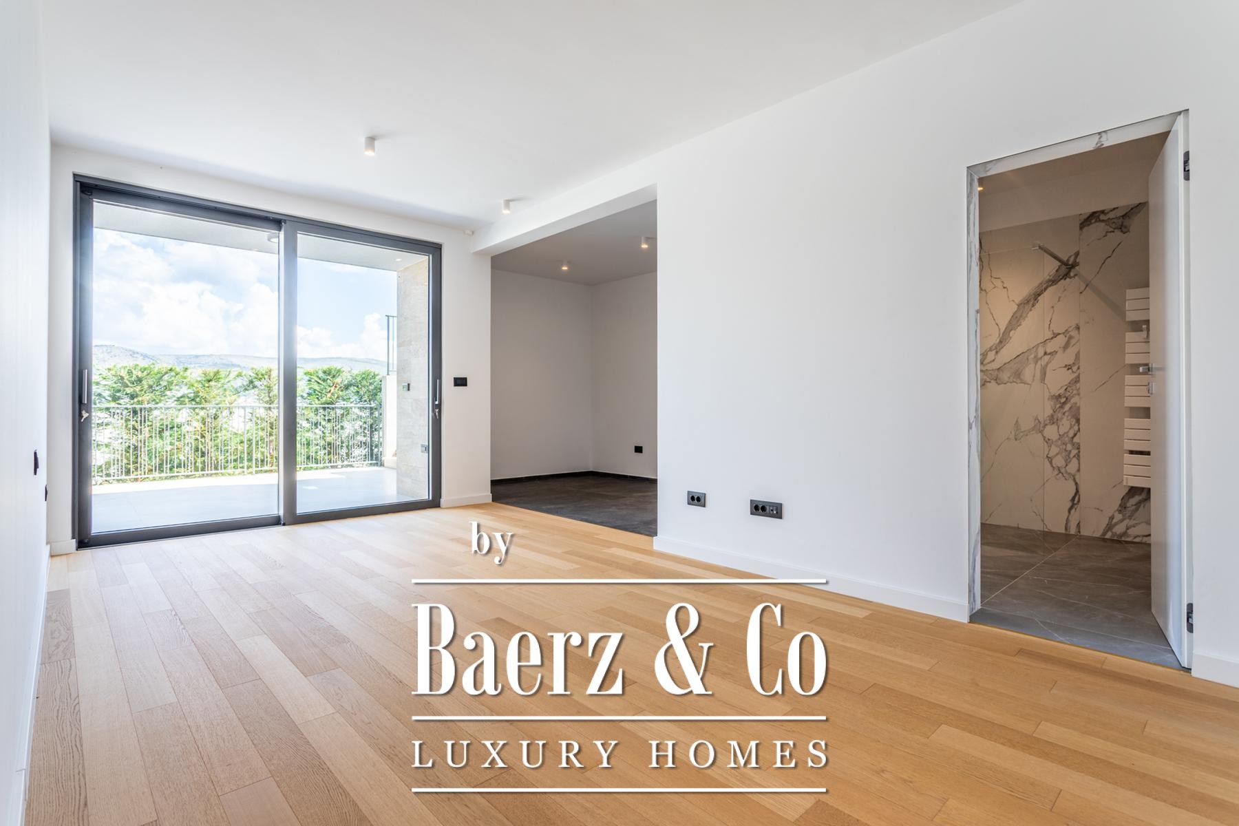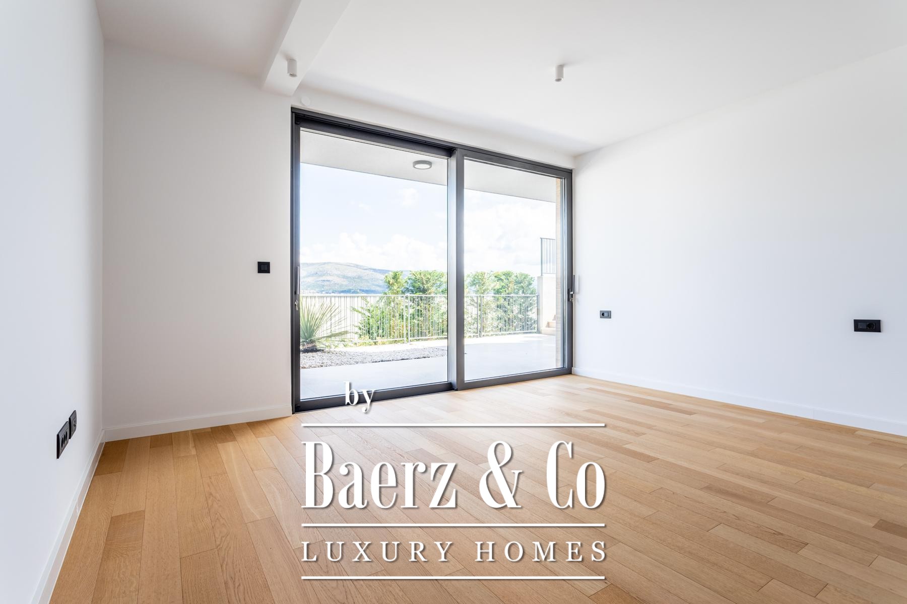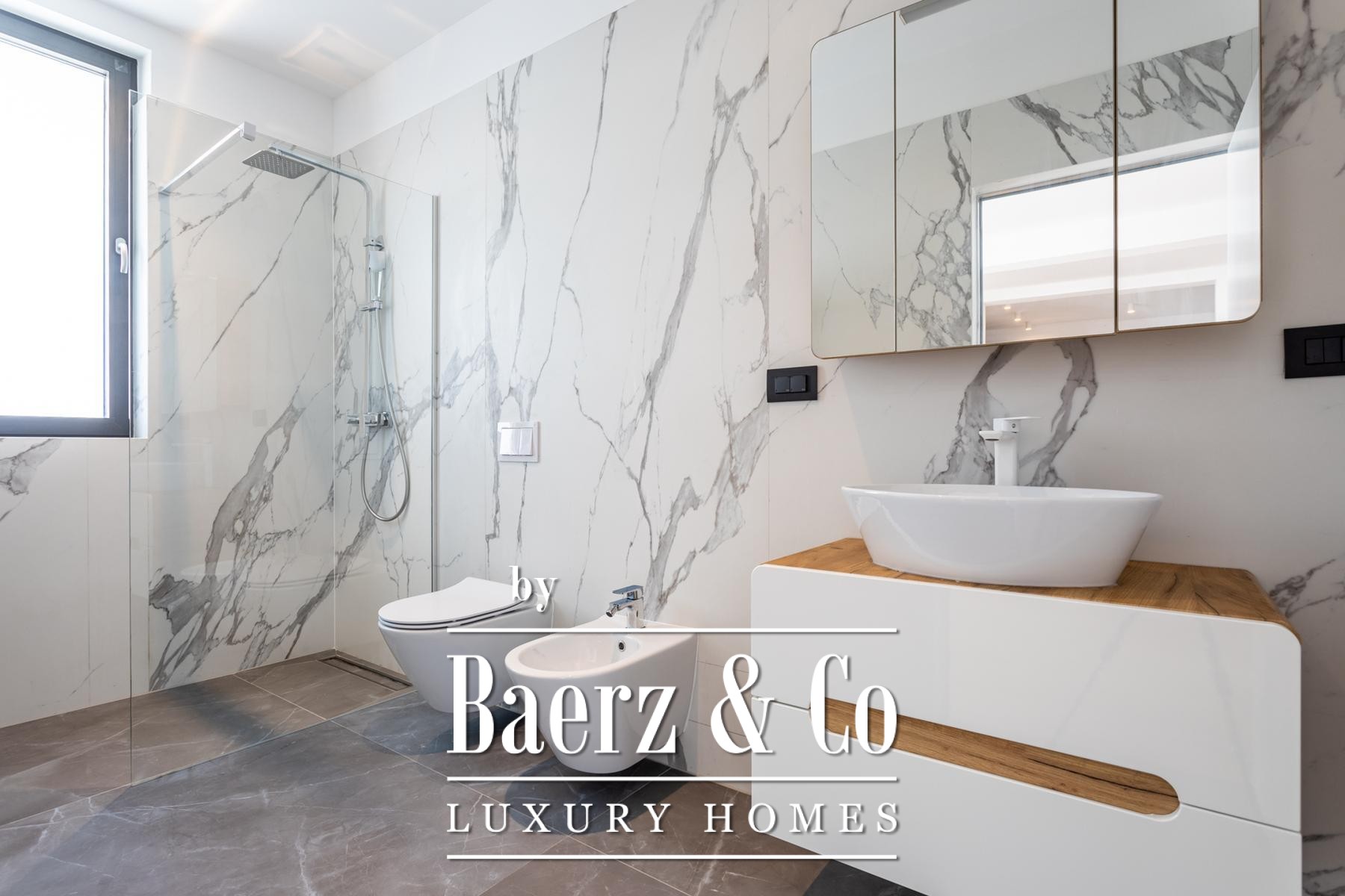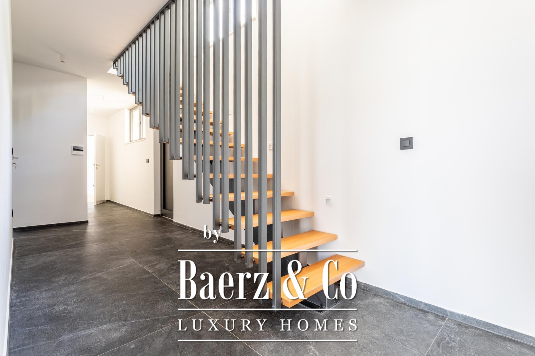 A modern two-story villa with a living area of 315 m2, located not far from the sea, on a plot of 697 m2. It consists of a large living room, a fully equipped kitchen, 4 bedrooms, 6 equipped bathrooms and a garage big enough for two cars. The spacious terrace on the ground level is ennobled by an illuminated heated pool.