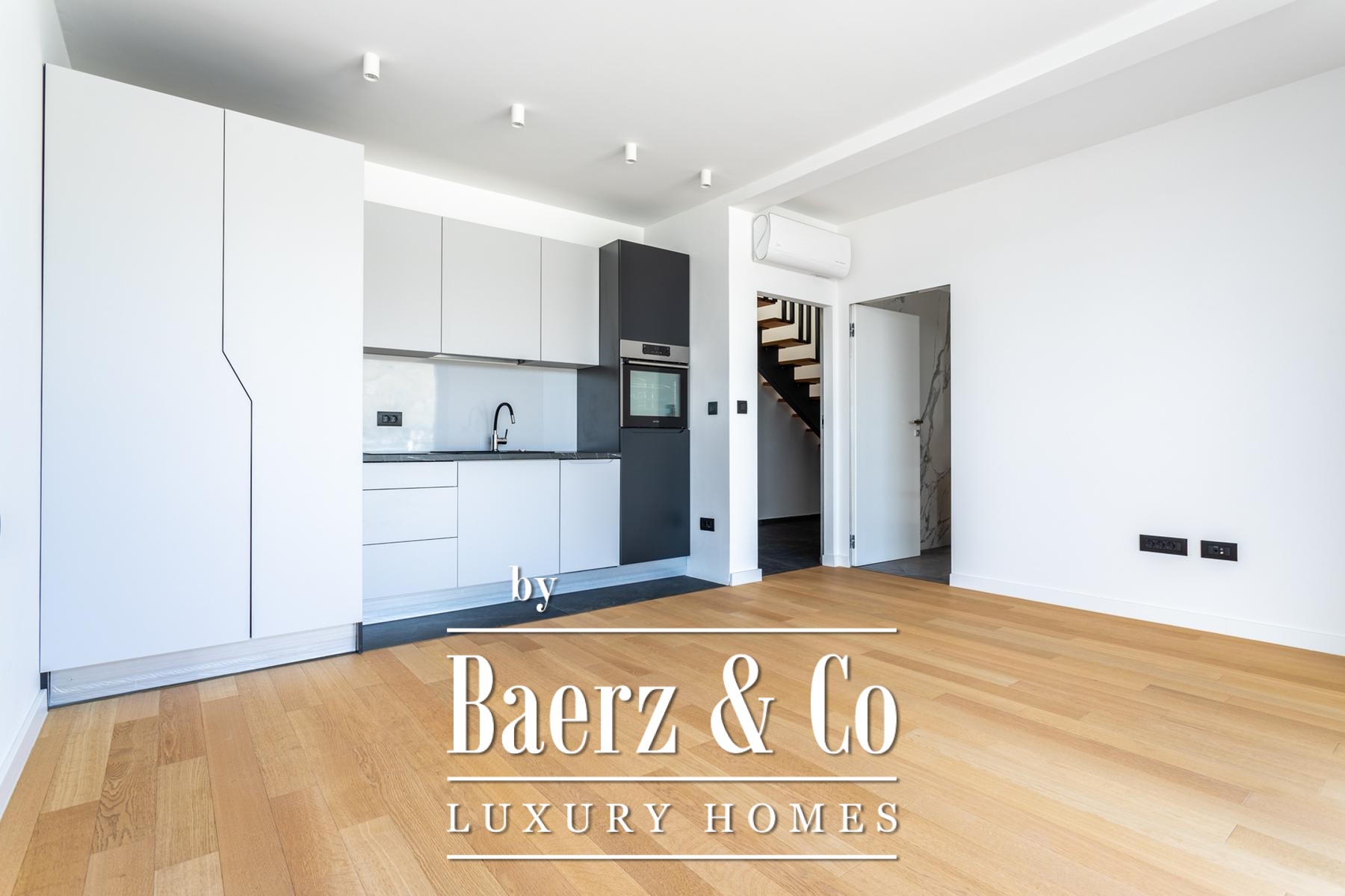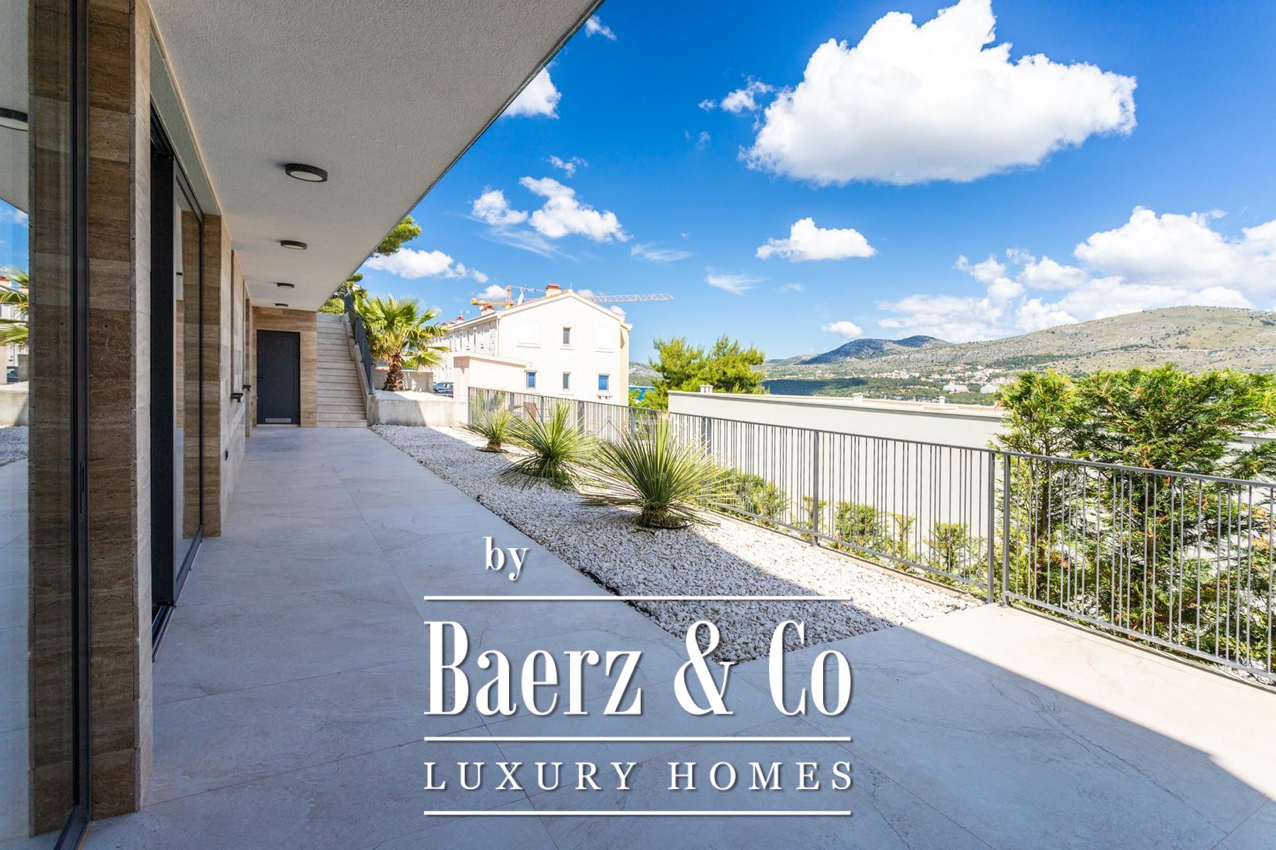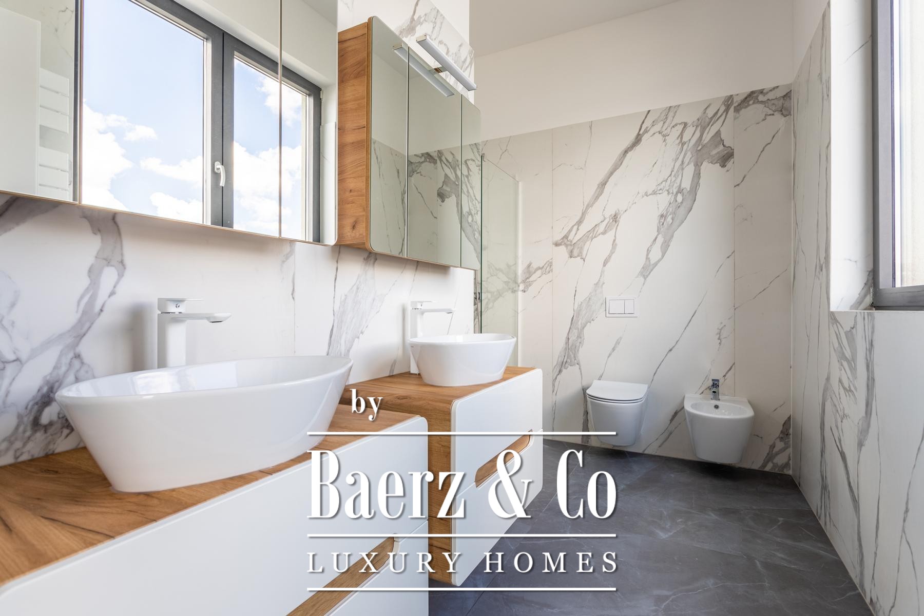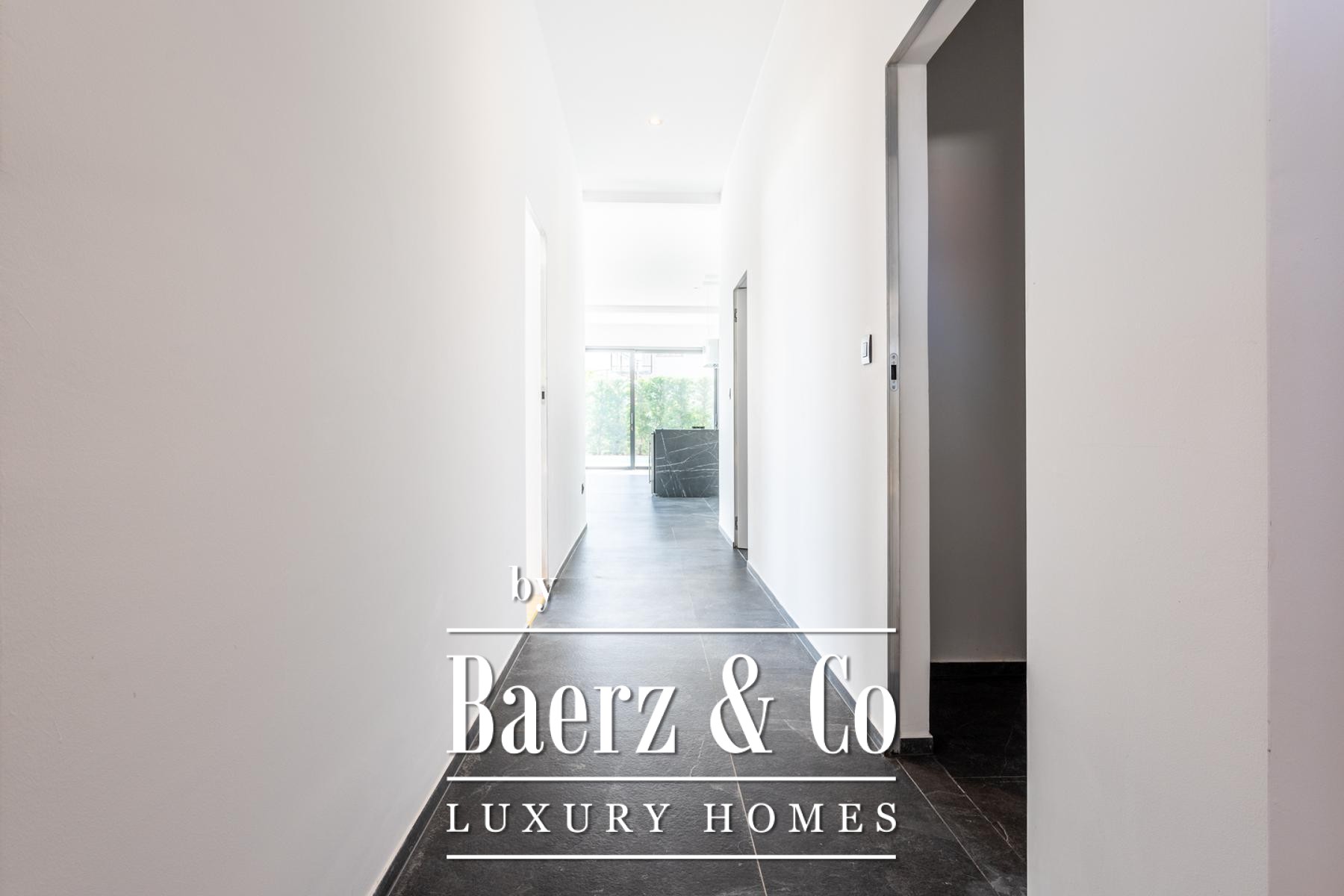 A modern two-story villa with a living area of 315 m2, located not far from the sea, on a plot of 697 m2. It consists of a large living room, a fully equipped kitchen, 4 bedrooms, 6 equipped bathrooms and a garage big enough for two cars. The spacious terrace on the ground level is ennobled by an illuminated heated pool.