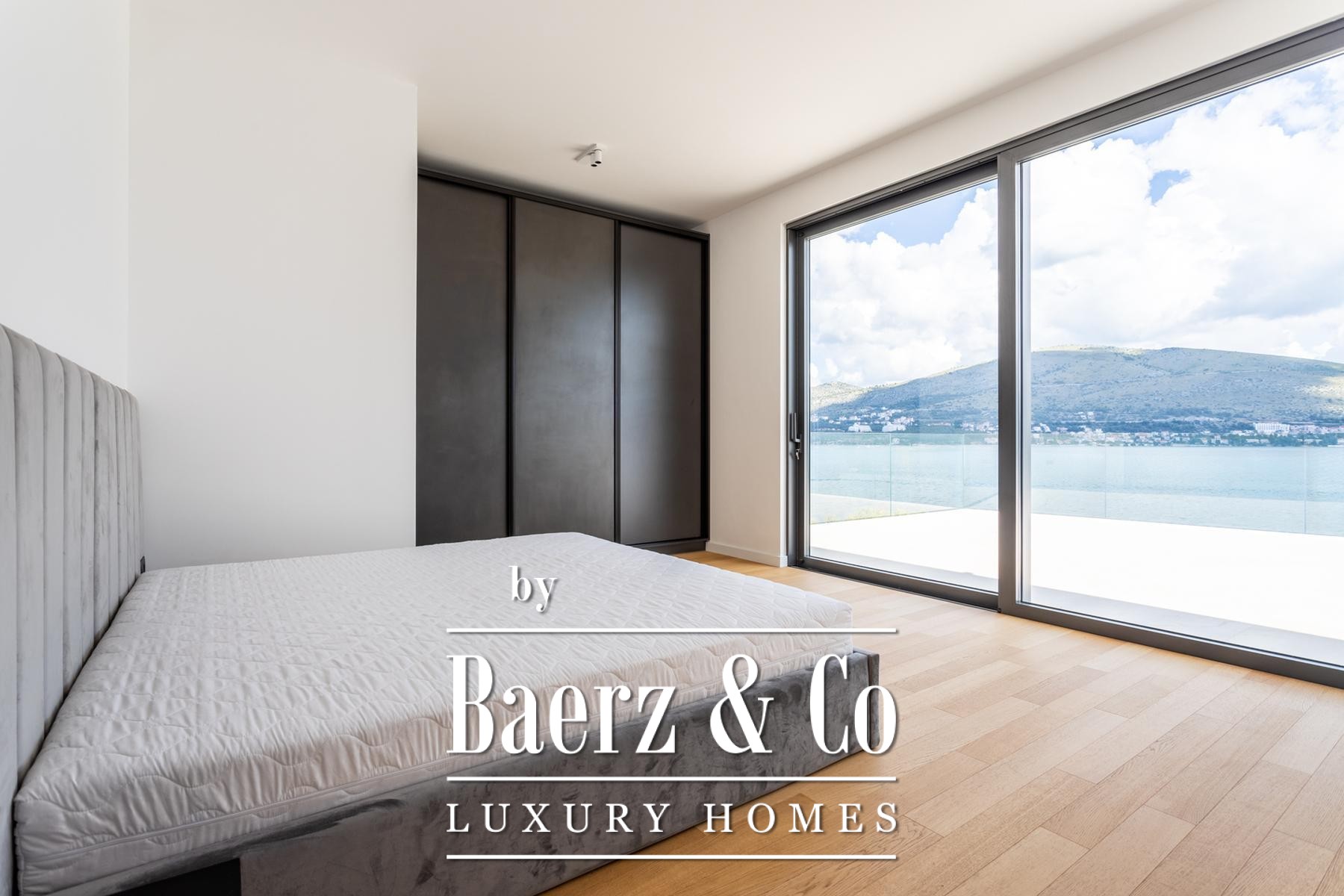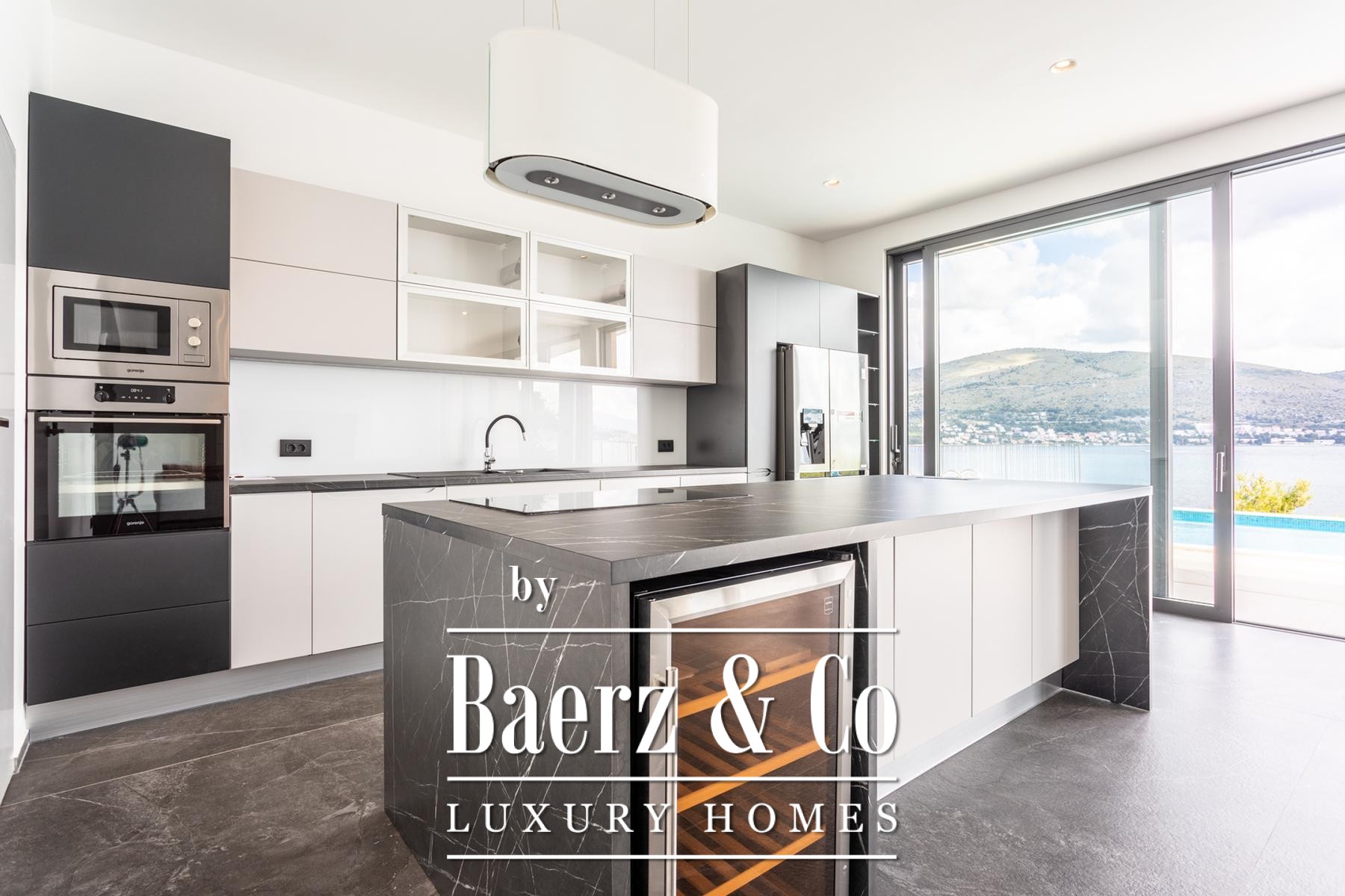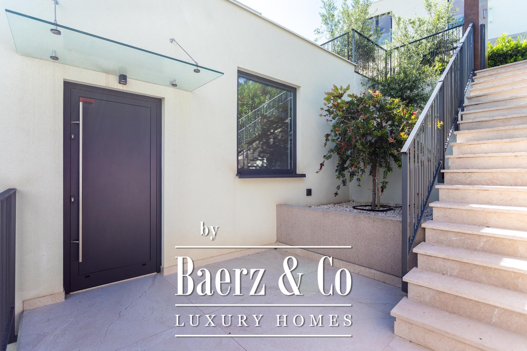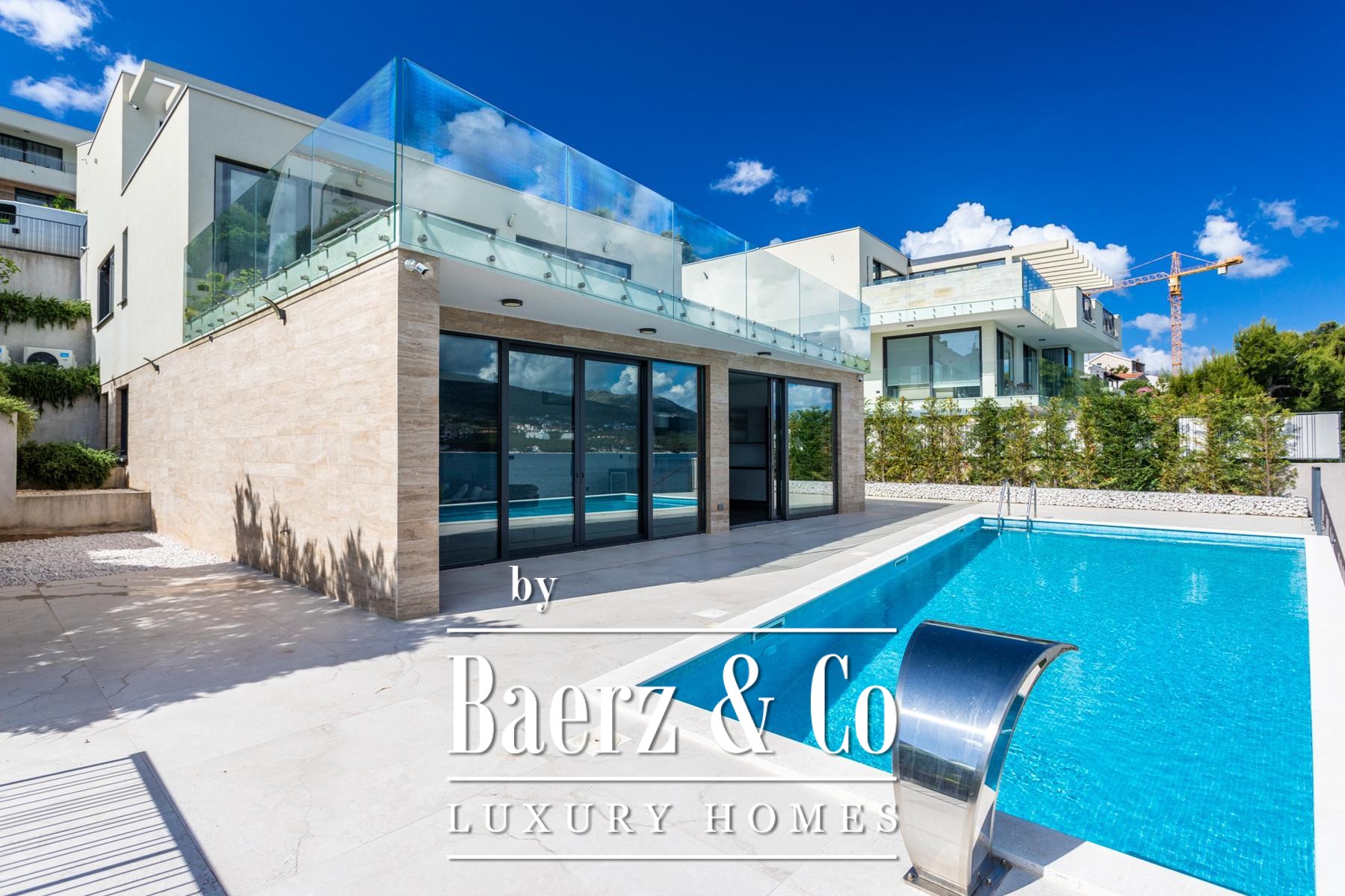 Three-story villa with a living area of 349 m2, located on the first row to the sea. It consists of a large living room, a fully equipped kitchen, five bedrooms, the same number of furnished bathrooms, and a garage big enough for two cars. The terrace on the ground floor is equipped with an illuminated heated pool, while the terrace on the second floor has a jacuzzi. floors are connected by an elevator