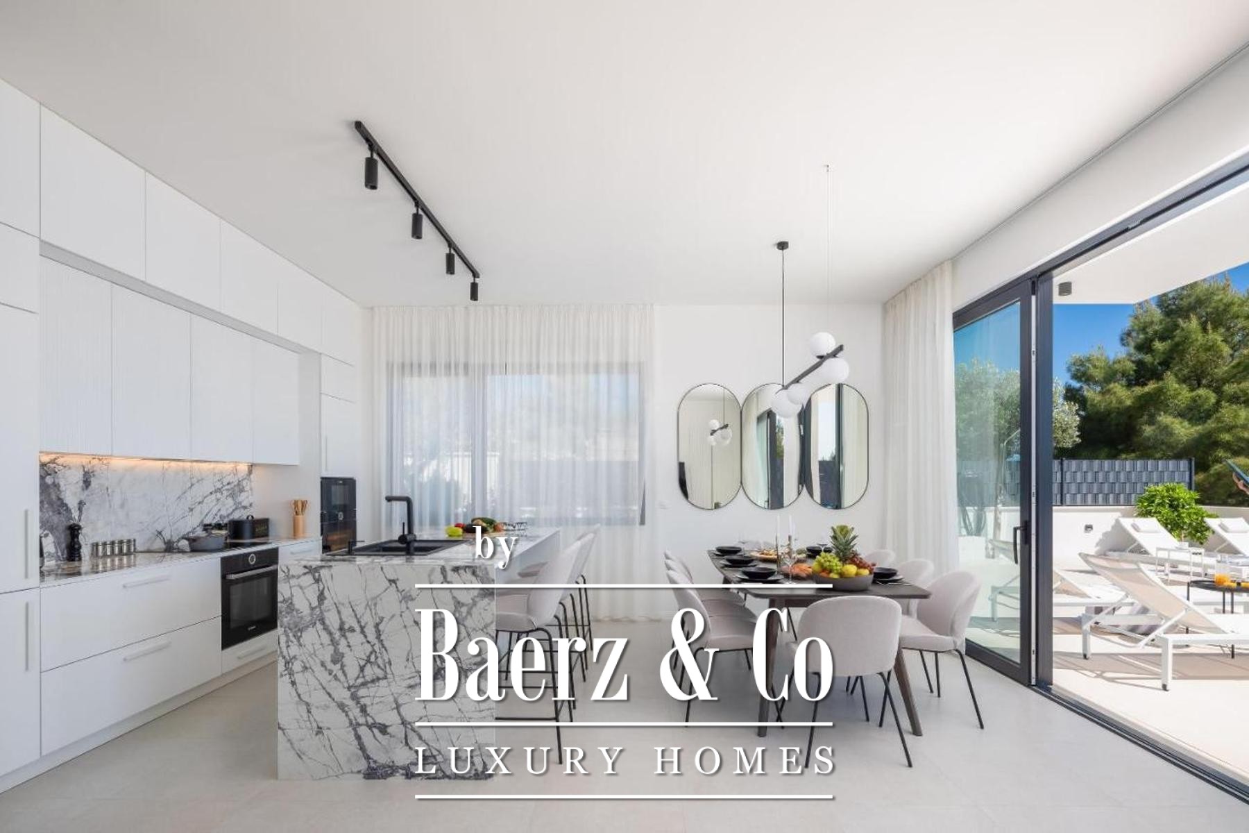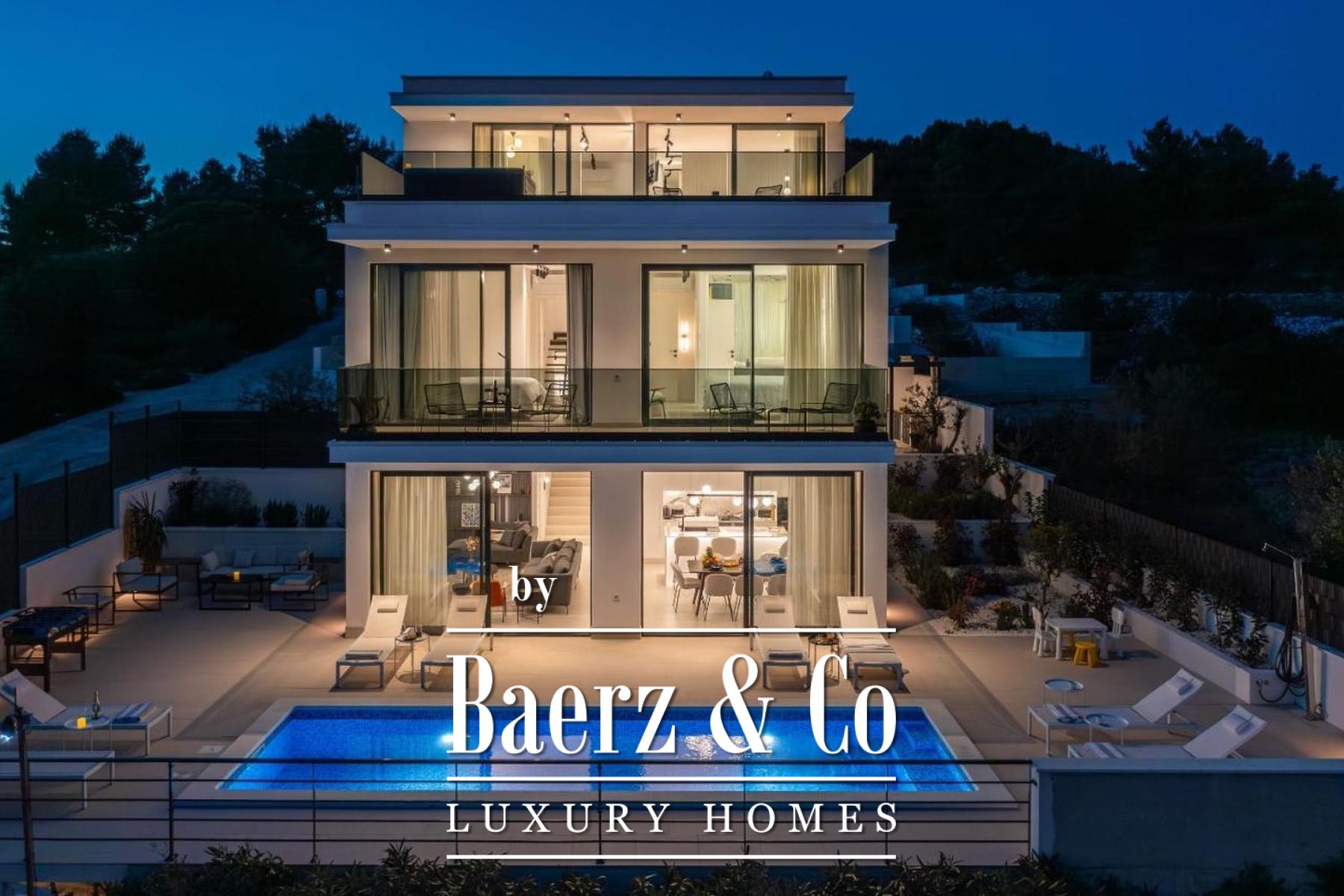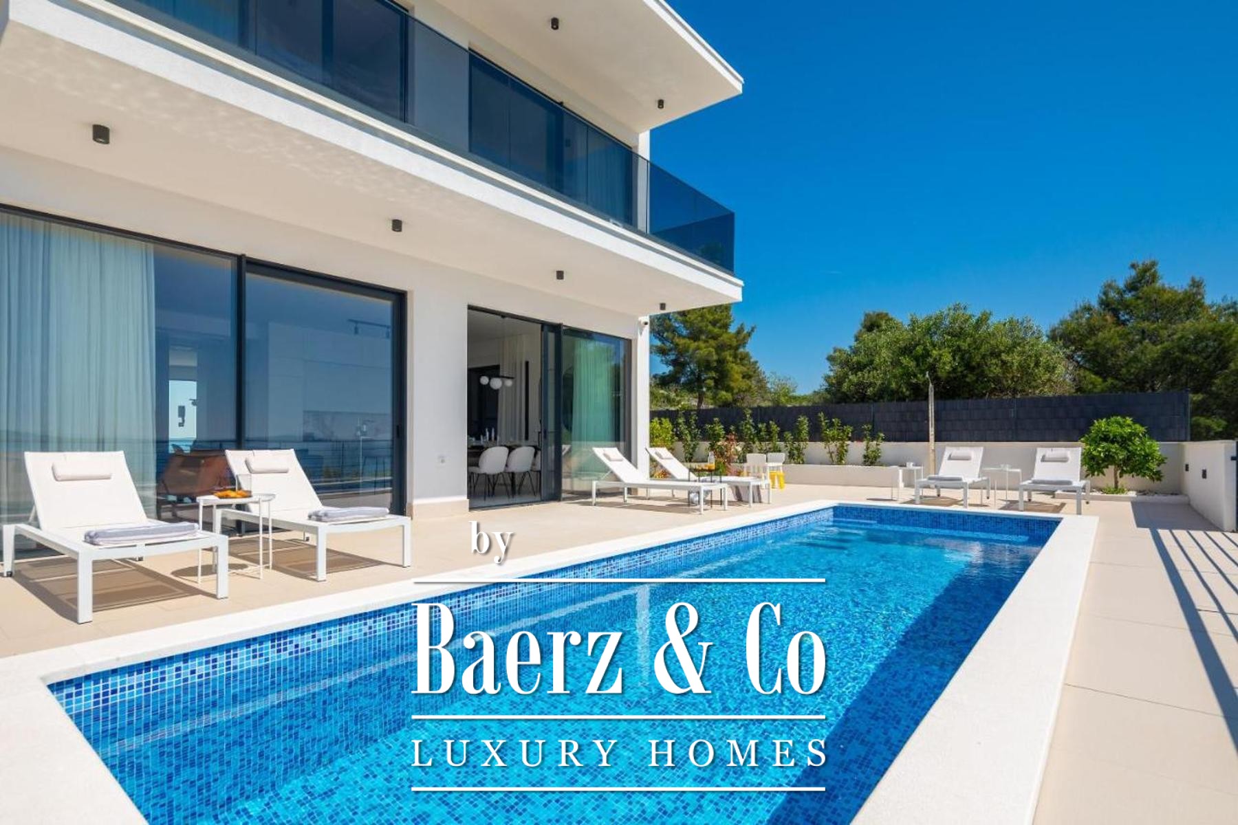 Villa Okrug is a modern villa in Croatia, standing just moments from the sea on the tranquil south side of the Island of Ciovo. This newly built property spans 270 m² across three thoughtfully designed floors, each level orchestrating a sense of calm and privacy. The ground floor features a hall, an open kitchen flowing into dining and living zones, a bedroom with en suite, a gym, and access to a generous sun terrace with a swimming pool and sundeck. Outdoor living is enriched with a fully equipped summer kitchen, barbecue, and shaded dining area for gatherings under the sky.